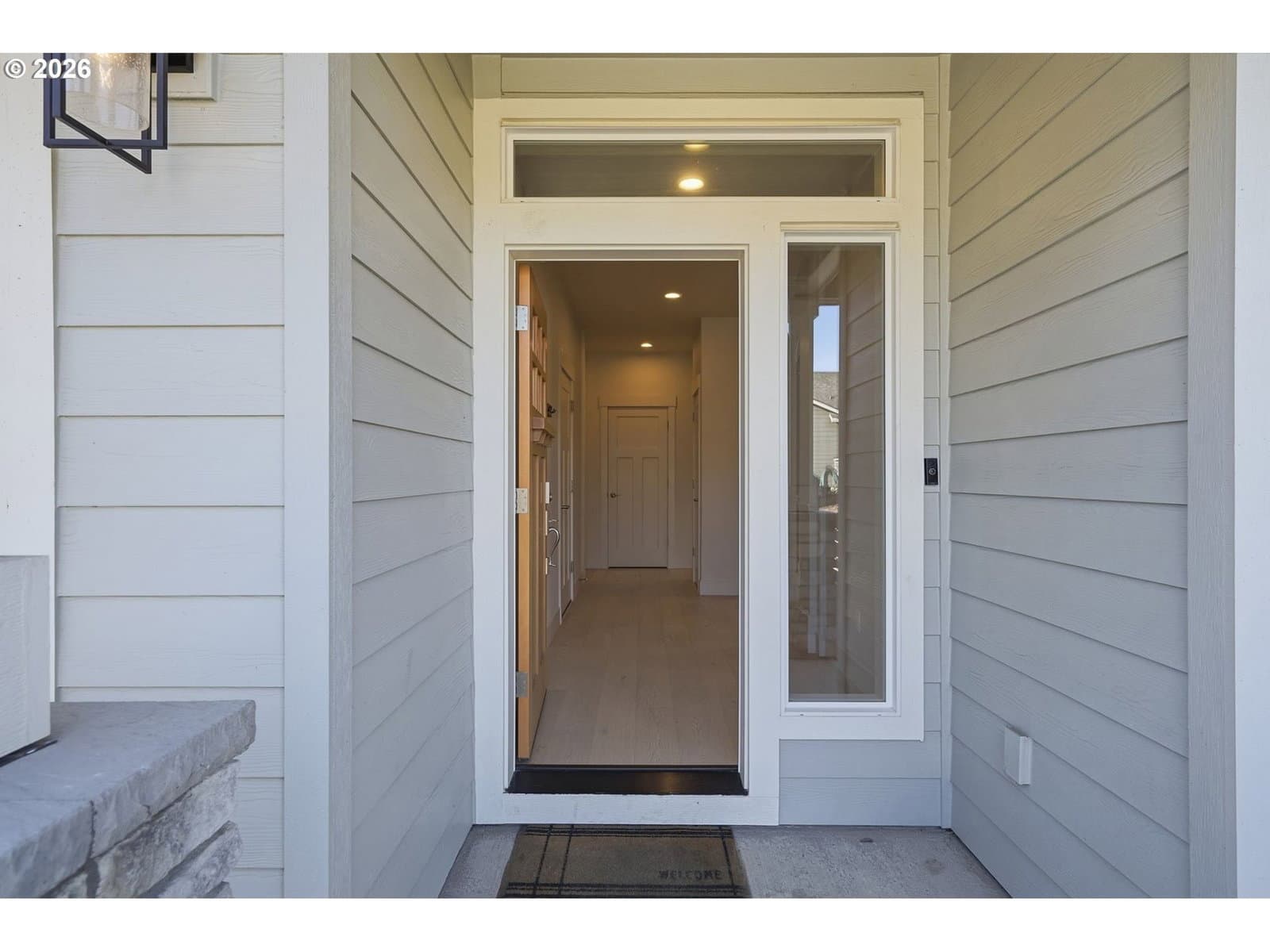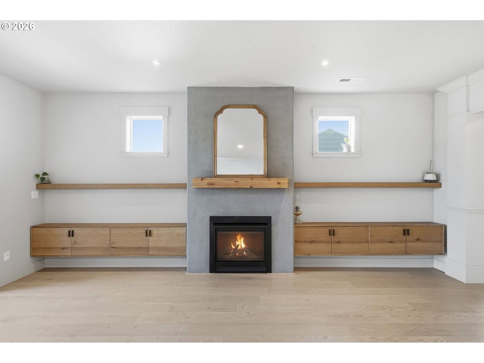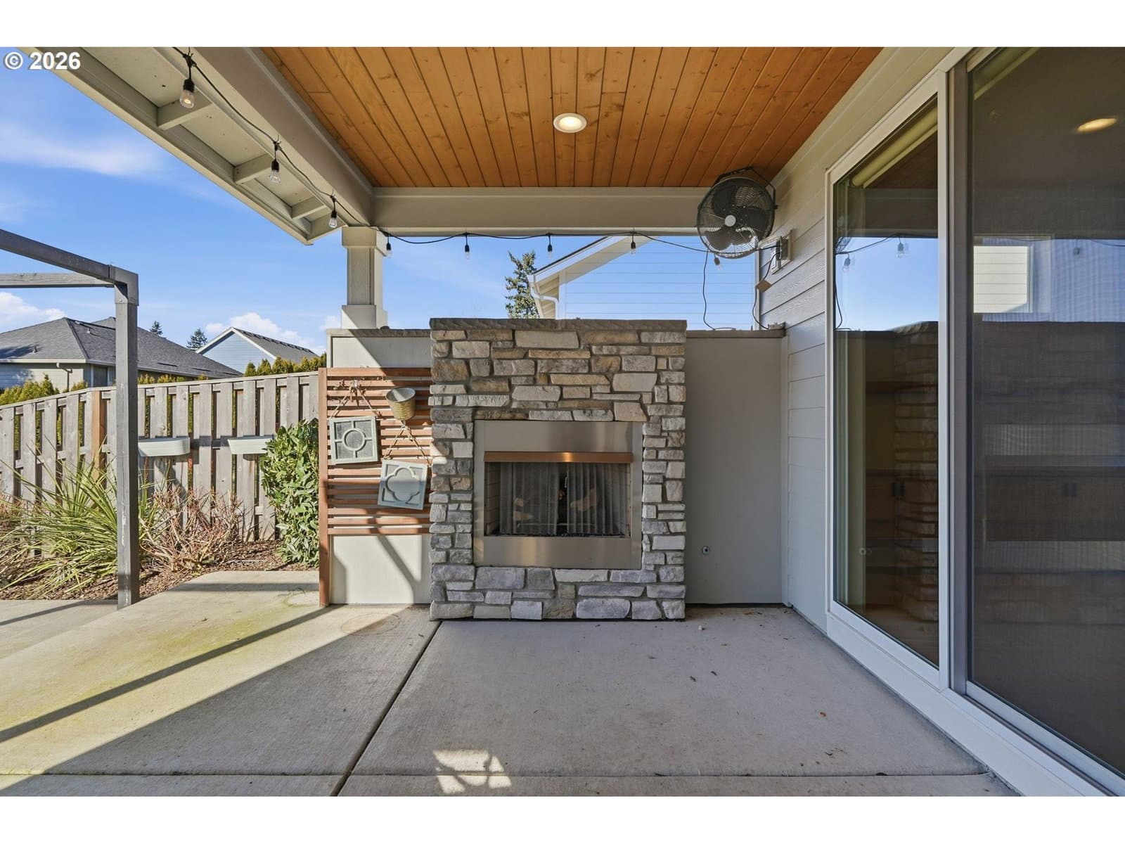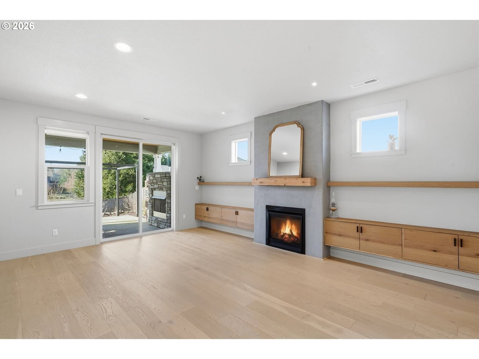 Thoughtfully designed single-level ranch built in 2020 with beautiful finishes throughout. No HOA, and tucked into a small, established neighborhood with no through traffic! The open-concept living space is bright and refined, featuring wide-plank flooring, custom built-ins, and a sleek gas fireplace that anchors the room without overpowering it. The kitchen is both stylish and functional with quartz countertops, stainless appliances, a gas range, and ample counter space with peninsula seating for everyday use. The primary suite is spacious and privately positioned, offering direct access to the covered patio through a separate exterior door, along with an ensuite bath and walk-in closet. Outdoor living shines with a covered patio and beautifully finished stone gas fireplace, creating a seamless extension of the interior living space. An added concrete pad beyond the covered patio provides extra room for entertaining and outdoor gatherings. Beyond the patio, a permanent landscaped greenbelt / water retention area provides lasting privacy and an open, natural backdrop—no rear neighbors, just space and calm. Modern construction, single-level convenience, refined finishes, and a rare private setting combine to make this home a standout! Conveniently located near everyday shopping, major highways, and Portland Airport for easy commuting and travel.