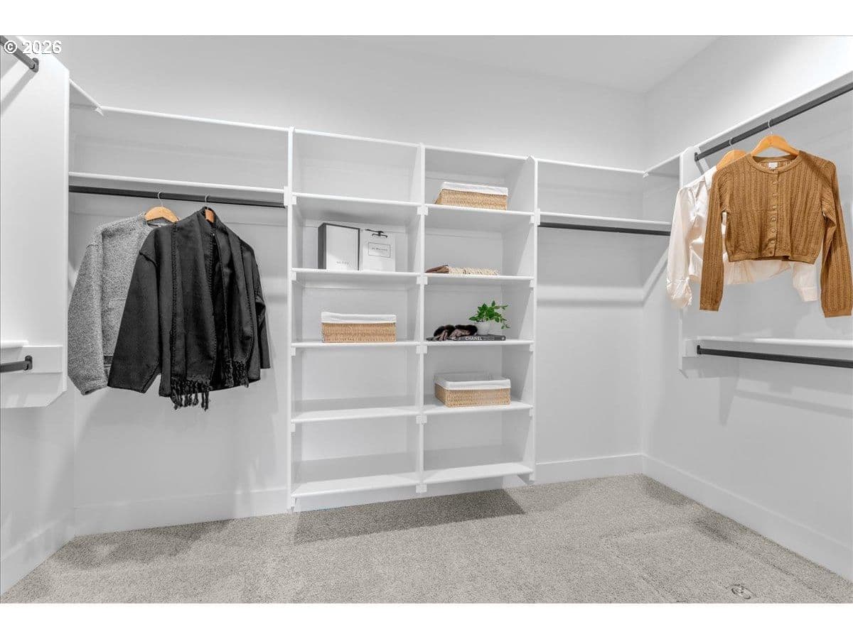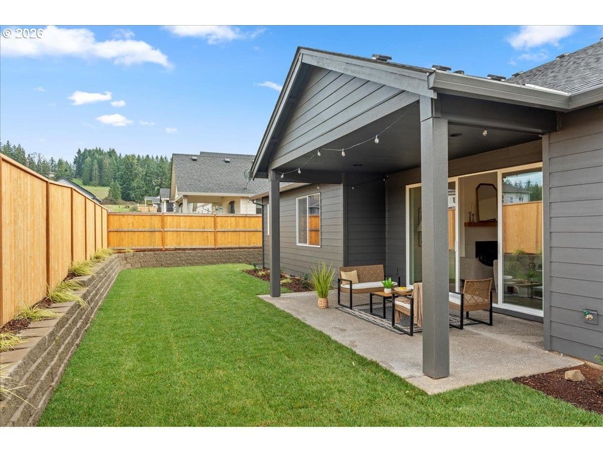 New single-story Modern Northwest home with warm natural finishes and a backdrop of open space. Clean exterior lines with natural wood and metal accents, landscaped grounds, and a fenced backyard. Interior offers warm wood shaker lower cabinets with brass hardware, quartz slab countertops, brass hammered pendant lighting, a butler pantry, and a flexible range setup for gas or electric (gas range included). The living room features a fluted stone style fireplace, vaulted ceilings, and large sliding doors opening to a covered patio with built-in ambiance lighting. The spa-inspired primary suite showcases a floor-to-ceiling glass waterfall shower with a vertical wood-tone fluted wall, soaking tub, and dual sinks. Short walk to the community park. Bonus parking, home fire sprinkler system, and a 1-year builder’s warranty included.