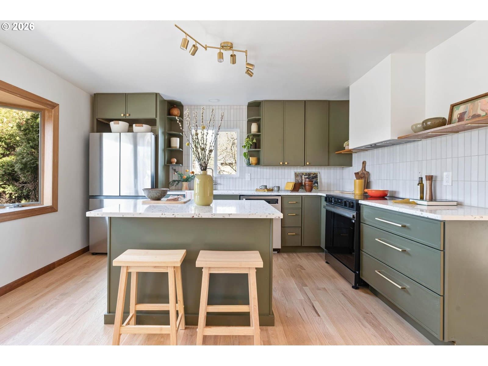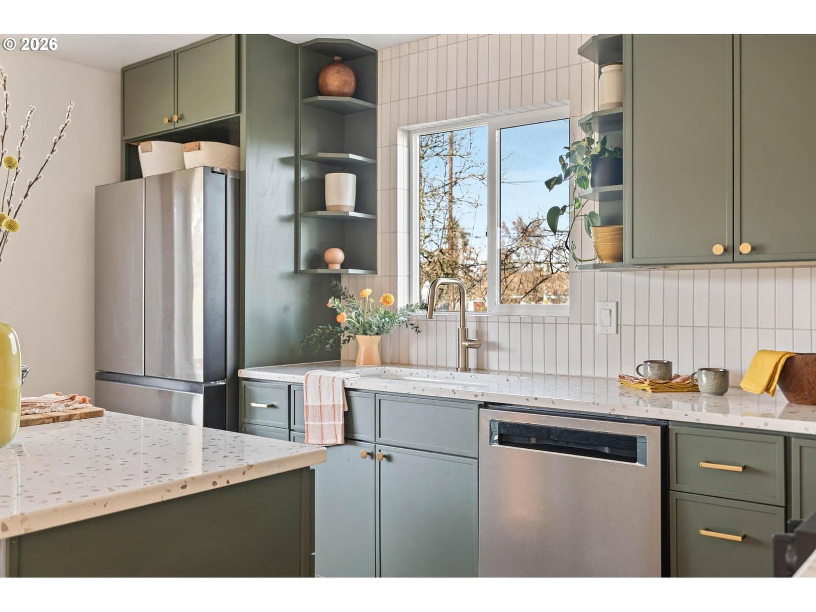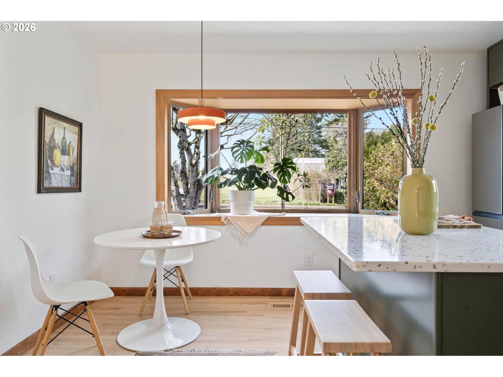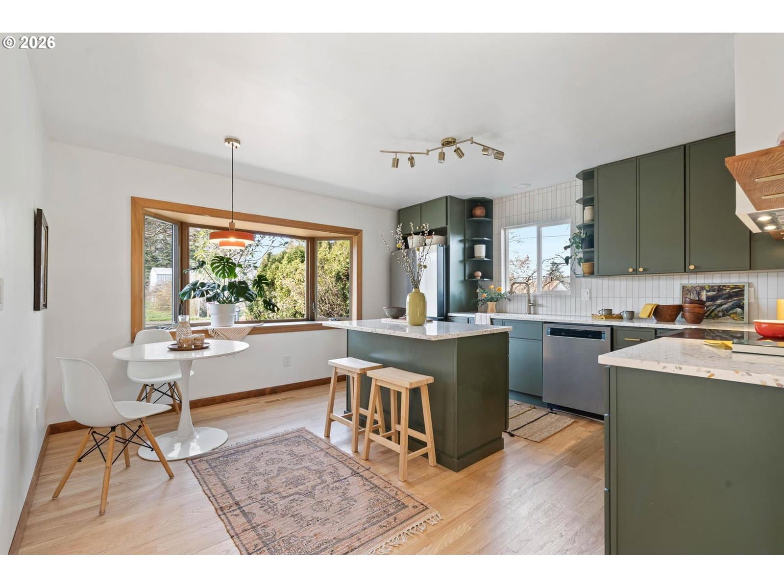 Stepping into this Mid-Century modern sanctuary, the outside world simply falls away. The heart of the home is a dramatic, wood-paneled living room featuring soaring vaulted ceilings and floor-to-ceiling glass that frames a private, soothing oasis. Whether you are an introvert seeking a quiet retreat by the courtyard fountain or an extrovert who lives for seamless indoor-outdoor entertaining, the social layout and fresh landscaping create a perfect harmony. It is a home that feels both expansive and deeply intimate—a rare world of your own in the heart of Concordia.Thoughtfully remodeled to honor its original character, this residence shines with a mix of new and meticulously refinished original hardwood floors. The chic designer kitchen gives a hint to mid-century with modern day function, while the rear of the home offers three quiet bedrooms and two updated baths. The lower level adds a surprising layer of versatility with a cozy lounge for movie/game nights, a dedicated workshop, and a spacious laundry/bonus room. Complete with a two-car garage connected by a classic covered breezeway, this home is a stunning example of mid-century livability and style. [Home Energy Score = 3. HES Report at https://rpt.greenbuildingregistry.com/hes/OR10242812]