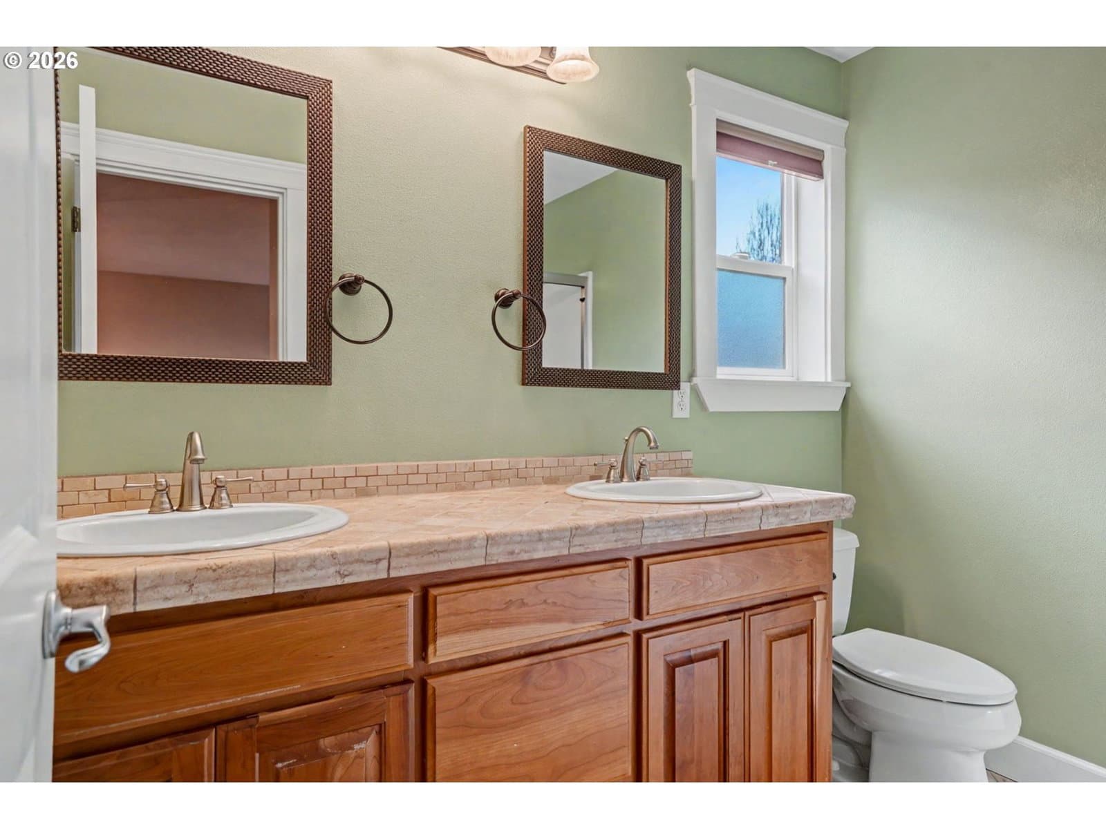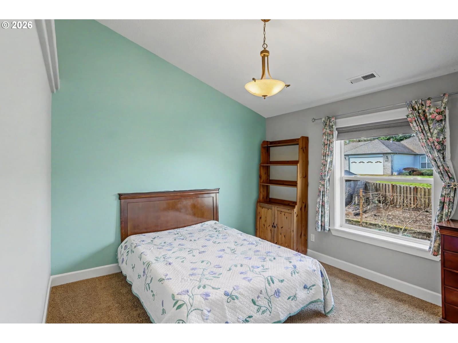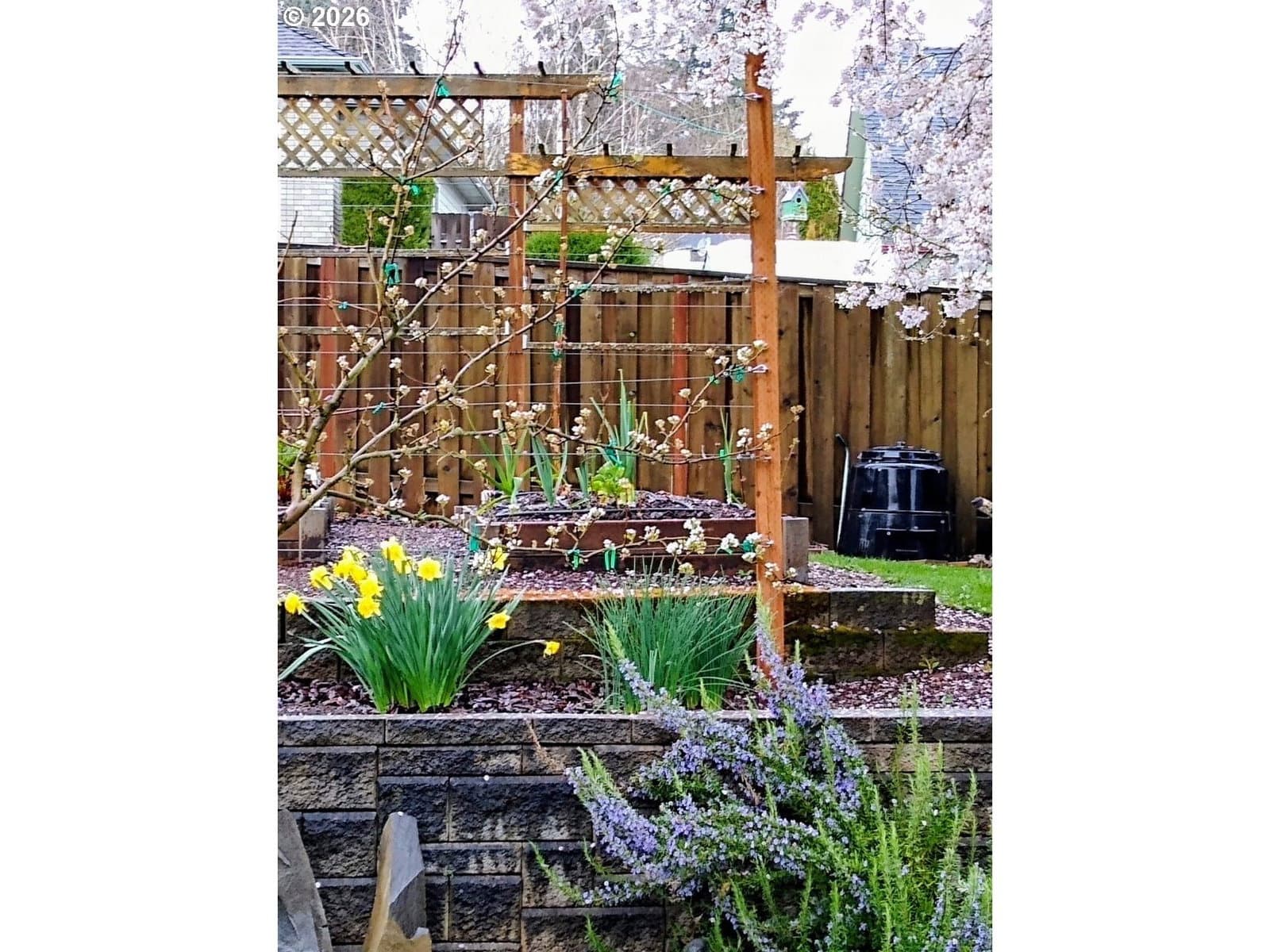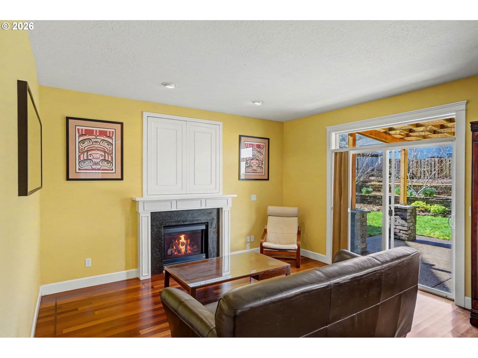Well-maintained and very energy efficient 4 bed, 2.5 bath home offering 2,627 SF on a quiet cul-de-sac. Flexible layout includes a main floor bedroom, formal living & dining rooms, and both living and family rooms, each with gas fireplaces. Light-filled nook off the gourmet kitchen featuring granite countertops, cherry cabinetry, stainless Frigidaire appliances, and a walk-in pantry. Cherry cabinets continue throughout the bathrooms and laundry room for a cohesive, high-quality finish. Hardwood flooring on the main level. Spacious bonus room provides ideal space for media, office, or playroom. Primary suite features a walk-in closet, jetted tub, walk-in shower, and vaulted sitting/retreat area. Dual heating and cooling systems provide efficient comfort year-round. Central vacuum and central speakers included. The backyard is a true highlight with seven raised garden beds, fruit trees, grapevines, and abundant flowering plants, all within a fully fenced and beautifully landscaped setting. Covered patio, sprinklers, garden shed, and plenty of space to relax or entertain.
