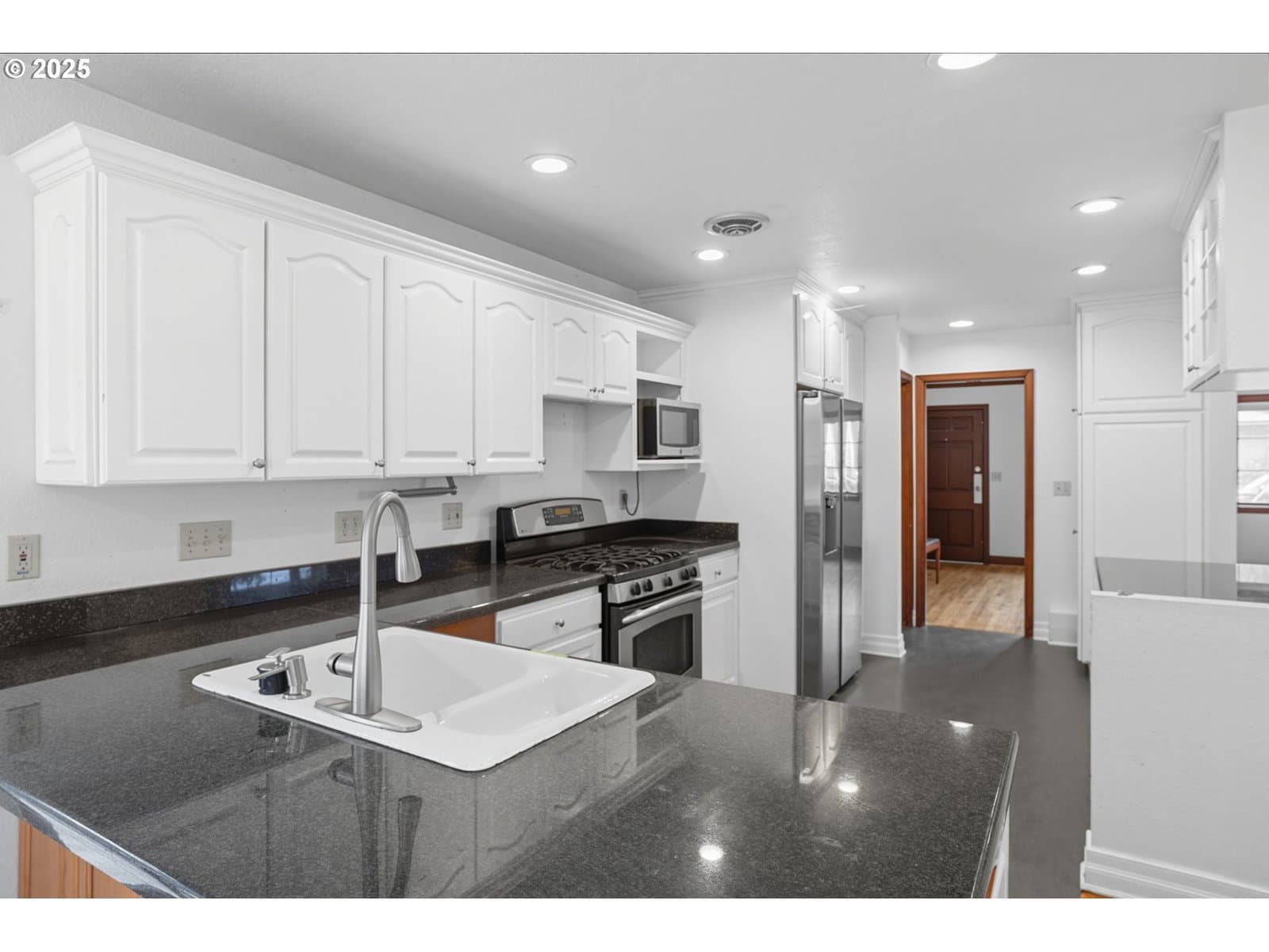 BOM - no fault of house. Buyer couldn't obtain financing. Spacious and functional, but full of charm and possibilities, this Raleigh Park home is tucked away on a quiet, tree-lined street just minutes from city living. Offering four bedrooms with the possibility of a fifth, three full bathrooms, and more than 2,300 square feet, it beautifully blends mid-century character with some modern updates. The main level features formal living and dining rooms with gleaming hardwood floors, a kitchen with granite counters, stainless steel appliances, pantry, and eating bar, plus a sunny breakfast nook with a bay window. Sliding doors open to a private fenced backyard with a multi-level patio, perfect for entertaining or enjoying peaceful mornings beneath the trees. The primary suite is thoughtfully tucked to the rear of the home, overlooking the backyard and complete with a full bath. The lower level offers a generous recreation room with a wood stove and a versatile den with a separate entrance - ideal as a fifth bedroom, craft room, office, or even ADU potential - along with a full bathroom, creating flexible living options. Upstairs are three additional bedrooms with hardwood floors and another full bath. An oversized two-car garage provides excellent storage or workshop space. Set on a 0.28-acre lot with mature trees, a level yard, and wonderful curb appeal, this home also includes forced air heat and central air conditioning for year-round comfort. Located just minutes from Raleigh Park Elementary, Whitford Middle, Beaverton High, shopping, dining, and Beaverton-Hillsdale Highway, it’s a rare opportunity to own a flexible floor plan in one of Portland’s most desirable westside communities.