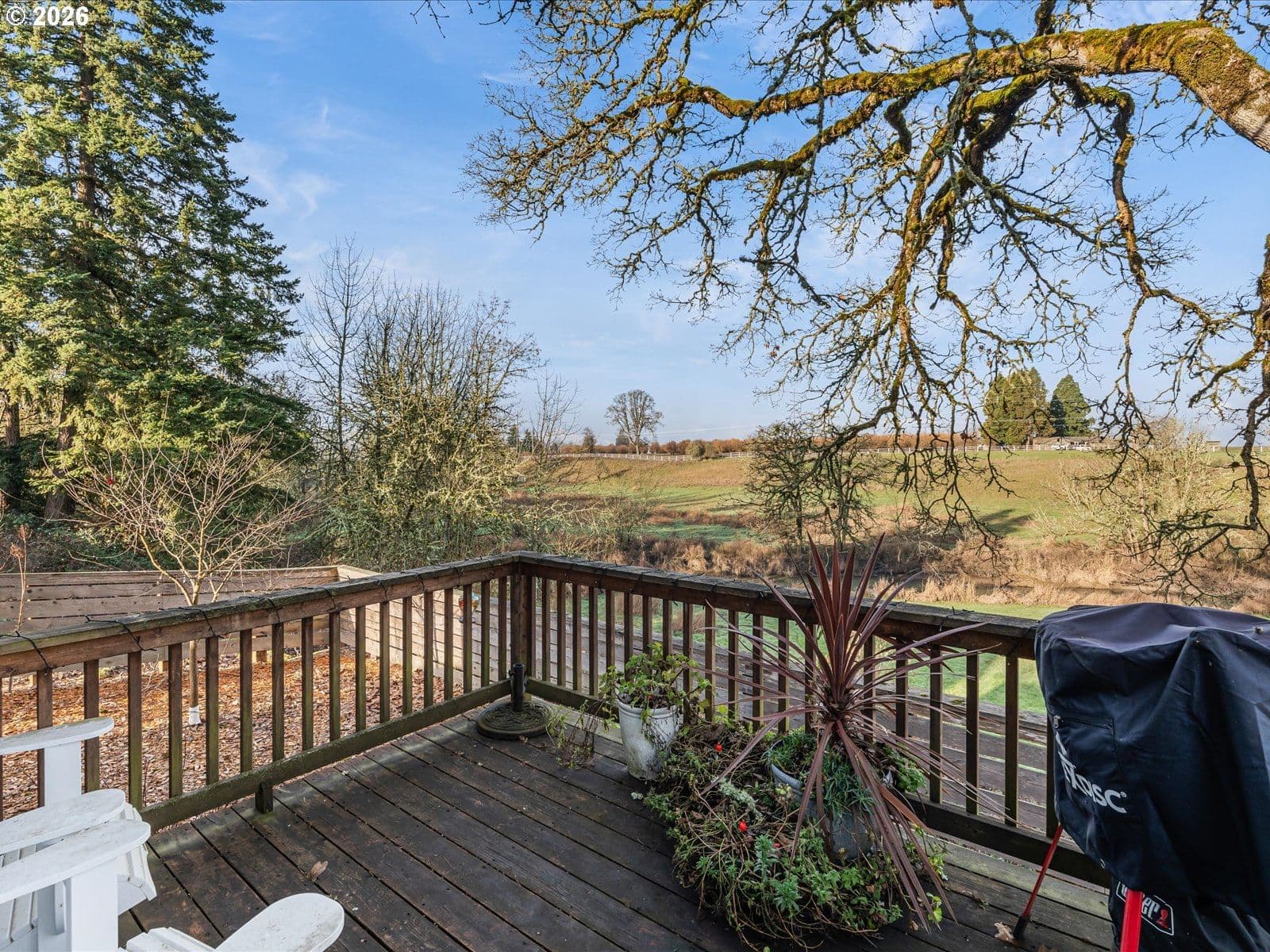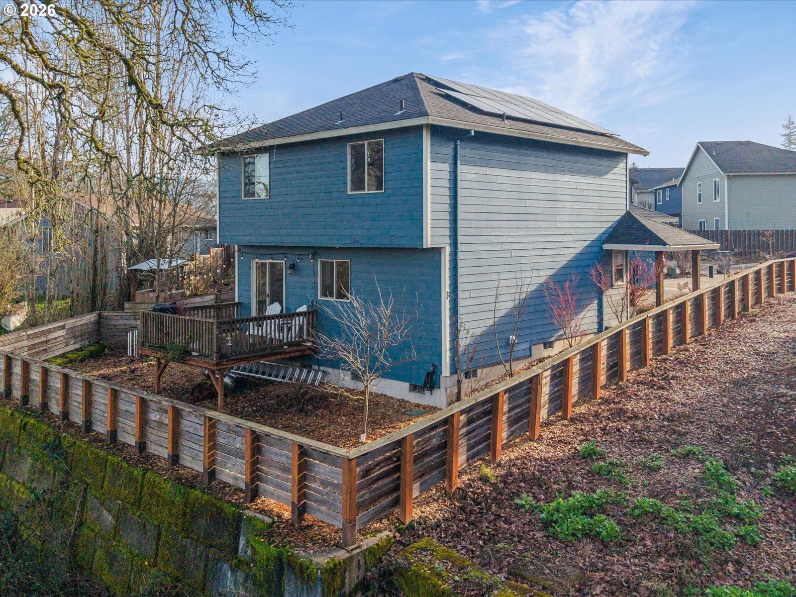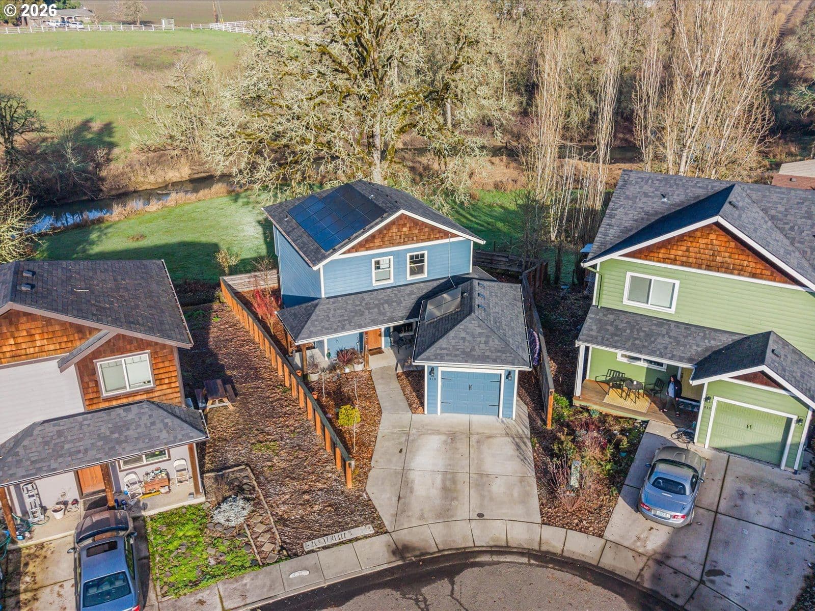 Situated in a quiet cul-de-sac abutting a park, this recently built two story home boasts an open layout and a wonderful view of the creek and countryside from the kitchen and back deck. The solar power system (only 3 years old) and the power-out generator plug-in are great plusses! Living room, dining area and kitchen flow together nicely on the ground floor. A pantry/laundry walk-in space off the kitchen is very practical, as is the storage space under the stairs and the half bathroom. On the upper floor the 3 bedrooms and 2 full bathrooms are well laid out, with some offering the countryside and creek view as well. The detached one-car garage connected by a breezeway and the fully fenced backyard complete this must-see property.