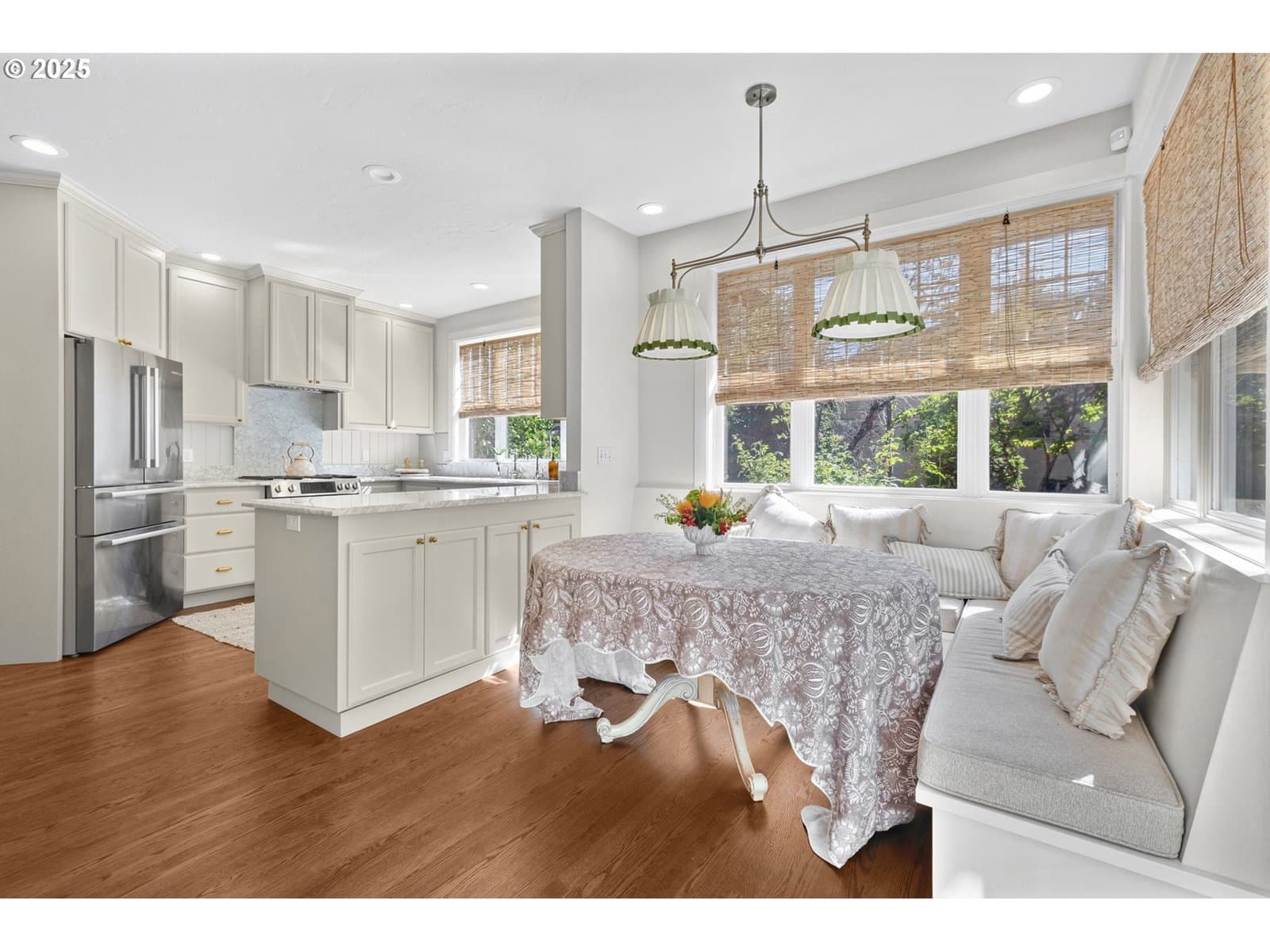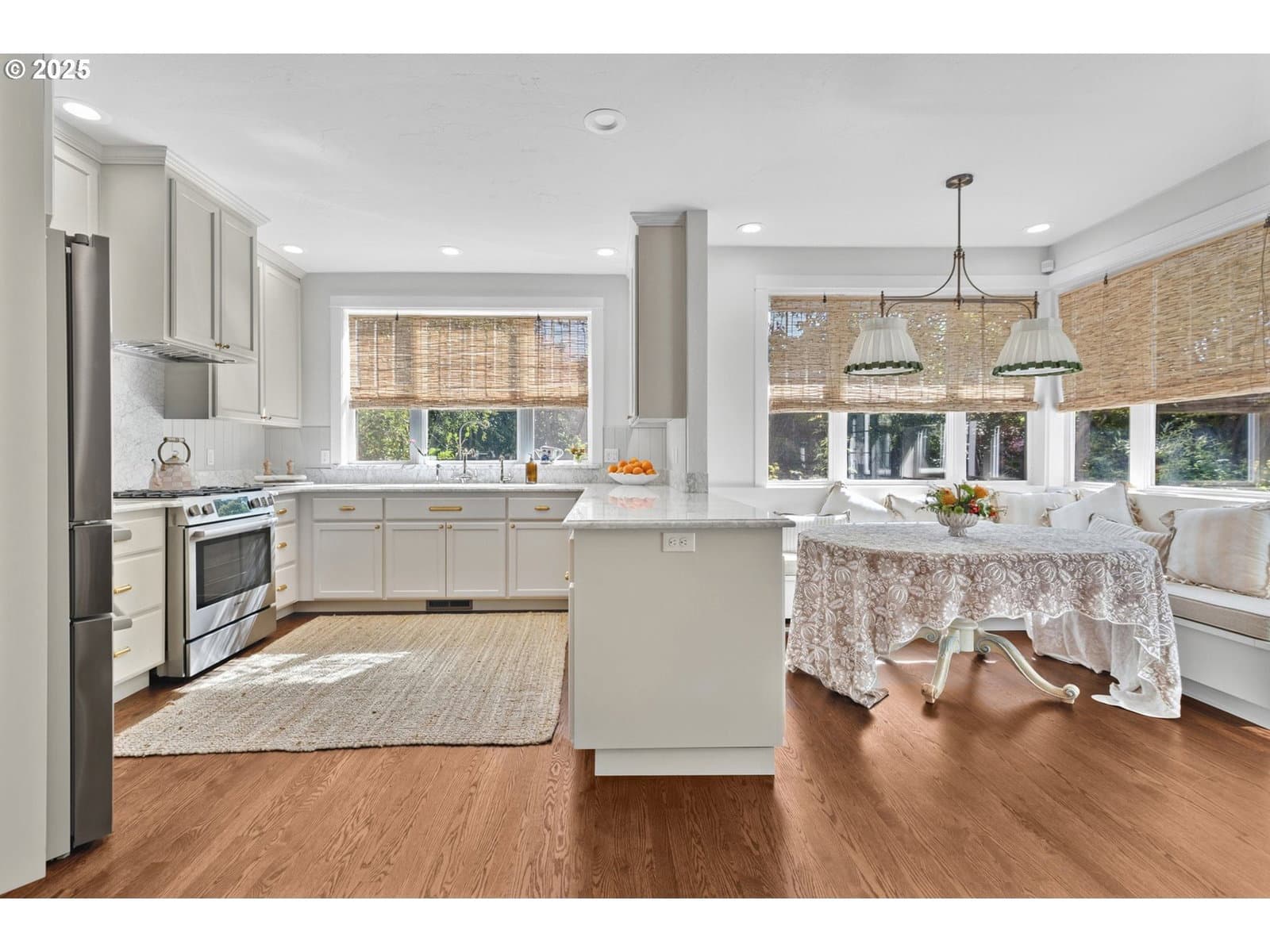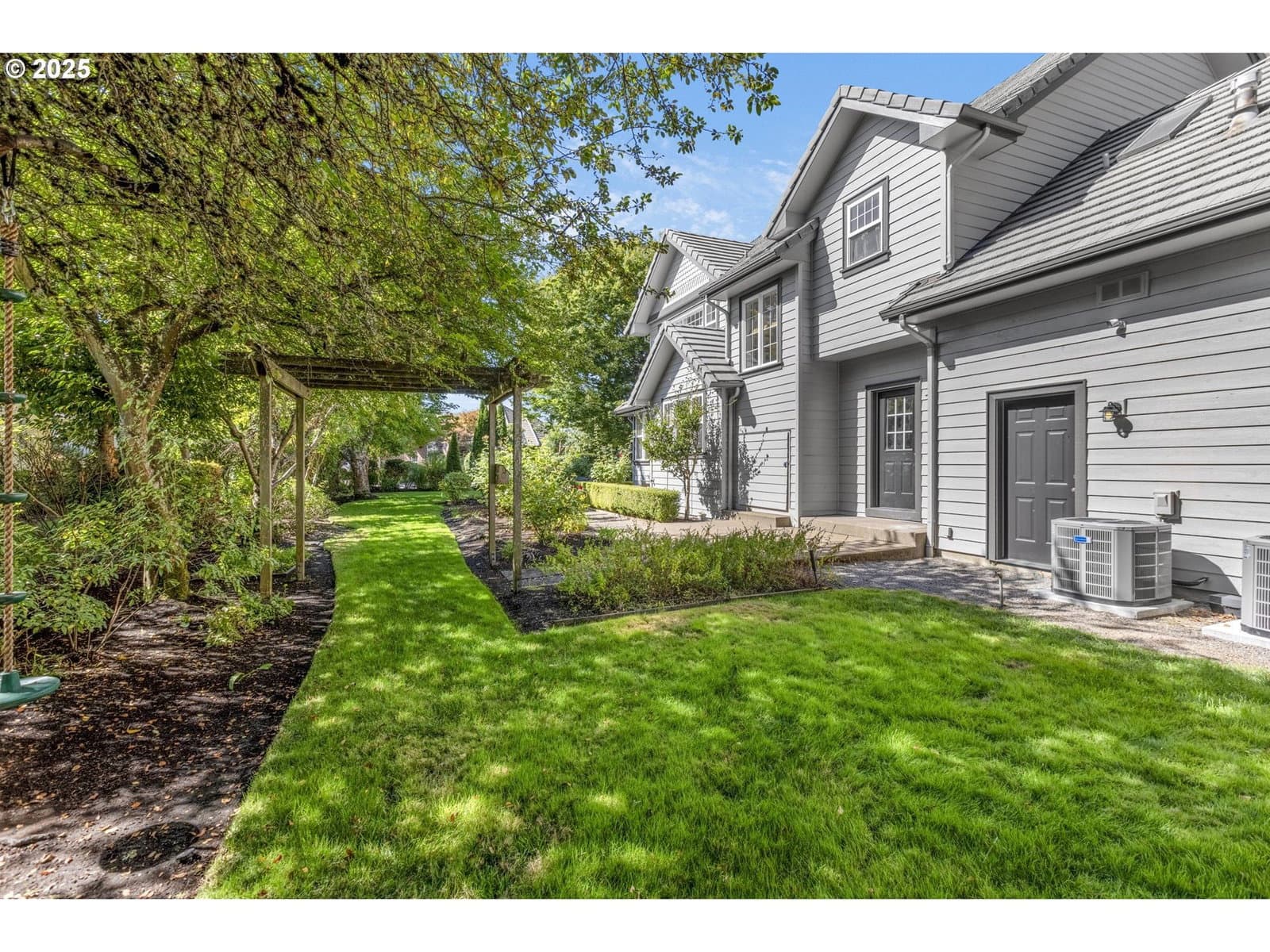 Luxury Home, Corner Lot in Sought-After Riverwalk Neighborhood of Valley River Village. Nestled in a quiet cul-de-sac near scenic bike paths along the Willamette River, this beautifully updated 4-bedroom + bonus/den home offers comfort, convenience, and natural beauty. Ideal location just minutes from schools, shopping, and parks! Step inside to a thoughtfully designed floor plan featuring, tall ceilings, a light-filled living area with a cozy double-sided gas fireplace that connects to the kitchen—perfect for cool mornings and gatherings. The high end full Kitchen remodel was top to bottom with new and updated flooring throughout the house. An updated gourmet kitchen that boasts marble countertops, stainless steel Bosch gas appliances, a wet bar, and both a casual eating nook with exterior access and a formal dining space. Upstairs, a bonus room with charming bay window provides flexible space for a den, playroom, or office. A second bay window on the mid-stair landing offers lovely outdoor views. The spacious owner’s suite features dual walk-in closets, dual vanities, soaking tub, and tiled shower—your personal retreat. Main-level laundry includes built-in storage, utility sink, and outdoor access for added convenience. Step outside into a large, professionally designed garden oasis—cultivated by a master gardener with an eye for year-round color. Dual HVAC system replaced in 2024 with high efficiency system for comfort, Fencing allowance available with acceptible offer.