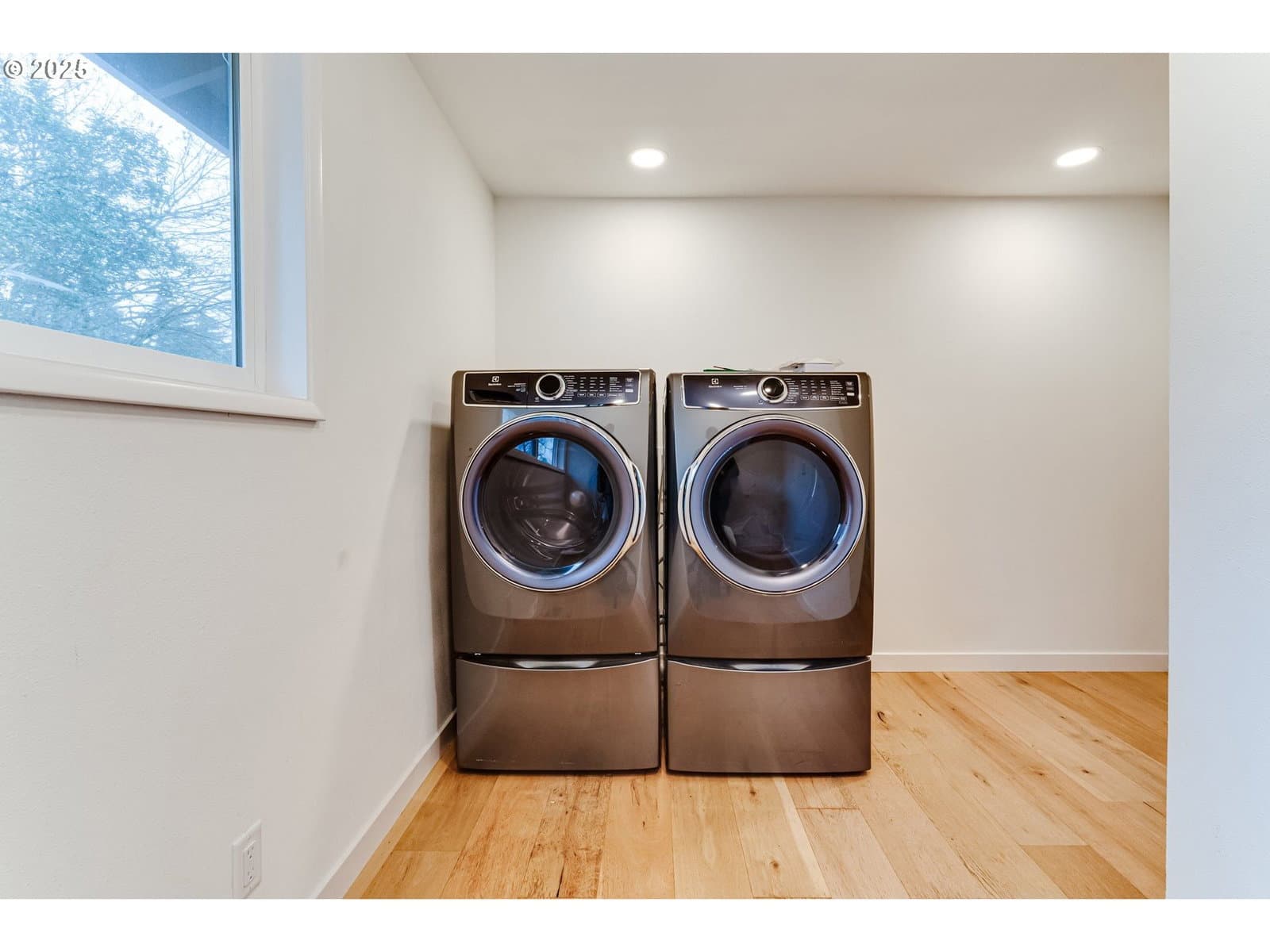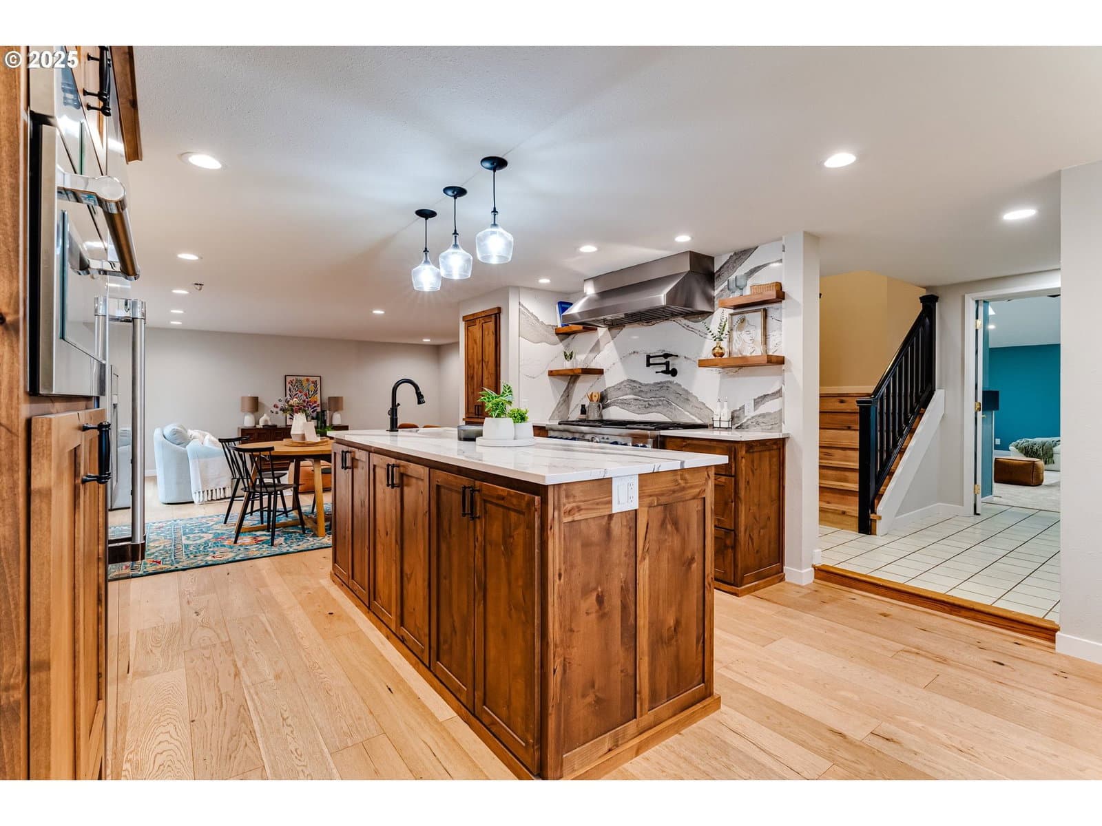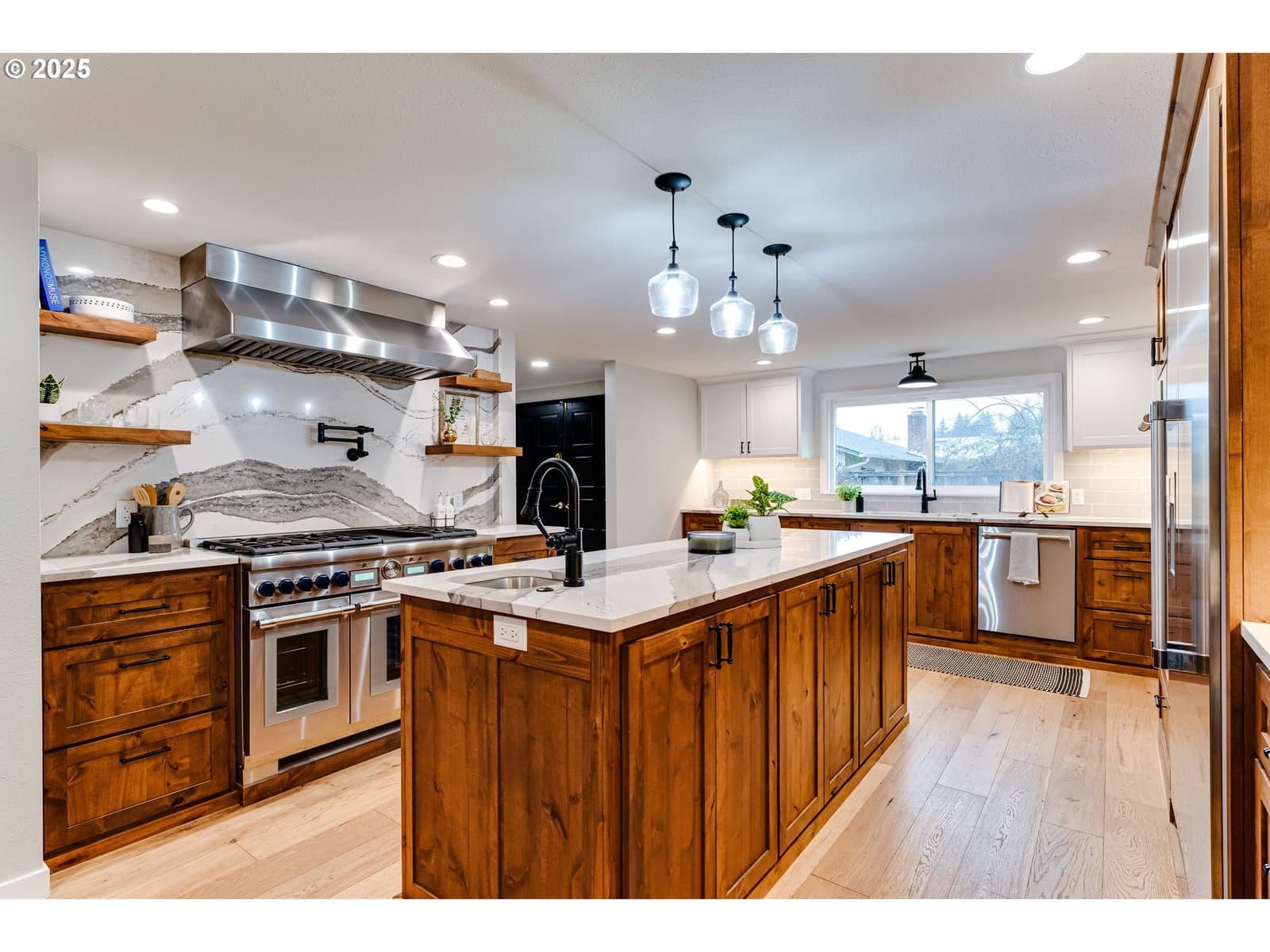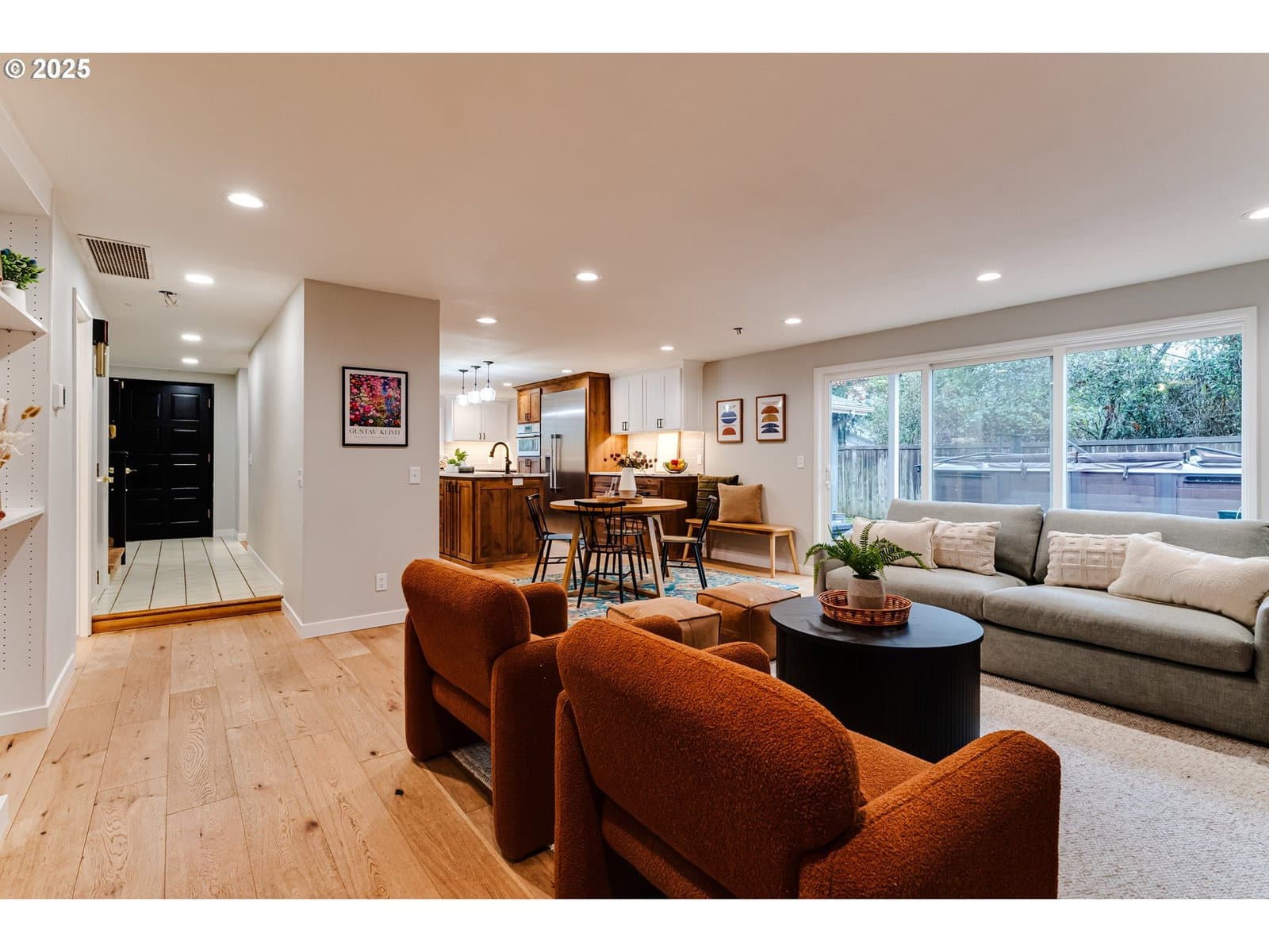 Superb updated North Gilham home featuring a designer-finish remodeled kitchen, a spacious and functional floor plan with a vaulted formal living room, gas fireplace, skylights, plus a second living room and dining space! Enjoy new recessed lighting, interior paint, light fixtures, engineered hardwood flooring, and carpet throughout. The entryway tile has been refreshed with new grout stain and sealant. The spacious, NEW kitchen includes brand-new alder cabinetry, stainless steel Thermador appliances, a 6-burner gas range, stunning quartz countertops, a large island with sink, wine fridge, and ample storage. The cozy family room is adjacent to the kitchen and offers direct access to the charming brick patio and large, private fenced backyard. Upstairs, the primary suite boasts dual closets, a walk-in shower, convenient attic storage access, and a flex room that also functions as an extra laundry room for added convenience. The 4th main level bedroom functioned perfectly also as a guest room and office. Additional highlights include a newer gas furnace and A/C, ensuring year-round comfort!