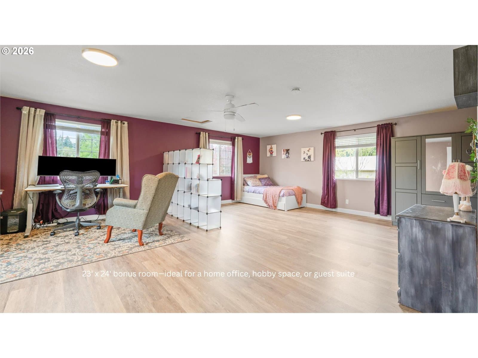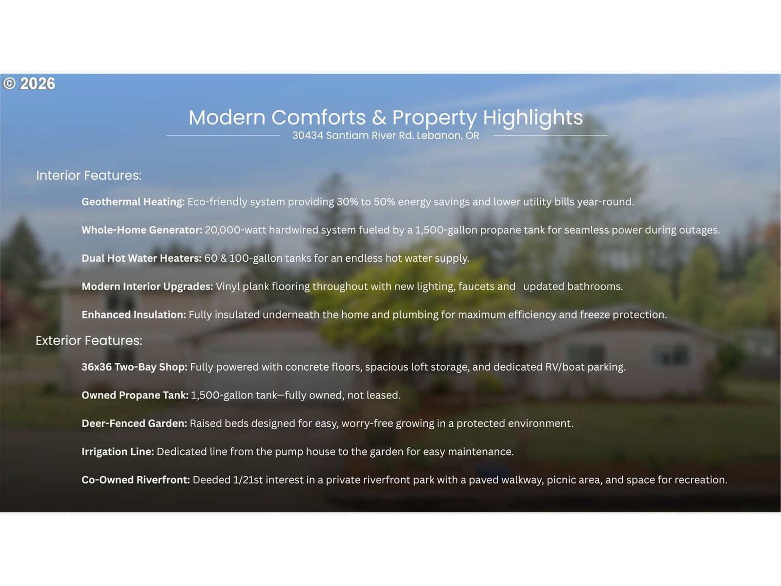 Enjoy a peaceful, park-like setting on 3.33 level acres. This well-maintained estate features a deeded interest in an exclusive South Santiam Riverfront park, located just steps from your front door. The beautifully updated 2,964 sq. ft. residence offers a modern 4-bed, 3-bath layout, including a spacious bonus room and family room. High-tech infrastructure meets total peace of mind with eco-friendly geothermal heating (30-50% energy savings), a 20,000-watt hardwired generator, and a fully owned 1,500-gallon propane tank. Outside, the property offers versatility with a 36x36 two-bay shop with loft storage and space for an RV, boat or other toys, alongside a deer-fenced garden with dedicated irrigation. From the modern interior to the water’s edge, this high-efficiency property offers a rare combination of space, utility, and river access—truly designed for those who want it all. Schedule your private showing today!