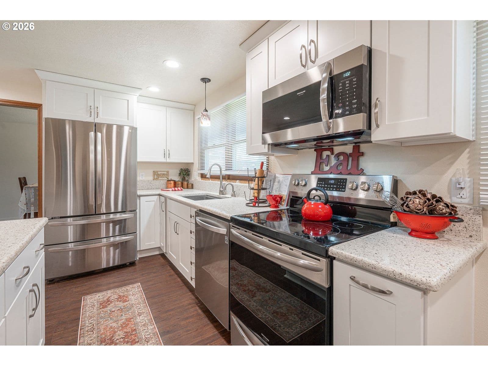 Spacious and beautifully maintained family home featuring 5 bedrooms and 3.5 bathrooms, ideal for comfortable living. The property includes a versatile ADU/mother-in-law suite, perfect for extended family or rental potential. The updated kitchen boasts custom cabinetry, quartz countertops, stainless steel appliances, and a modern sink, complemented by newer laminate flooring throughout. Enjoy fresh interior paint downstairs, brand-new carpet, multiple living spaces, and a large fenced backyard perfect for entertaining or relaxing.