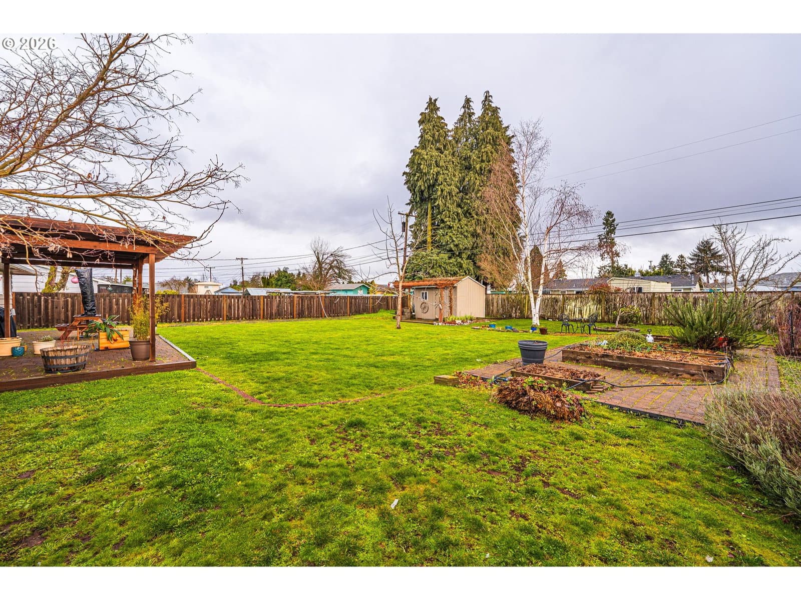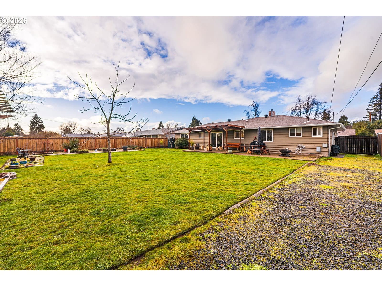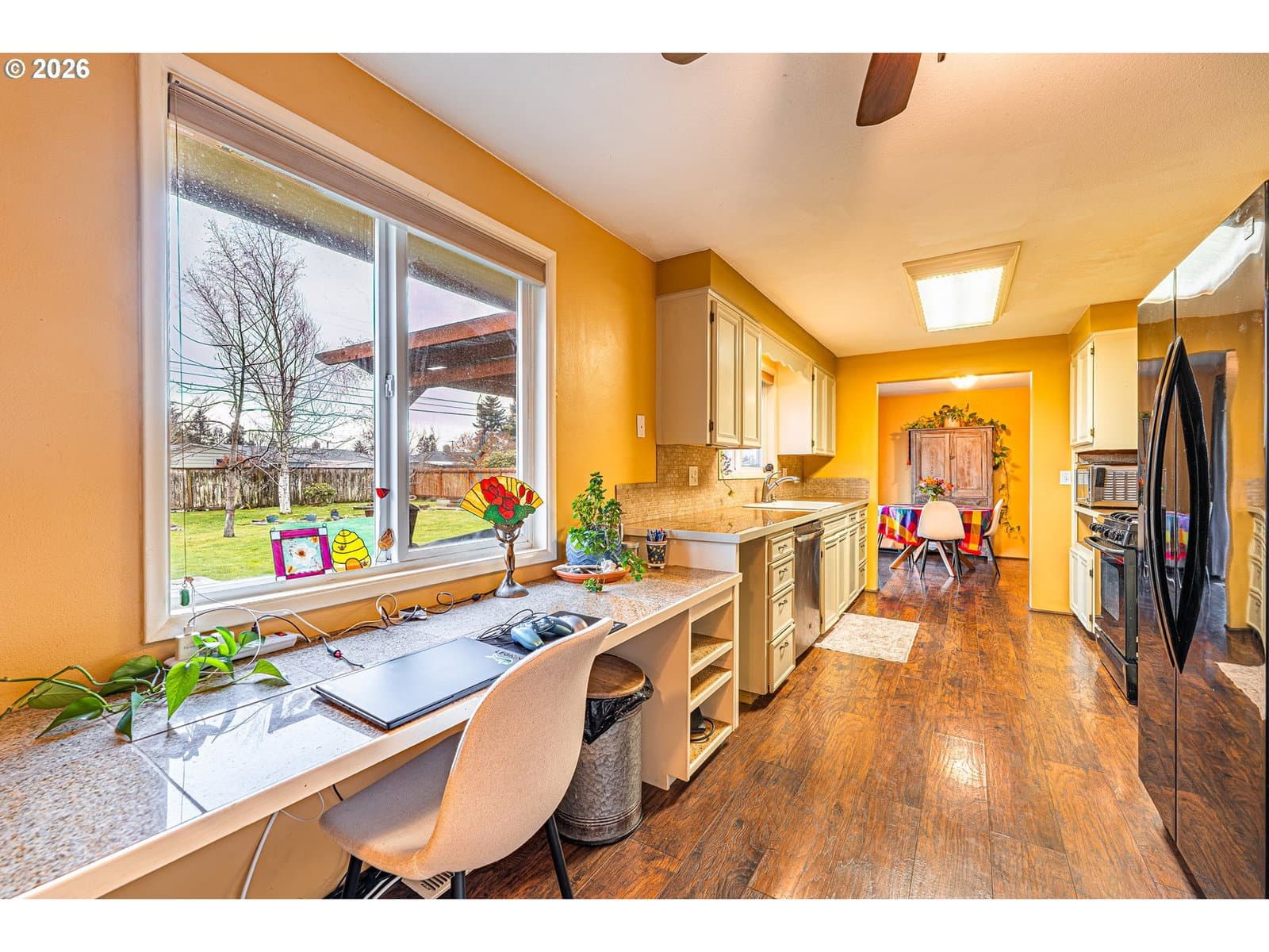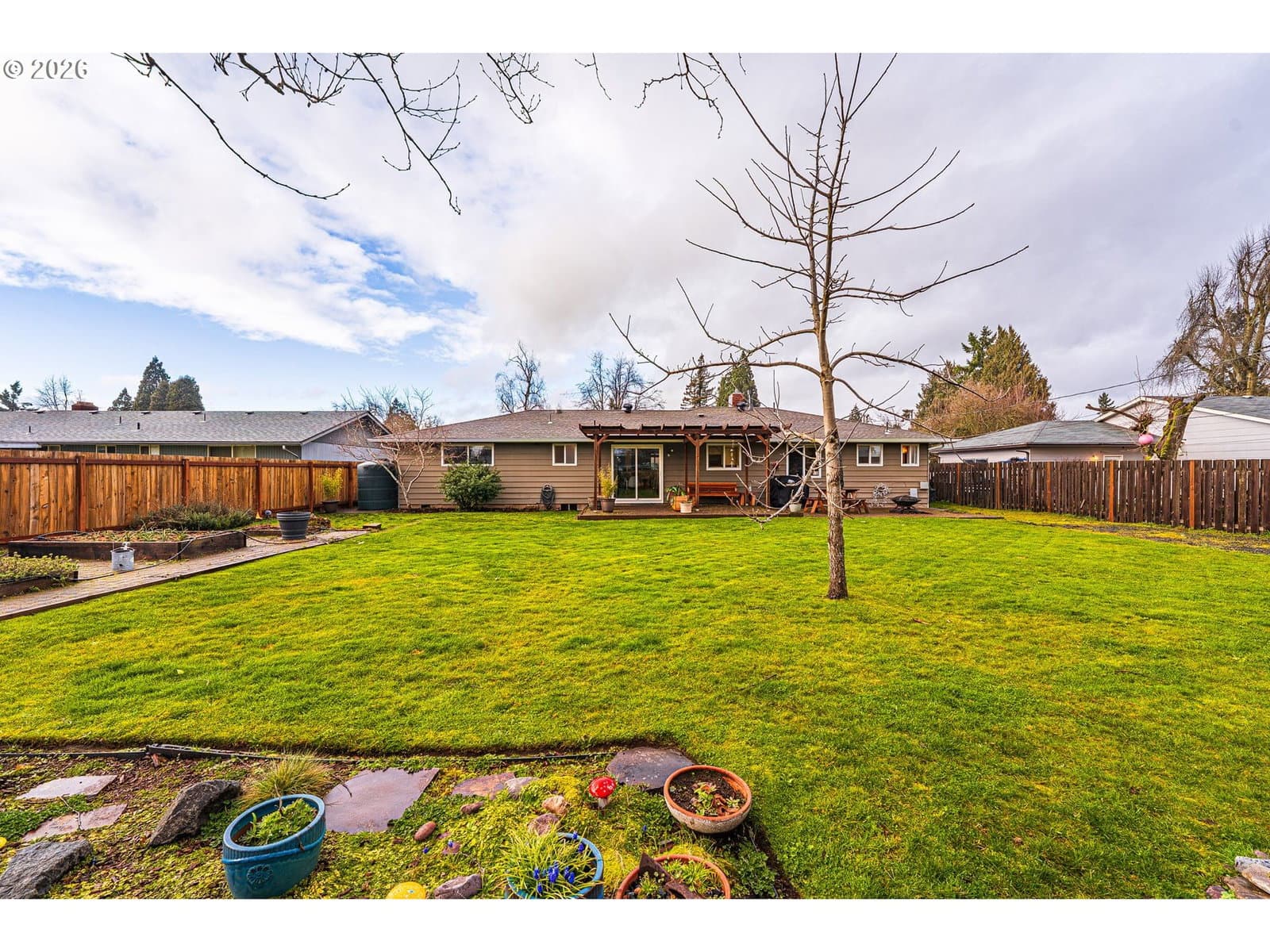 This thoughtfully updated 3-bedroom, 2-bath rancher blends classic comfort with modern refinement. A brand-new roof, gutters, and HVAC system provide peace of mind, while real hardwood floors—complemented by LVP and tile—add warmth and durability throughout. The gas fireplace anchors the living space, creating an inviting place to unwind. The spacious galley kitchen features tasteful updates and is enhanced by a bonus flex space—ideal for a home office, dedicated meal prep area, or additional storage—adding both functionality and versatility to the home. Vinyl windows and updated fixtures throughout reflect a property that’s been carefully maintained, not merely refreshed. Step outside to a generously sized yard designed to be enjoyed. The fully fenced backyard includes mature landscaping, fruit trees, garden beds with a drip irrigation system hooked up to both city water and a rainwater catchment system, a tool shed, and a covered paved patio that effortlessly extends the living space outdoors—perfect for entertaining or quiet moments at home.Smart updates, timeless finishes, and meticulous care come together in a home that truly delivers on comfort, quality, and livability.