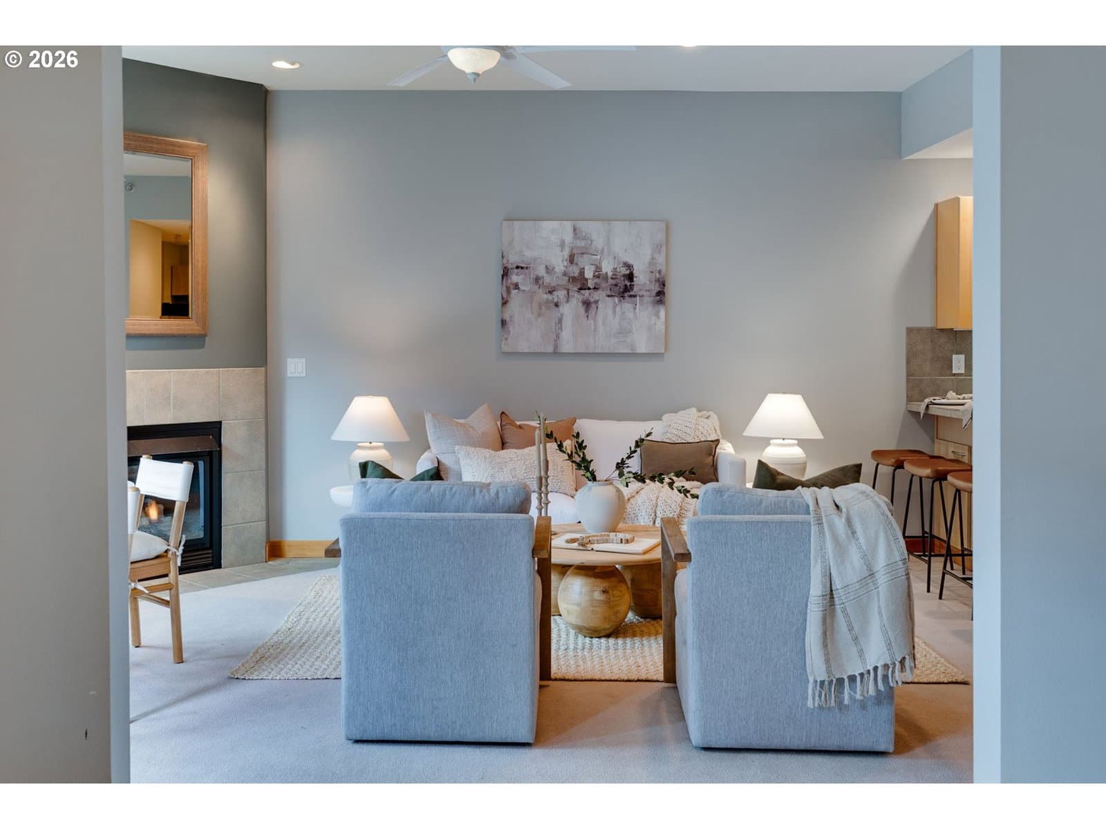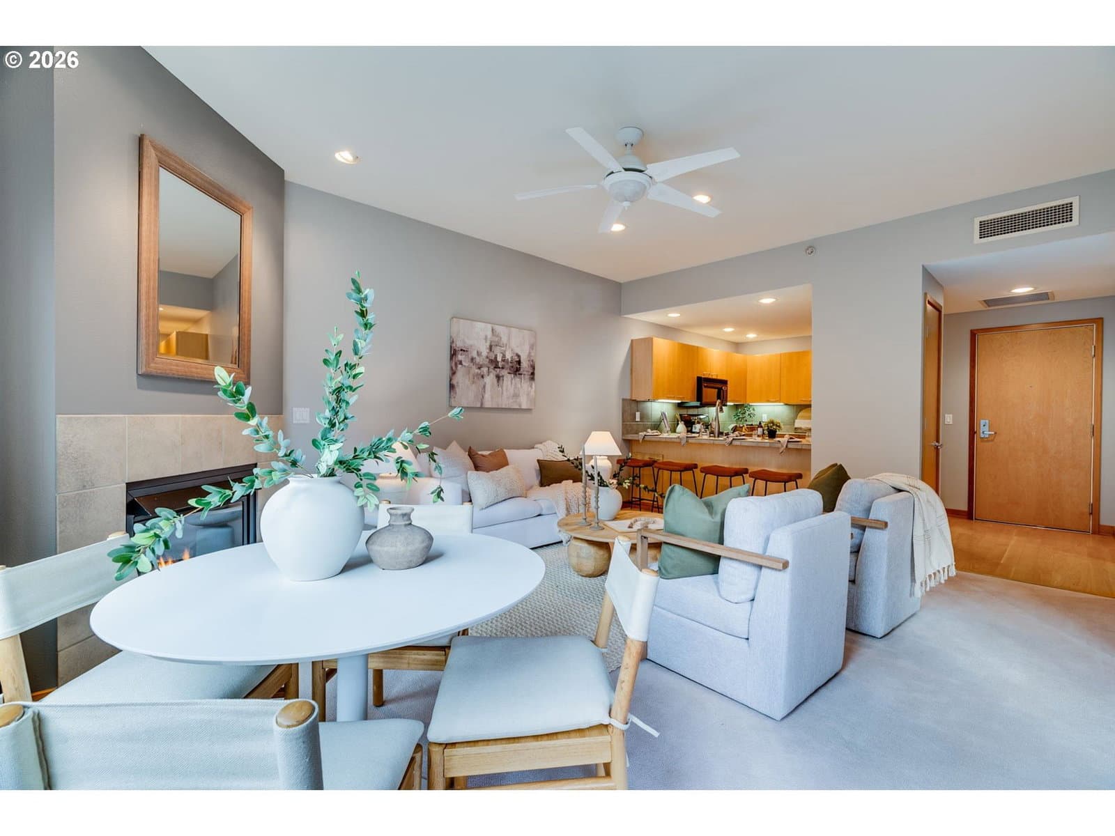 Experience vibrant downtown Vancouver living at Heritage Place in this beautifully maintained 2BD/2BA condo just steps from Esther Short Park and the Vancouver Waterfront. This light-filled home features an open-concept layout with hardwood floors, large windows, and a cozy gas fireplace. The kitchen is designed for everyday living and entertaining with full-size appliances, a gas range, abundant cabinetry, and a spacious eat-up bar that flows into the dining and living areas. The primary suite offers dual sinks and generous storage, while the second bedroom is ideal for guests or a home office. Relax on your private balcony overlooking the courtyard. Additional highlights include in-unit laundry, secure parking, and storage. Residents of Heritage Place enjoy fitness and community amenities. Enjoy exceptional walkability to restaurants, breweries, coffee shops, boutique shopping, the Farmers Market, waterfront trails, concerts, and year-round events, with easy access to I-5 and Portland.
