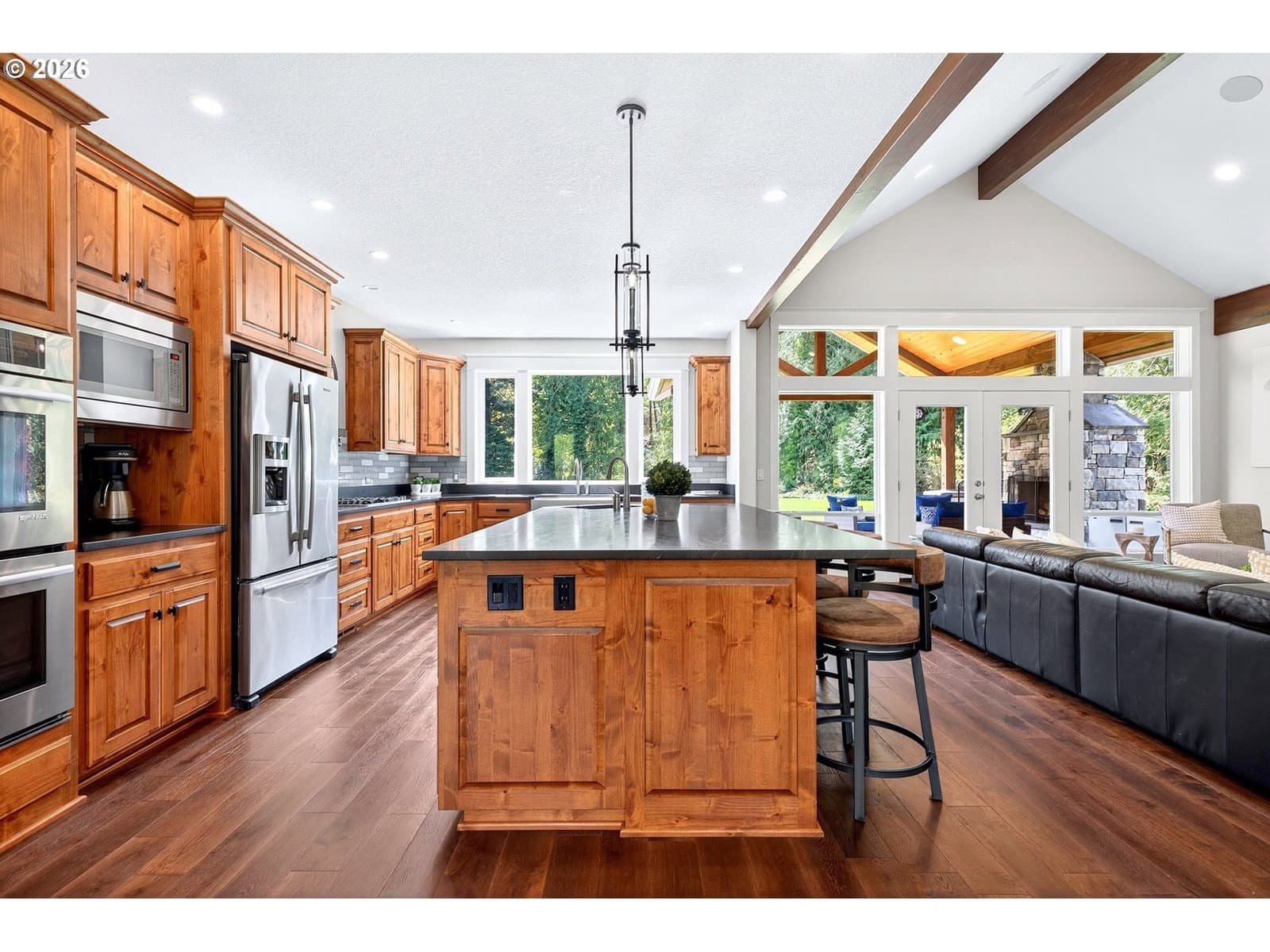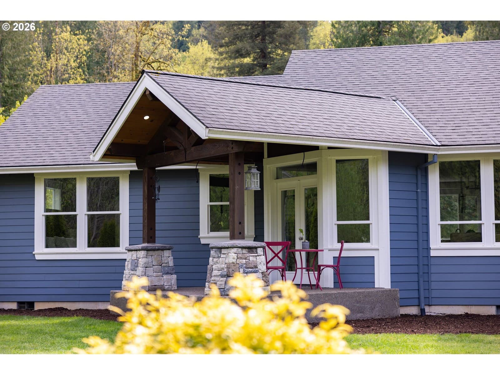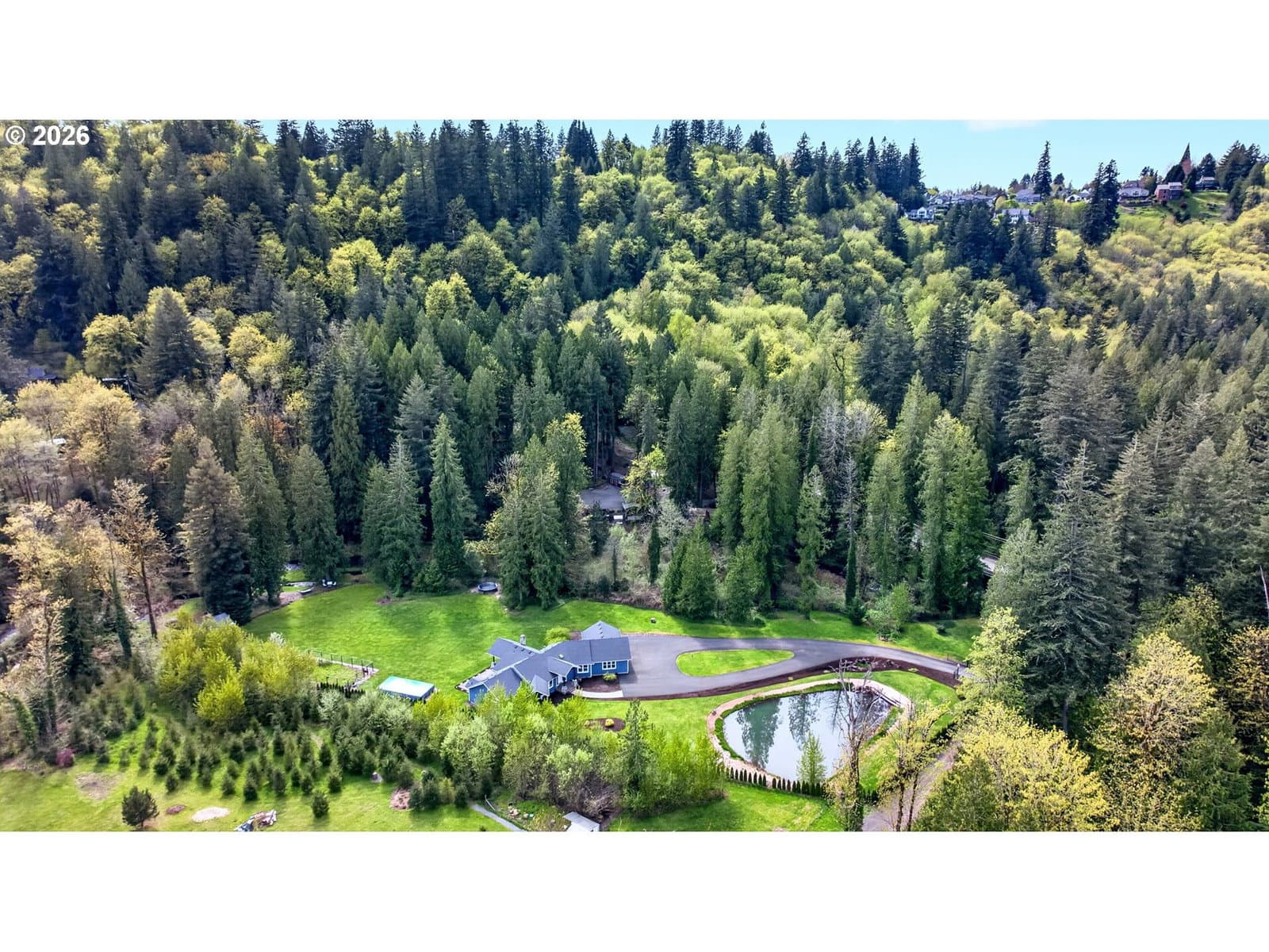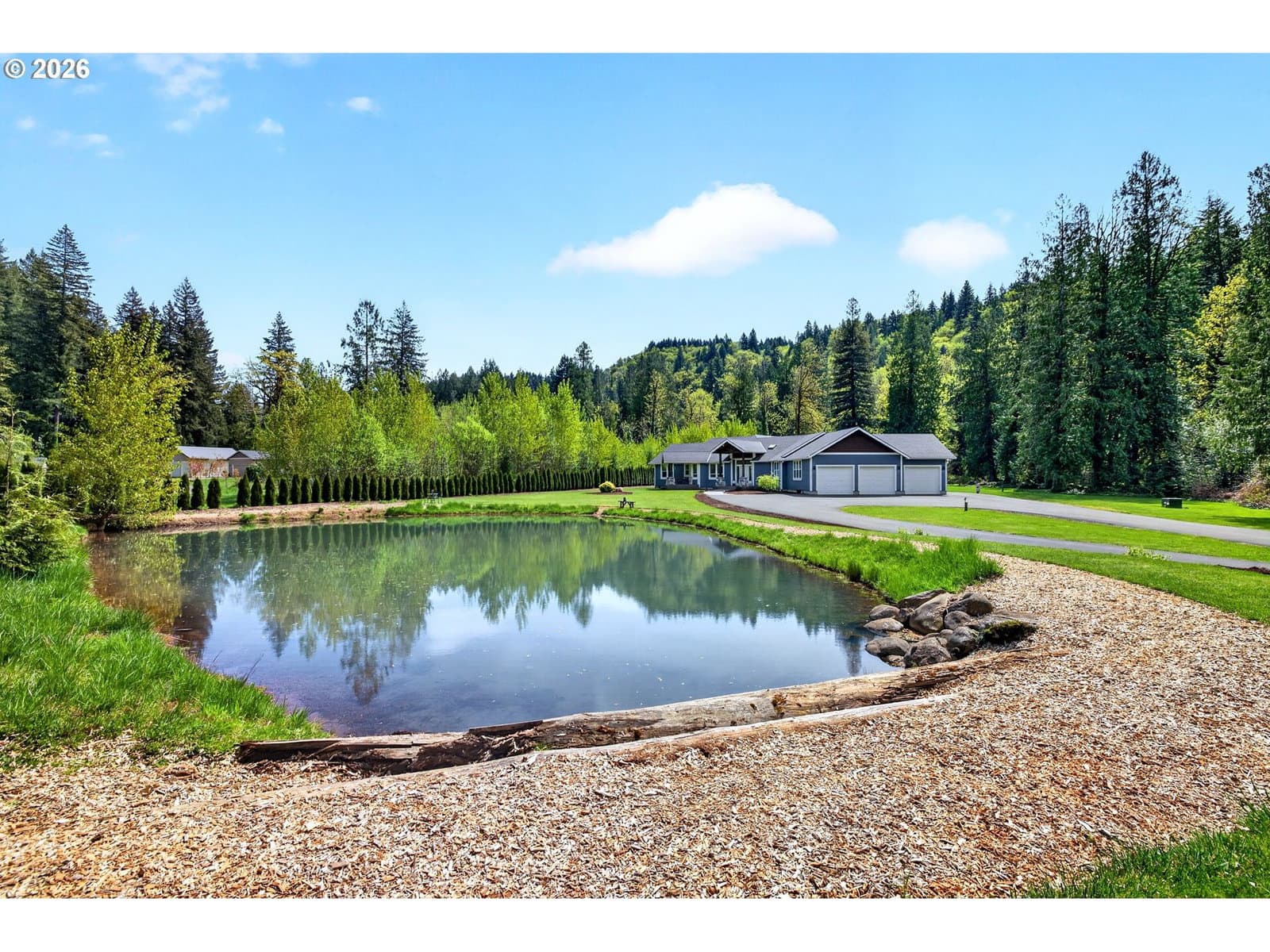 Tucked behind a gated entrance along the tranquil banks of Cedar Creek, this custom-built estate anchored by a picturesque pond offers a truly distinctive setting. Step into an open-concept design filled with natural light, soaring vaulted ceilings, exposed architectural wood beams, espresso-stained white oak hardwood floors, and a stone surround fireplace. The Chef’s kitchen is designed for both daily living and entertaining, showcasing custom knotty alder cabinetry, seamless quartzite slab island, leather granite countertops, double convection ovens, gas range with pot filler, farmhouse sink, second prep sink, dual drawer refrigerators, and a large walk-in pantry. The primary suite features a jetted tub beneath a picture window, an oversized tile walk-in shower, dual vanities, and a spacious walk-in closet with built-ins and closet dresser, and additional laundry hookups. A second ensuite offers flexibility for guests. The third bedroom is complemented by a finished bath with custom cabinetry and stone surfaces. Outdoor living is elevated with both covered and open patio space, featuring tongue-and-groove knotty pine ceiling, wood-burning fireplace, and propane hookup for outdoor cooking. The grounds are thoughtfully designed, featuring a private pond, mature landscaping, fenced garden, fruit trees, and established arborvitae hedges for privacy. Direct Cedar Creek frontage includes both banks and the creek bed with trout fishing. A detached casita perched above a private garage with storage, bathroom, kitchenette, and a balcony overlooking the creek, is ideal for guests, private studio, or multigenerational living. Additional highlights include a three-car garage with convenient half bath, circular paved driveway, and secure gated entry. Close to downtown Sandy along the Mt. Hood corridor, just minutes from world-class skiing, hiking, and year-round recreation, this is a rare opportunity to own an immersive retreat designed for elevated Pacific Northwest living.