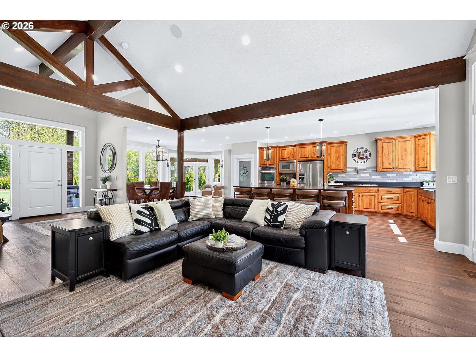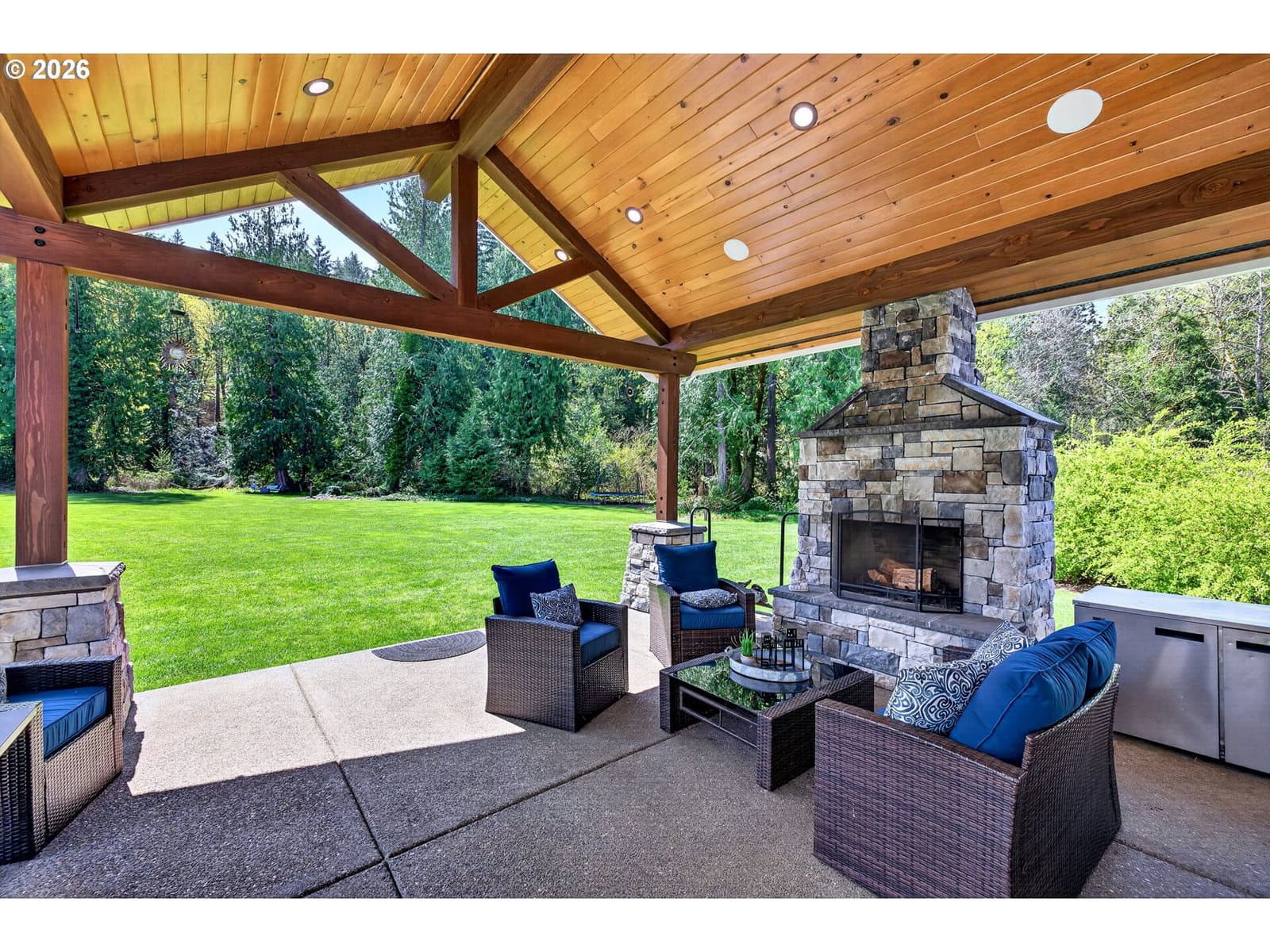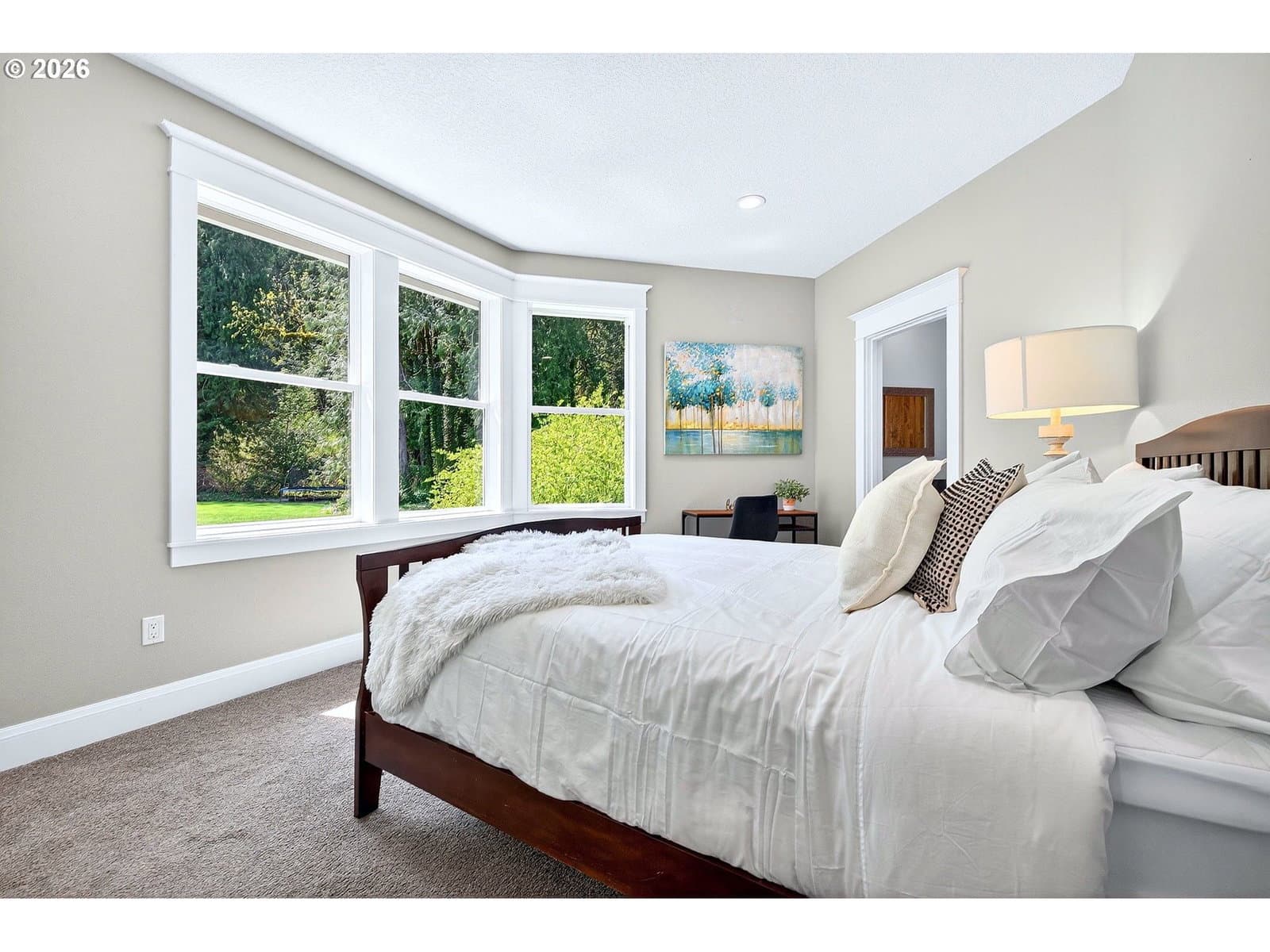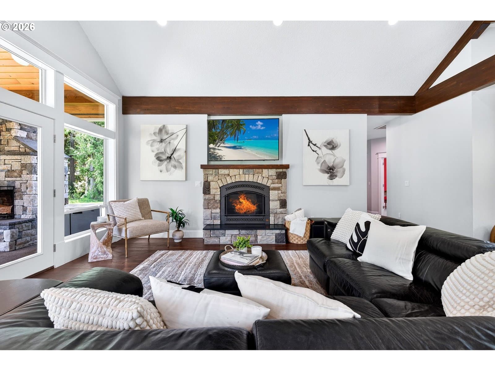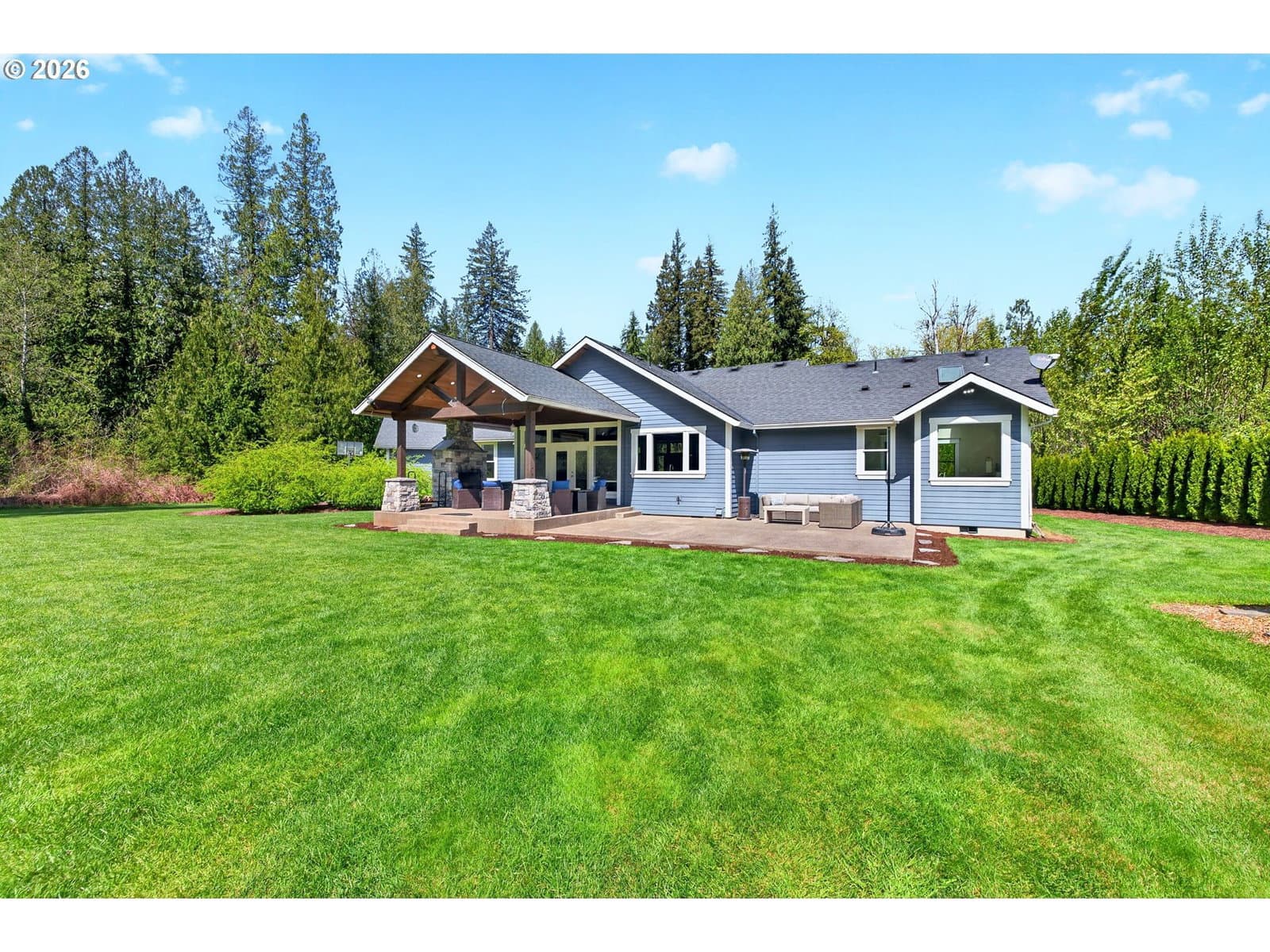 Tucked behind a gated entrance along the tranquil banks of Cedar Creek, this custom-built estate anchored by a picturesque pond offers a truly distinctive setting. Step into an open-concept design filled with natural light, soaring vaulted ceilings, exposed architectural wood beams, espresso-stained white oak hardwood floors, and a stone surround fireplace. The Chef’s kitchen is designed for both daily living and entertaining, showcasing custom knotty alder cabinetry, seamless quartzite slab island, leather granite countertops, double convection ovens, gas range with pot filler, farmhouse sink, second prep sink, dual drawer refrigerators, and a large walk-in pantry. The primary suite features a jetted tub beneath a picture window, an oversized tile walk-in shower, dual vanities, and a spacious walk-in closet with built-ins and closet dresser, and additional laundry hookups. A second ensuite offers flexibility for guests. The third bedroom is complemented by a finished bath with custom cabinetry and stone surfaces. Outdoor living is elevated with both covered and open patio space, featuring tongue-and-groove knotty pine ceiling, wood-burning fireplace, and propane hookup for outdoor cooking. The grounds are thoughtfully designed, featuring a private pond, mature landscaping, fenced garden, fruit trees, and established arborvitae hedges for privacy. Direct Cedar Creek frontage includes both banks and the creek bed with trout fishing. A detached casita perched above a private garage with storage, bathroom, kitchenette, and a balcony overlooking the creek, is ideal for guests, private studio, or multigenerational living. Additional highlights include a three-car garage with convenient half bath, circular paved driveway, and secure gated entry. Close to downtown Sandy along the Mt. Hood corridor, just minutes from world-class skiing, hiking, and year-round recreation, this is a rare opportunity to own an immersive retreat designed for elevated Pacific Northwest living.