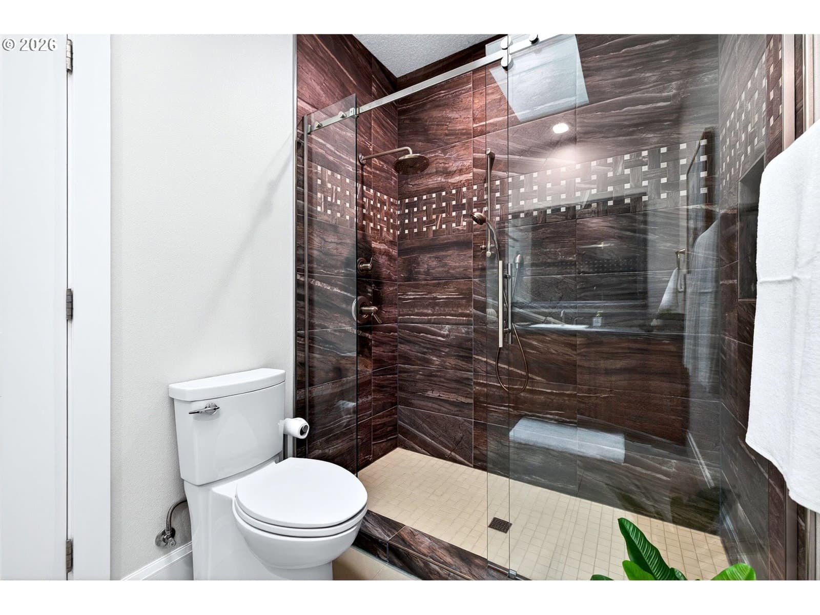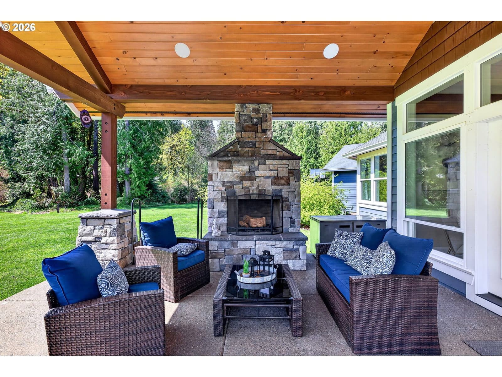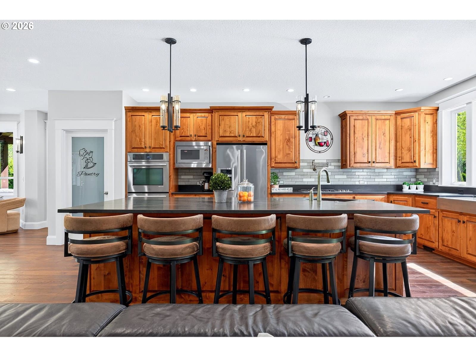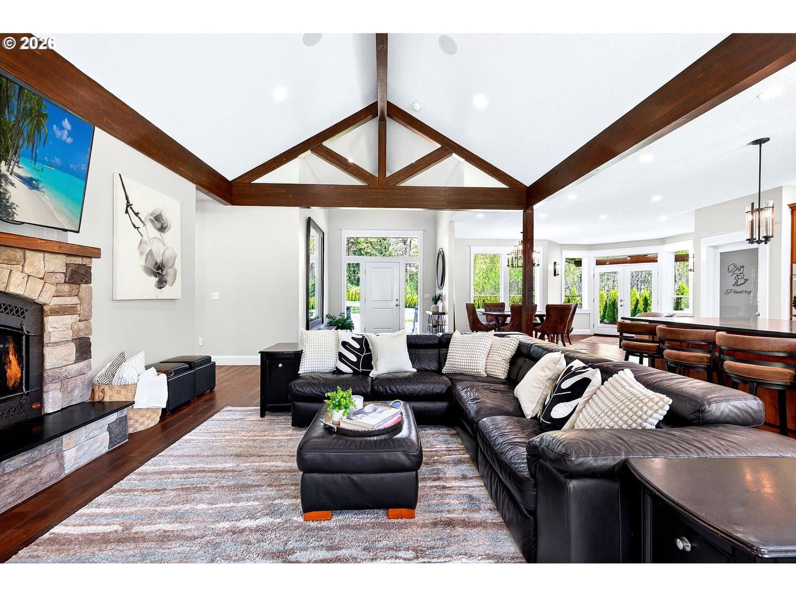 Tucked behind a gated entrance along the tranquil banks of Cedar Creek, this custom-built estate anchored by a picturesque pond offers a truly distinctive setting. Step into an open-concept design filled with natural light, soaring vaulted ceilings, exposed architectural wood beams, espresso-stained white oak hardwood floors, and a stone surround fireplace. The Chef’s kitchen is designed for both daily living and entertaining, showcasing custom knotty alder cabinetry, seamless quartzite slab island, leather granite countertops, double convection ovens, gas range with pot filler, farmhouse sink, second prep sink, dual drawer refrigerators, and a large walk-in pantry. The primary suite features a jetted tub beneath a picture window, an oversized tile walk-in shower, dual vanities, and a spacious walk-in closet with built-ins and closet dresser, and additional laundry hookups. A second ensuite offers flexibility for guests. The third bedroom is complemented by a finished bath with custom cabinetry and stone surfaces. Outdoor living is elevated with both covered and open patio space, featuring tongue-and-groove knotty pine ceiling, wood-burning fireplace, and propane hookup for outdoor cooking. The grounds are thoughtfully designed, featuring a private pond, mature landscaping, fenced garden, fruit trees, and established arborvitae hedges for privacy. Direct Cedar Creek frontage includes both banks and the creek bed with trout fishing. A detached casita perched above a private garage with storage, bathroom, kitchenette, and a balcony overlooking the creek, is ideal for guests, private studio, or multigenerational living. Additional highlights include a three-car garage with convenient half bath, circular paved driveway, and secure gated entry. Close to downtown Sandy along the Mt. Hood corridor, just minutes from world-class skiing, hiking, and year-round recreation, this is a rare opportunity to own an immersive retreat designed for elevated Pacific Northwest living.