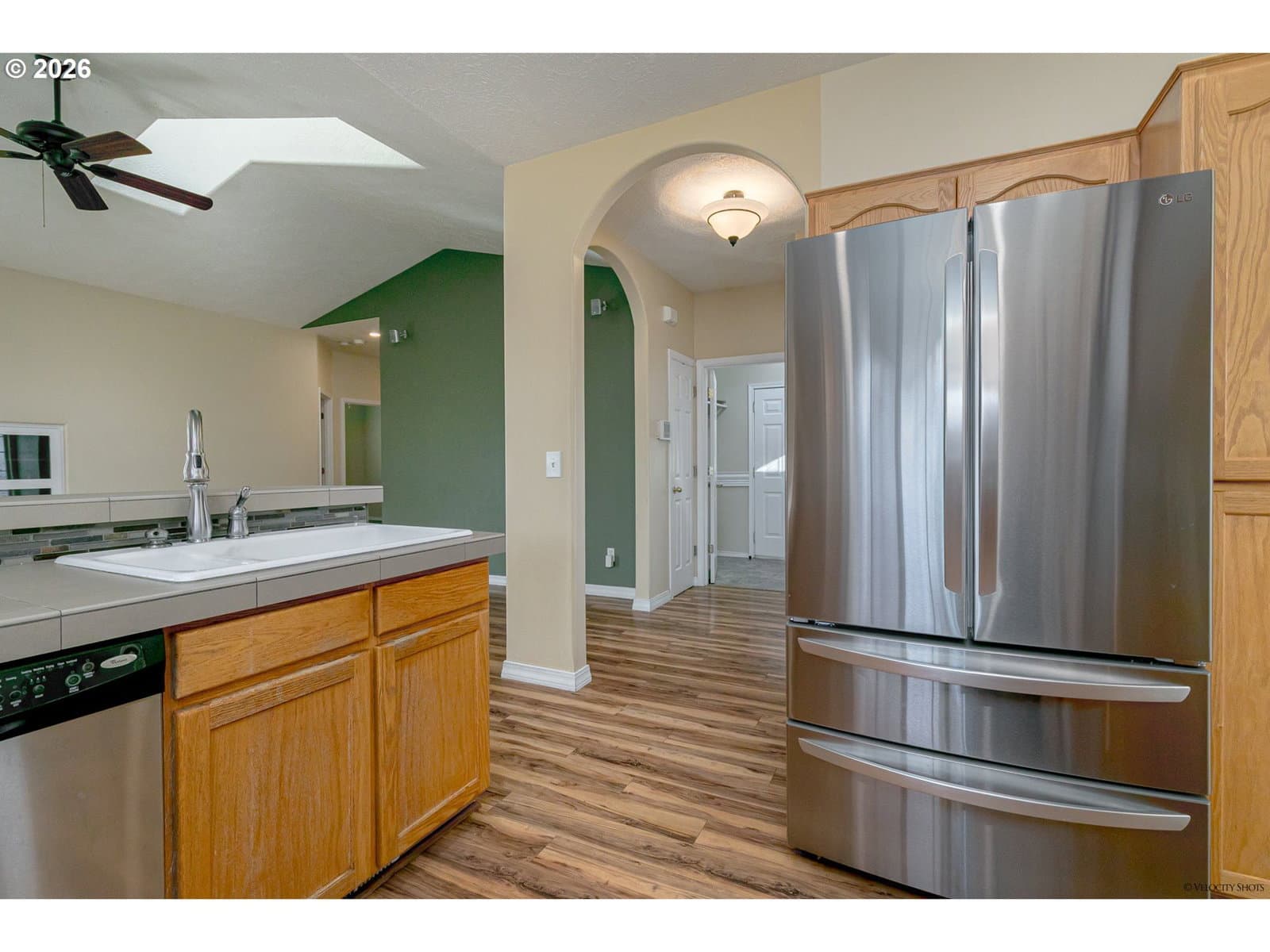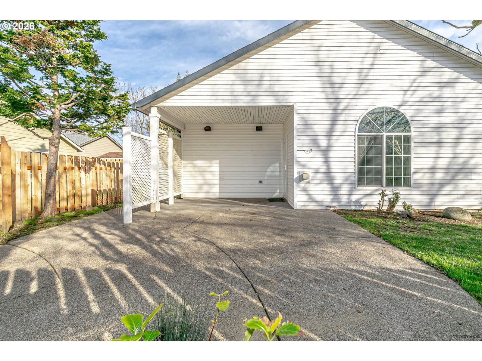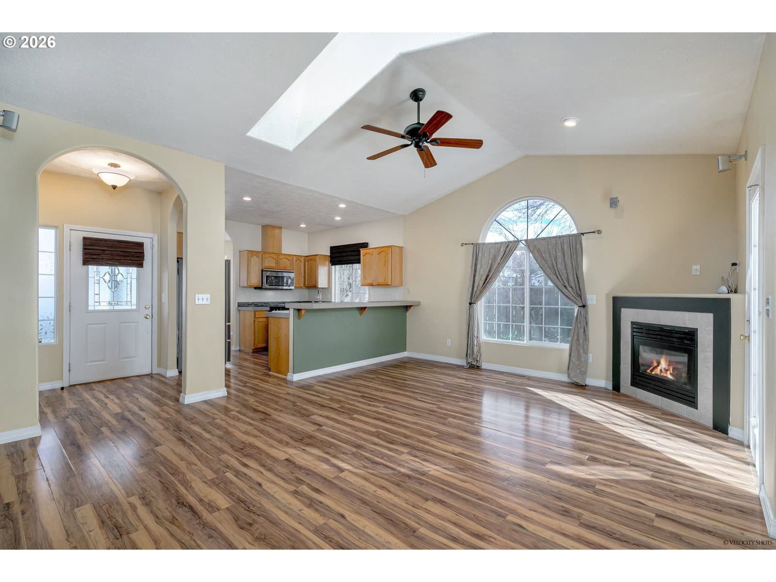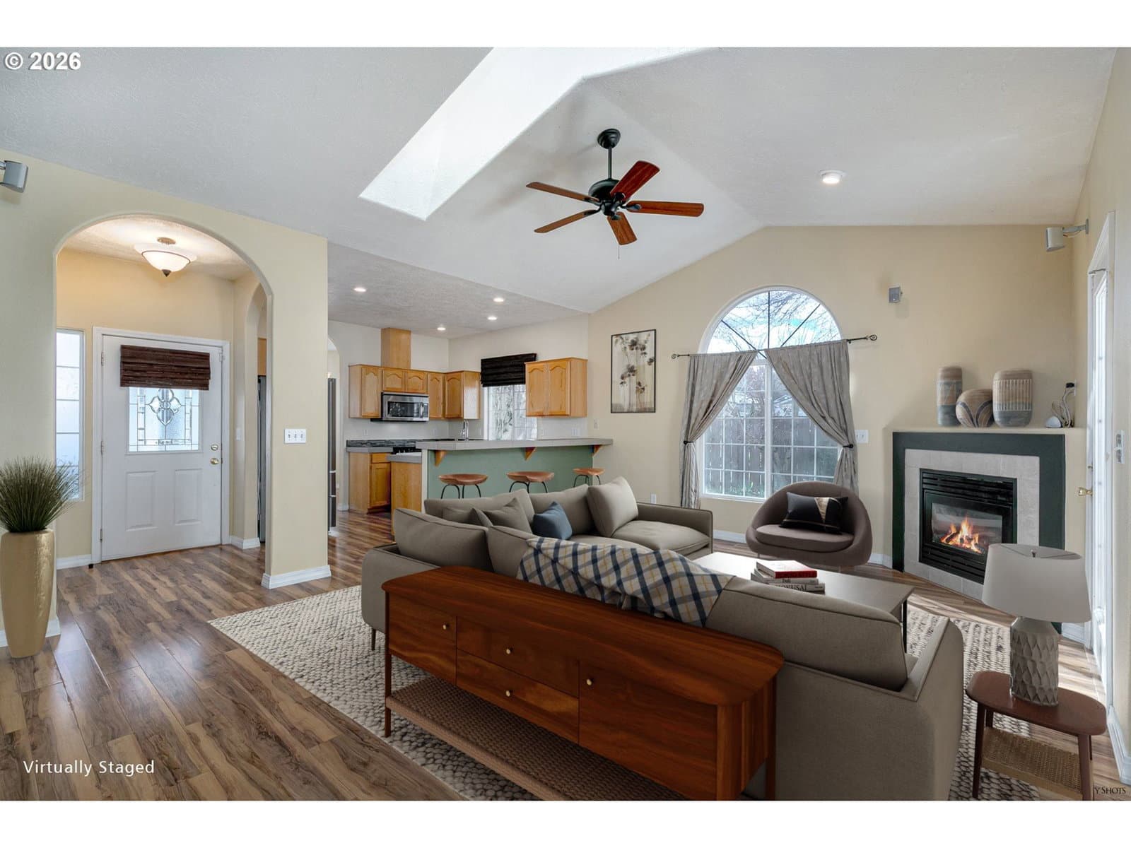 Clean and well-cared-for one-level home featuring a functional floor plan with vaulted ceilings. The living area includes a gas fireplace and is wired for a built-in sound system. Enjoy a private courtyard with a large patio, along with a spacious primary suite offering an attached bathroom and walk-in closet. Conveniently located just blocks from Blue Lake. All appliances are included, including washer, dryer, and refrigerator. The double-car garage features a utility sink. Solar panels help reduce electric costs, and the gas furnace and hot water tank are approximately four years old and recently serviced. Sprinkler systems are installed in both the front and back yards. Recent updates include a new backyard fence and a roof that has been recently treated. HOA maintains the front yard landscaping and subdivision parks