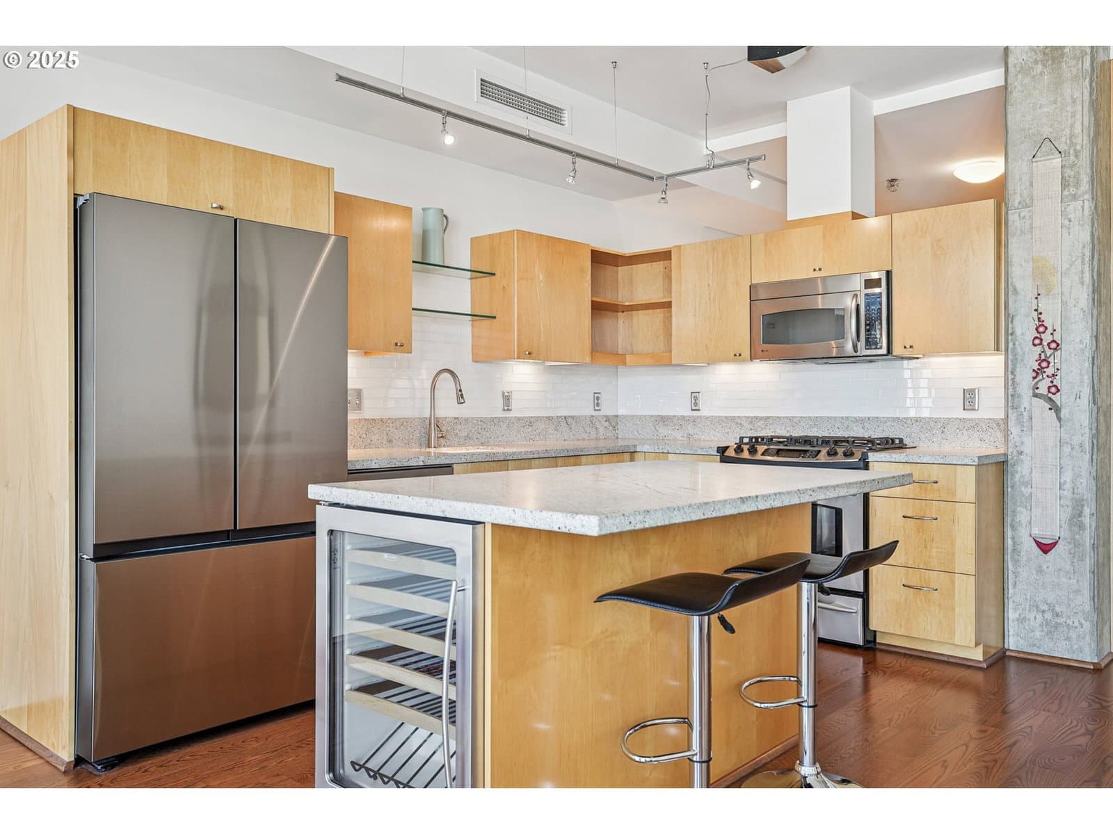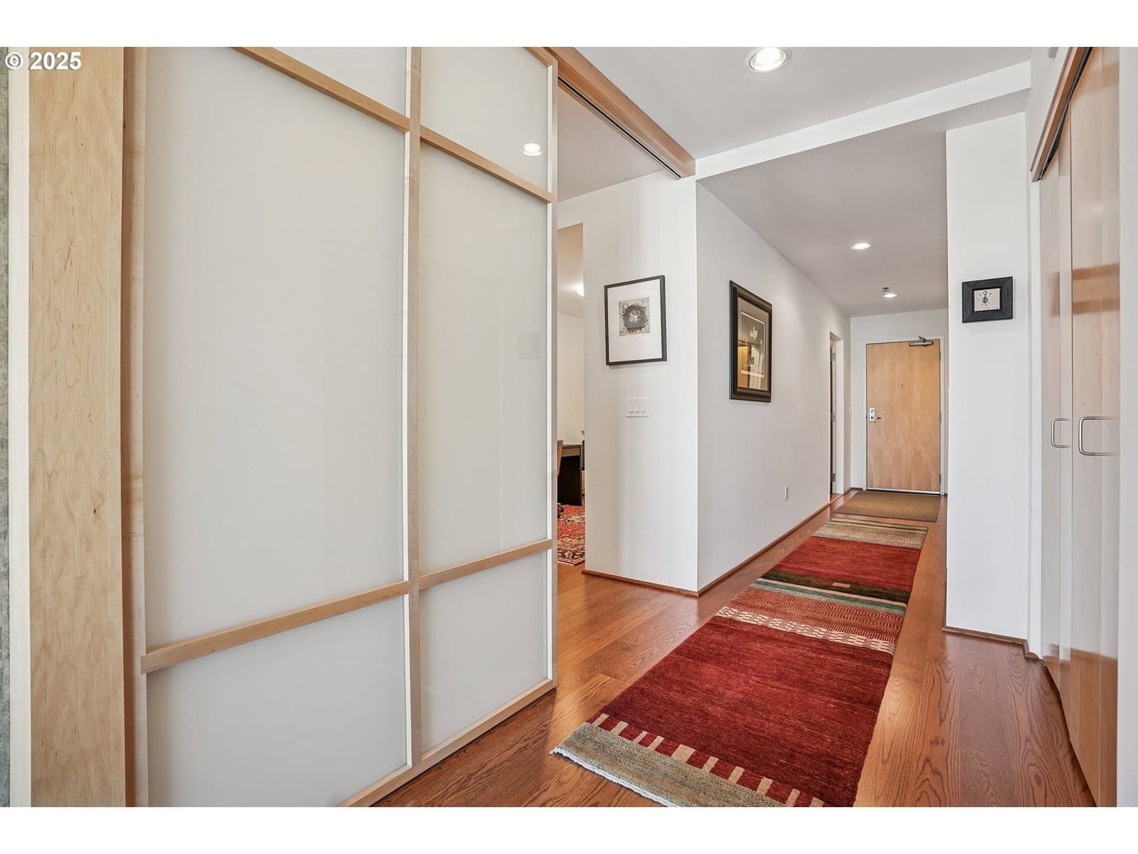 Enjoy a turnkey lifestyle & a breath of fresh air in this light and bright condo on the highest floor possible before the penthouse levels. Mid-century vibes & modern style with an open living area flooded with light from the floor to ceiling windows with two layers of mesh solar shades to control all the natural light you like. Enjoy watching the sunsets & grilling on the balcony spanning over 26'. Clean lines in the kitchen with European-style cabinets, granite counters, a custom full-height backsplash and stainless appliances, including the wine cooler in the eating island. The primary suite is private off the living room with custom wood & glass sliders, custom closets & an en suite bathroom featuring a marble vanity and large soaking tub/shower combination. Matching custom wood & glass sliders enclose the 2nd bedroom for working or hosting guests with the adjacent 2nd bath. The large entry leads to a big laundry room with generous storage space, washer & dryer. Separately deeded & secure parking space is within the building, and includes a private storage room adjacent to the parking space. The building has power for EV charging & each owner can contract to bring the power and install charging stations at each parking space at their own cost. The building has many wonderful amenities: fitness room & library on the 2nd floor, meeting room & common terrace with kitchen & bath on the 3rd floor, plus 24/7 concierge service. Strong HOA & very well managed building. Frequent the new Mark Rothko Pavilion at the Portland Art Museum across the street, events at the Schnitz, Oregon Historical Society, Farmers Markets, classes at PSU, downtown shopping & dining.