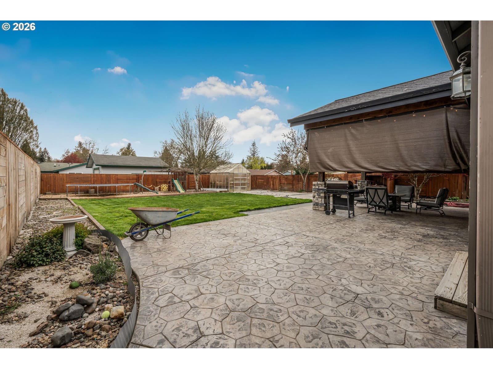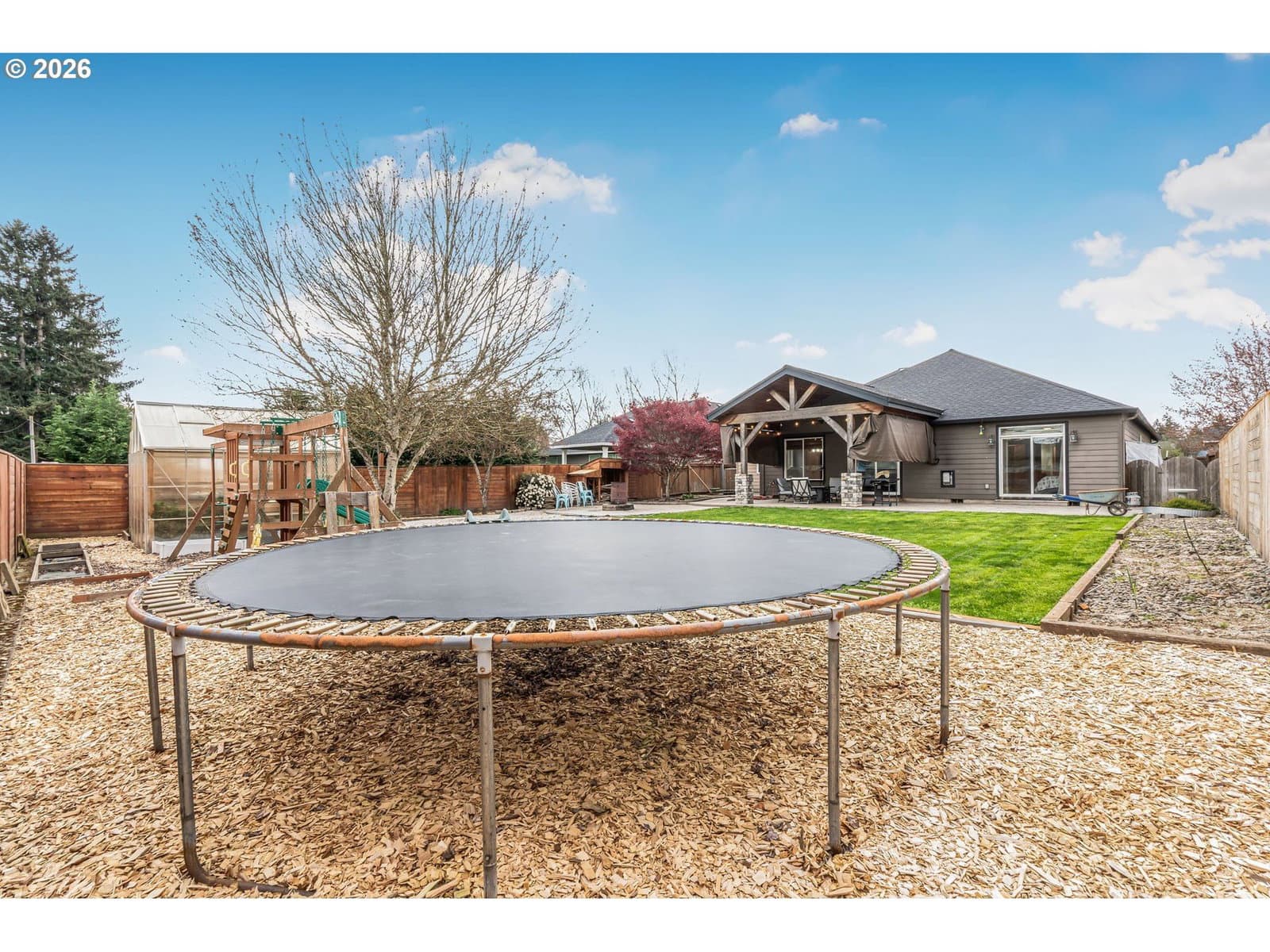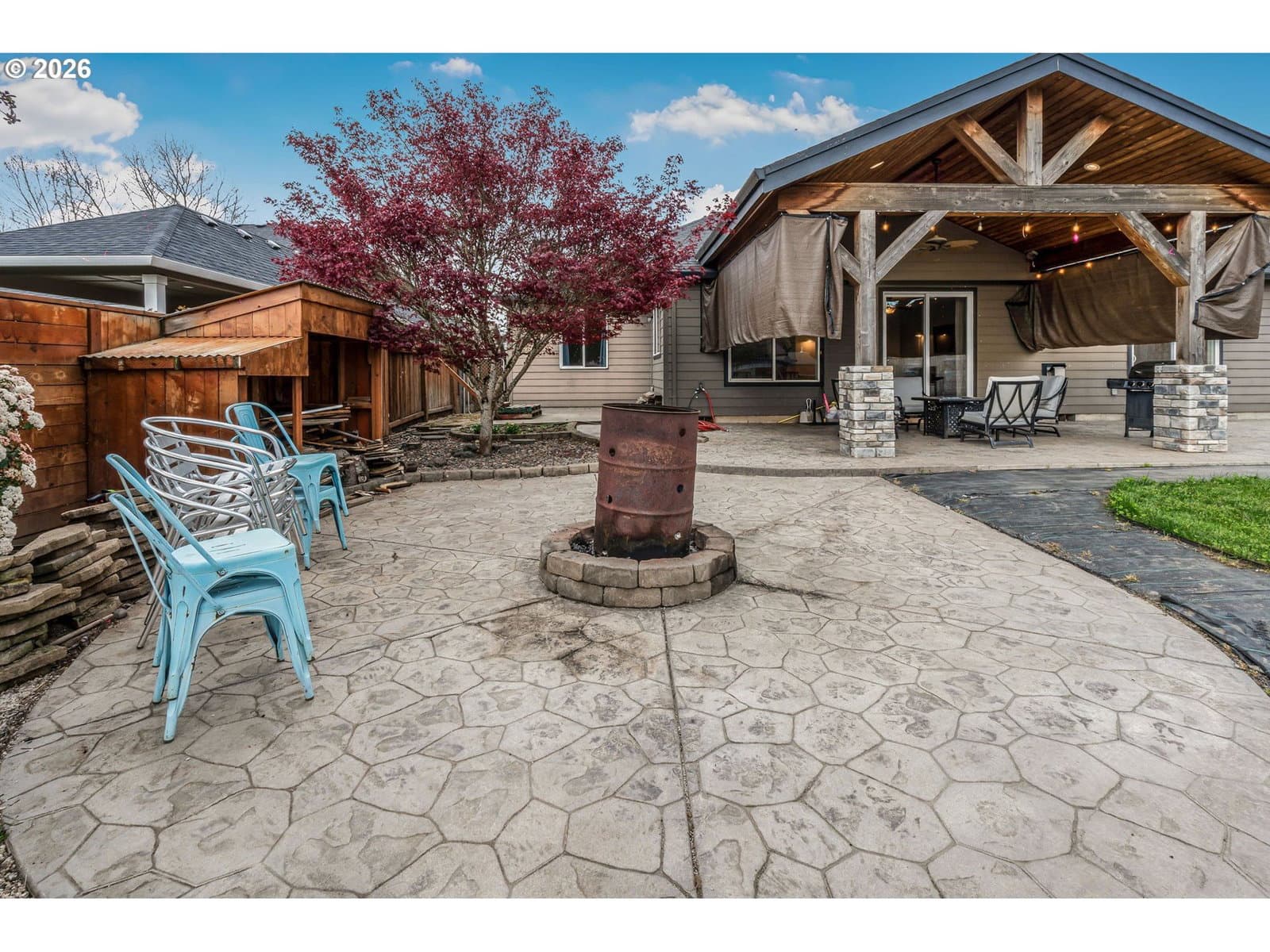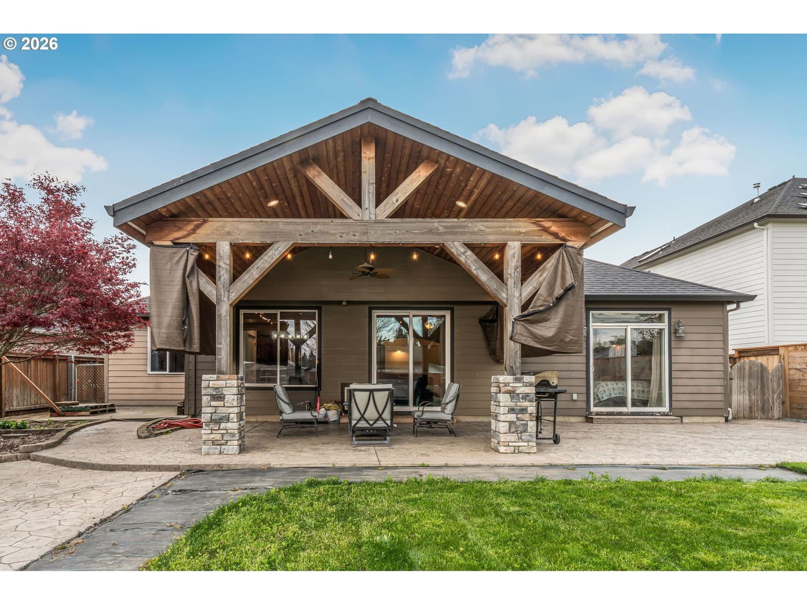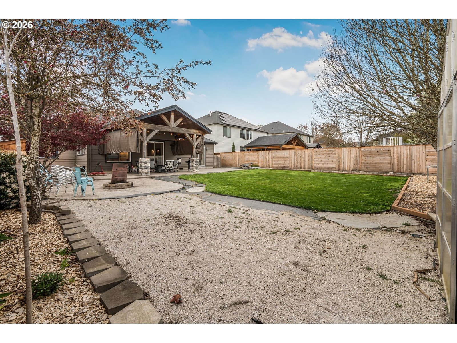 Elegant single-level living offering 2,374 sq ft of thoughtfully designed space on a generous 0.24 acre lot. High ceilings and a refined open-concept layout seamlessly connect the kitchen, dining, and living areas - ideal for both everyday comfort and elevated entertaining. A dedicated office or den provides a private workspace, while an additional flex space offers versatility for a formal dining area or potential fourth bedroom. The gourmet kitchen flows effortlessly into the living room, anchored by a warm, inviting fireplace. The private primary suite serves as a spa-like retreat with a soaking tub, walk-in closet, and sliding glass doors to the backyard. Enjoy a beautifully maintained, fully fenced yard featuring a fire pit, dog run, and ample space for relaxation or gatherings. A custom timber frame outdoor pavilion with stone column detailing offers a stunning space for year-round outdoor living. Additional features include central air, a spacious two-car garage with extra storage, and HOA amenities including a community gym and outdoor pool.