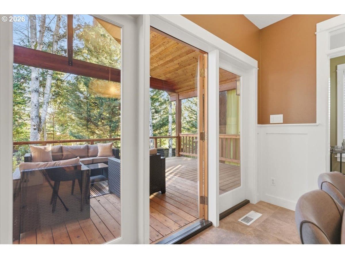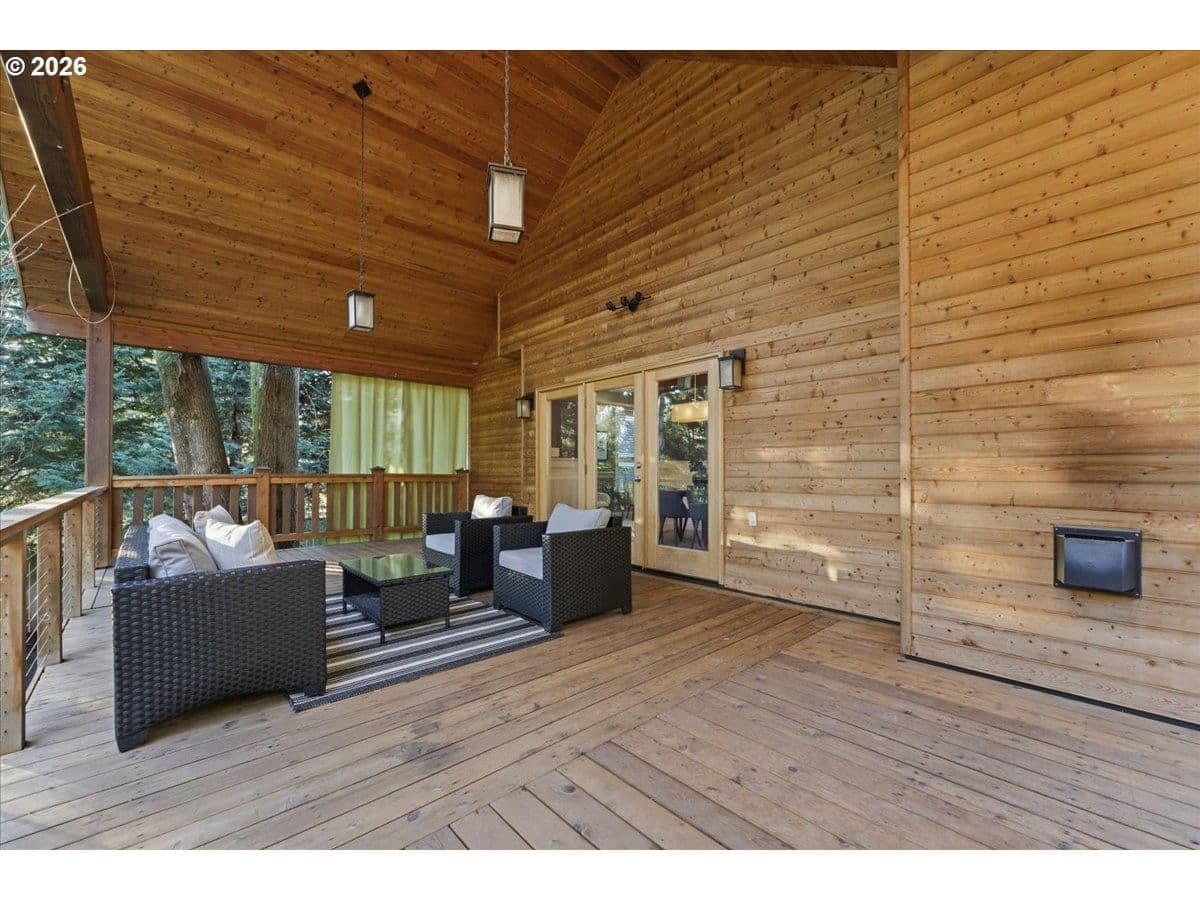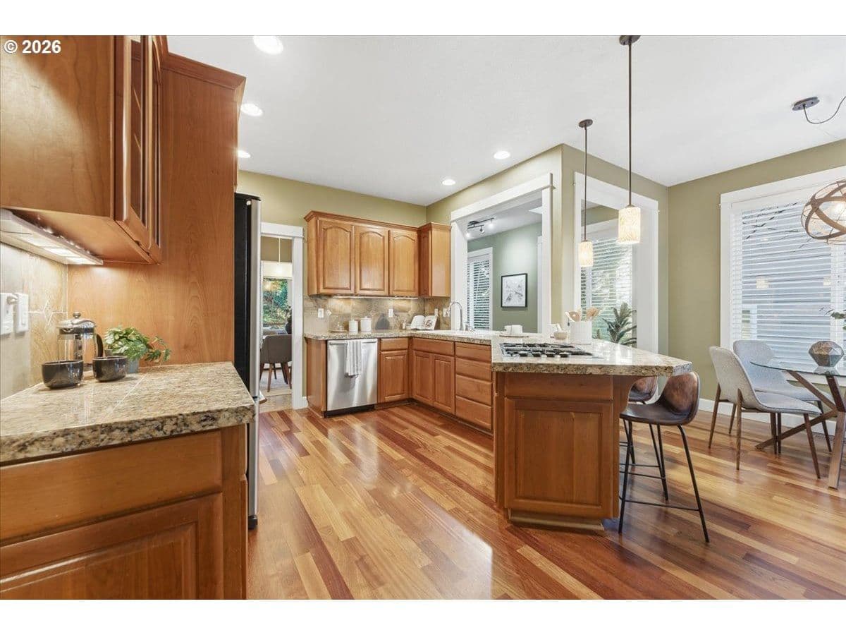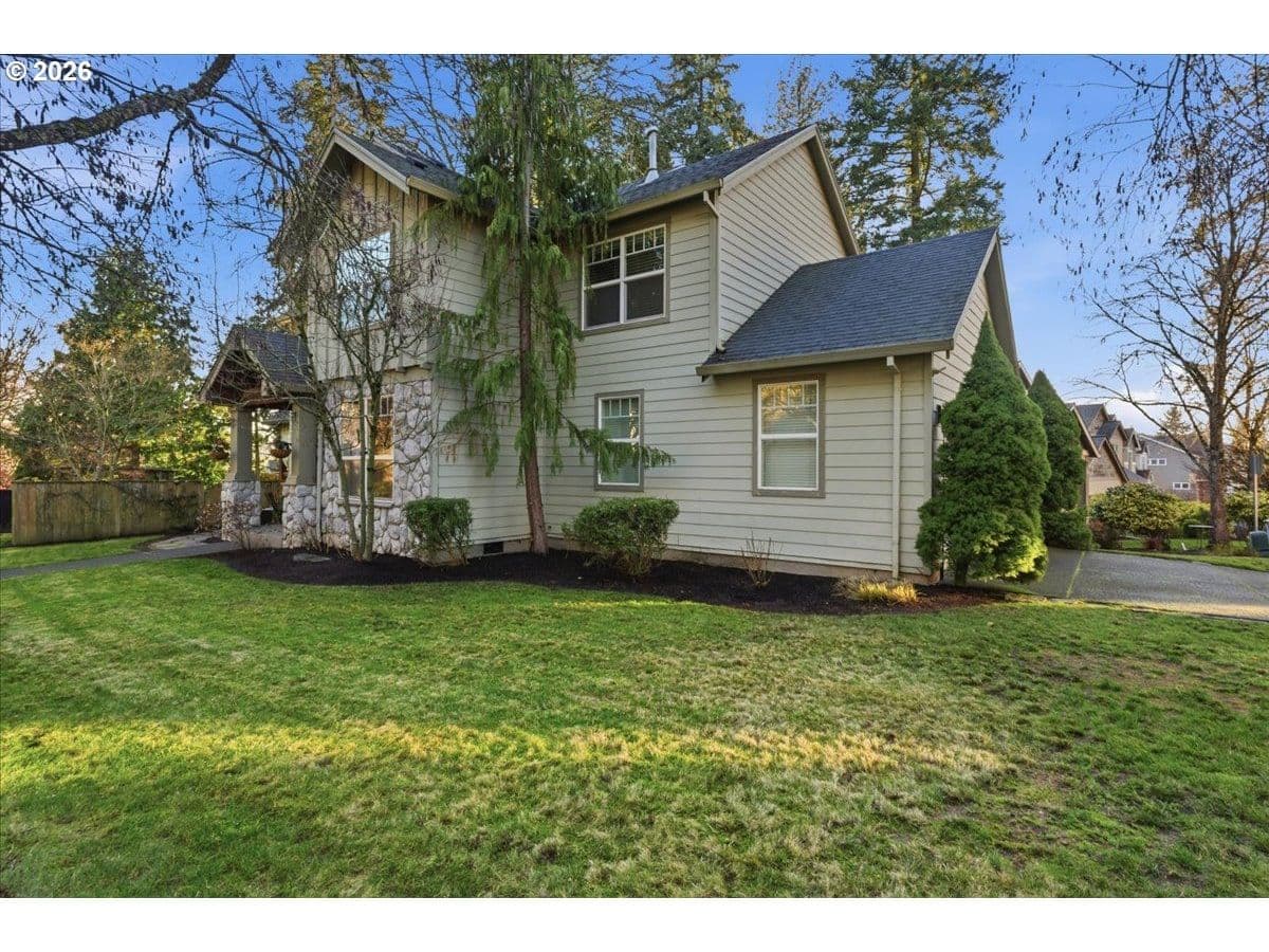 Outstanding Craftsman home in great pocket neighborhood on dead-end street! Beautiful kitchen cabinets and hardwood floors. 2 cozy fireplaces and great office space on main level. Standout 400+ square foot custom covered deck, rarely seen at this price point, overlooking large private yard perfect for year-round outdoor living and entertaining. 4th bedroom with closet is upstairs with vaulted ceiling and skylights. Walk-in closet in primary bedroom. Dual sinks in primary bathroom as well as the second upstairs bathroom. Large corner lot, beautifully maintained landscape with a terrific water feature in the front and a free standing second covered deck area in back yard. Great access to Fanno Creek Trail. Walk or ride to revitalized downtown Tigard, parks, open spaces. Access to neighborhood raised bed community garden just a few steps down the sidewalk in front. Please come see this great home! Short distance to Tigard Transit Center, WES, Washington Square, Fanno Creek, Parks, Trails, Bike Paths, Walking Paths to downtown Tigard.