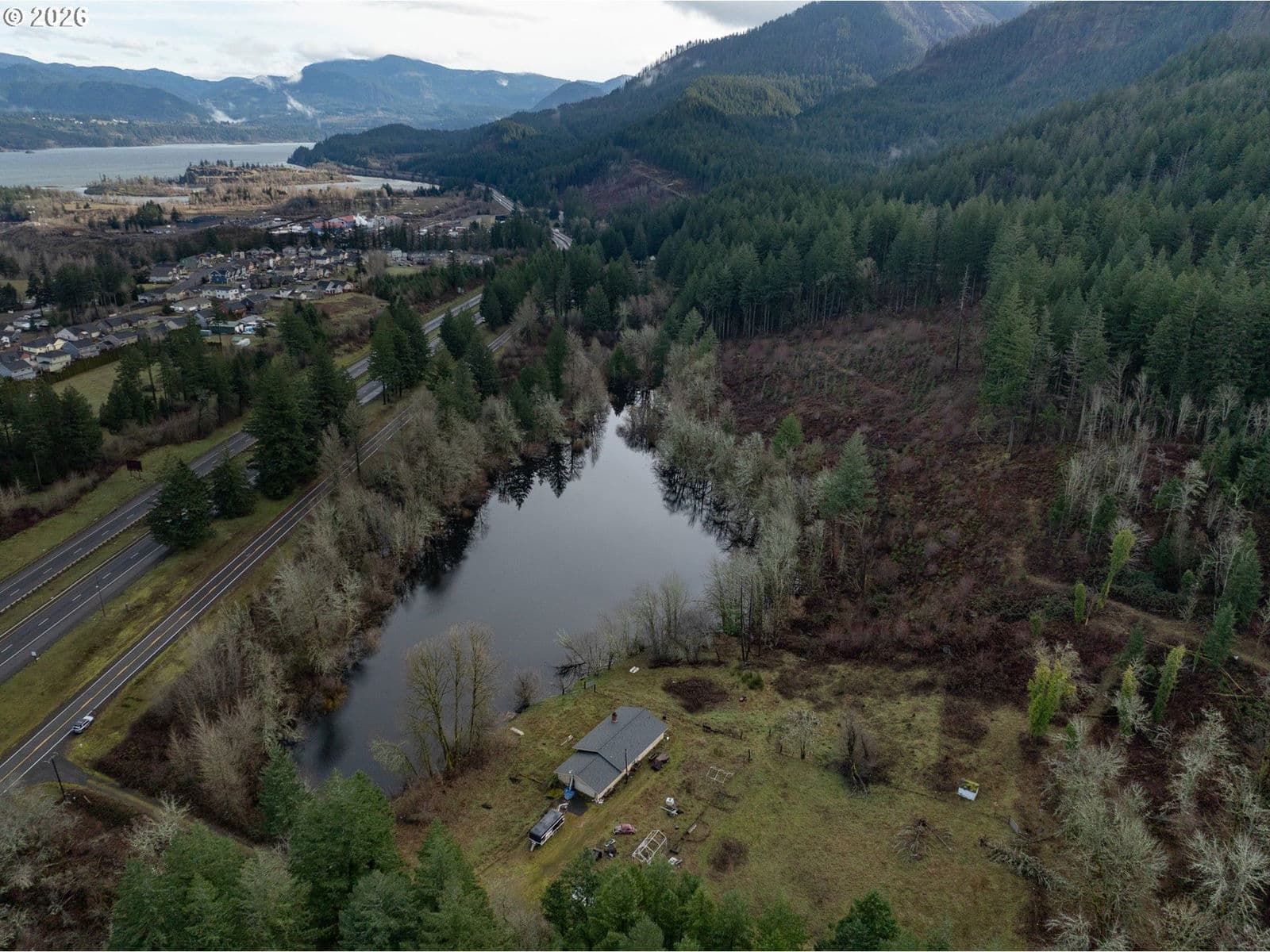 This scenic 20.8 acre property is located in the scenic Columbia River Gorge area. Just outside of the Cascade Locks small, historic town in Hood River County, Oregon, known for its stunning natural scenery along the Columbia River Gorge. You have the opportunity to own some that beauty. Your new sanctuary features a 4 acre pond that has a season stream flow into with bass and blue fish. All of the majestic wildlife the Cascades have to offer wandering around your property that is flush with forested State land and hatchery as a welcoming neighbor. Serene views in every direction. There is The property was logged in 2021 and replanted so there are fresh new trees growing in. There is an house is a 4 bedroom 3 bath one story with 2 car garage with a daylight basement that includes a kitchen, living room, bedroom, bathroom and storage. This fixer is just waiting for your improvements, remodel or rebuild plans. New roof in 2021 great structure with solid foundation. Update or Replace? Let the surroundings inspire you.