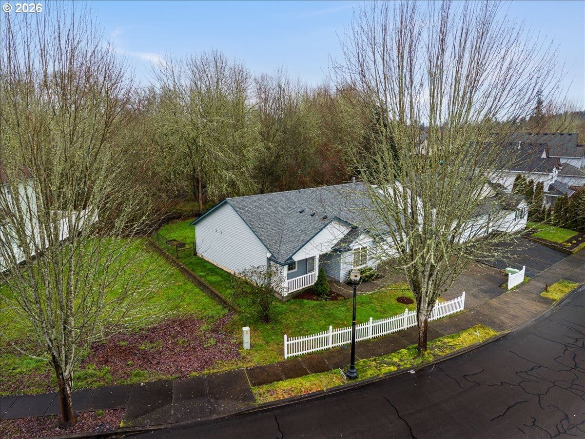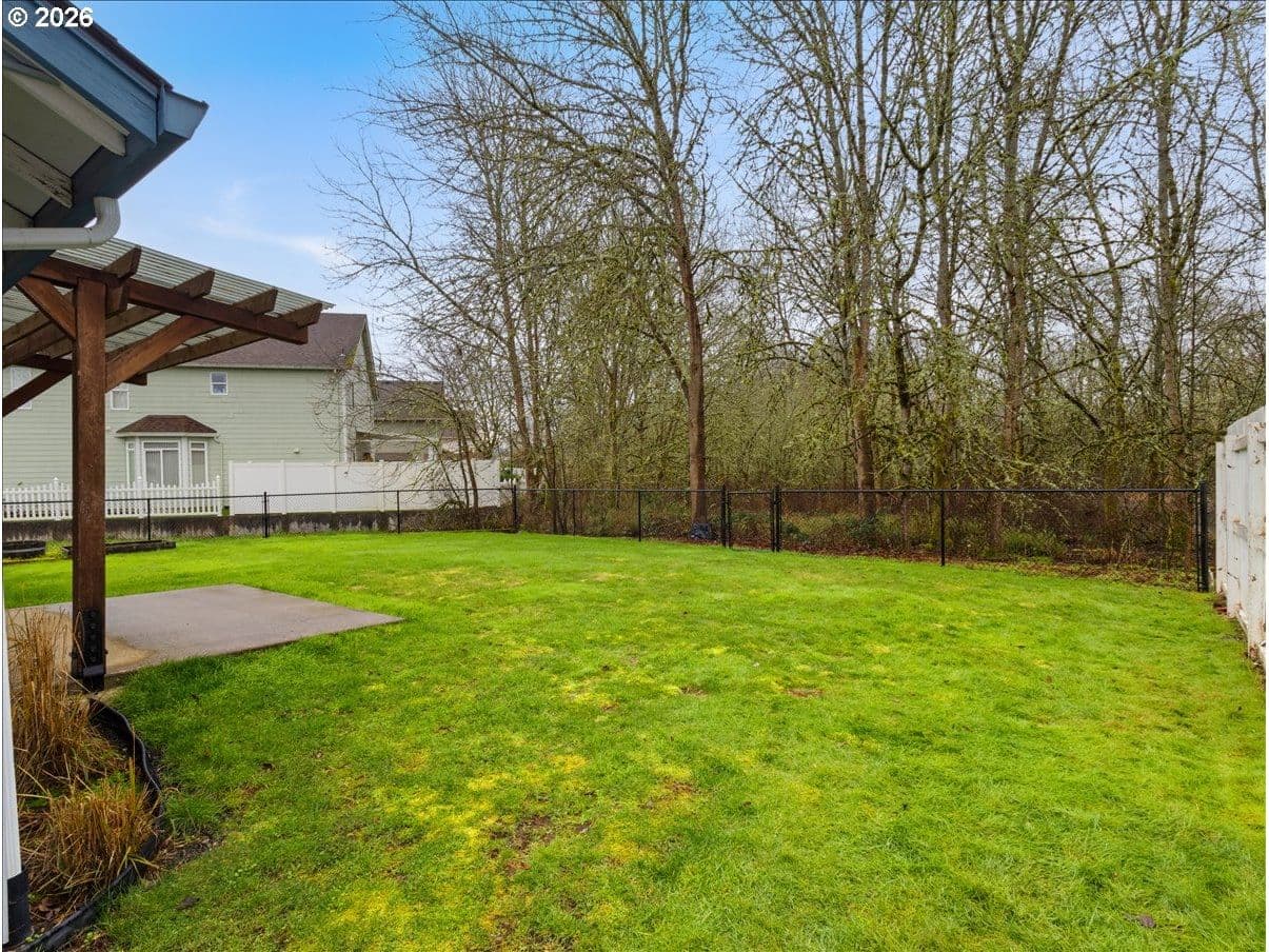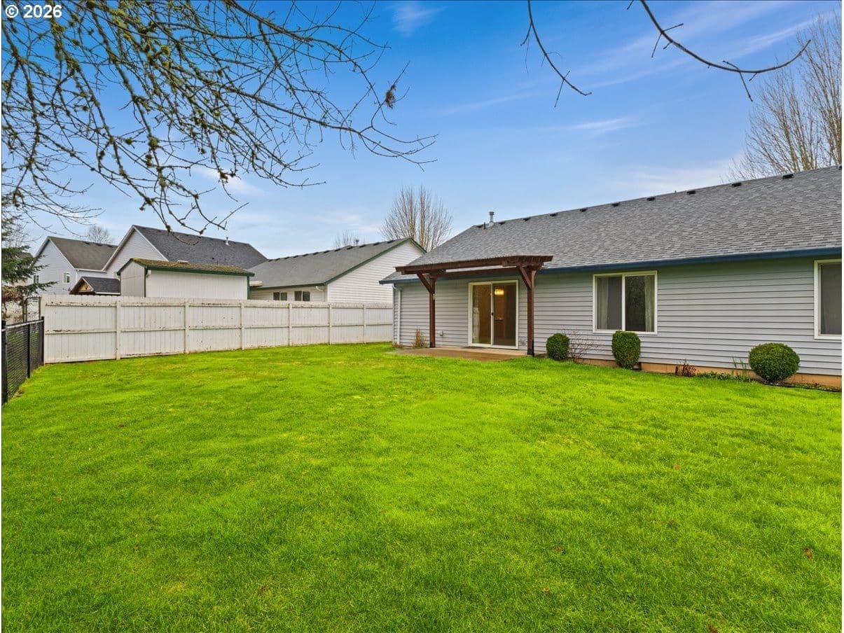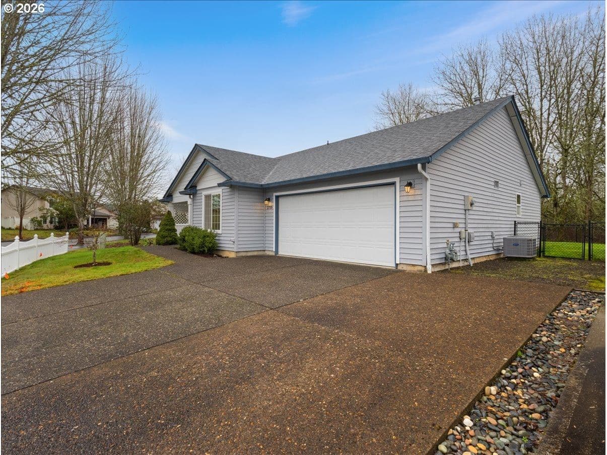 Perfect floorplan - refreshed with NEW carpet, NEW interior paint, annual HVAC service, NEW roof 2024, NEW bath faucets, NEW garbage disposal, plus NEW glass in slider! Just waiting for a new owner. Conveniently located in Parkview Trails neighborhood, this single level home backs to greenspace (watch the seasonal wildlife from your patio or either of the 3 bedrooms). The entryway, kitchen and dining area are solid oak/hardwood for a lovely warmth when you enter through the covered front porch. (all kitchen appliances stay - including 4-door French door refrigerator!), New carpet (and upgraded pad) in living room, hallway and 3 bedrooms. There's indoor laundry hook-ups, a total of 3 linen/storage closets (large 2-door closet in hallway, 1 smaller closet in hallway next to hall bath and 1 smaller closet in primary bedroom). Both baths are FULL baths (tub/shower combo). Dining area off kitchen has an eating bar so bring your stools. Did I mention the garage is semi-finished with taped drywall and how about the large paved RV parking along the side of the garage? All wrapped up with a white vinyl picket fence, sidewalks and street lights!