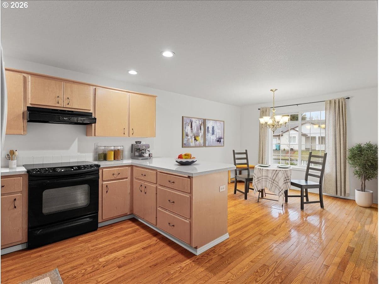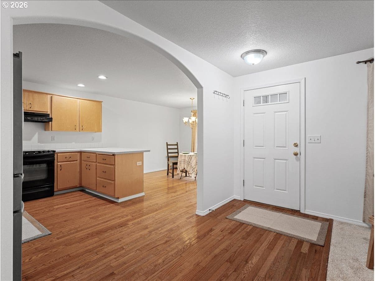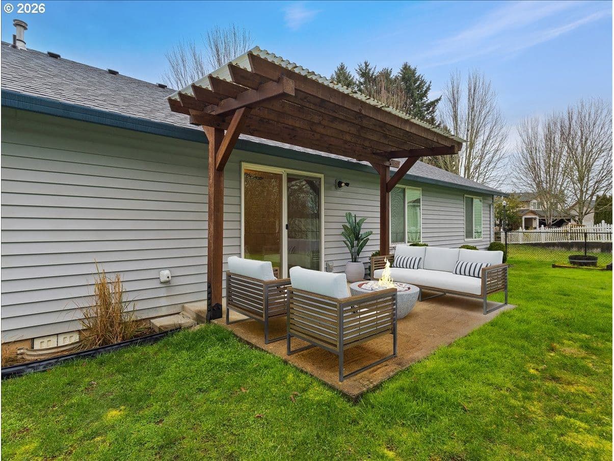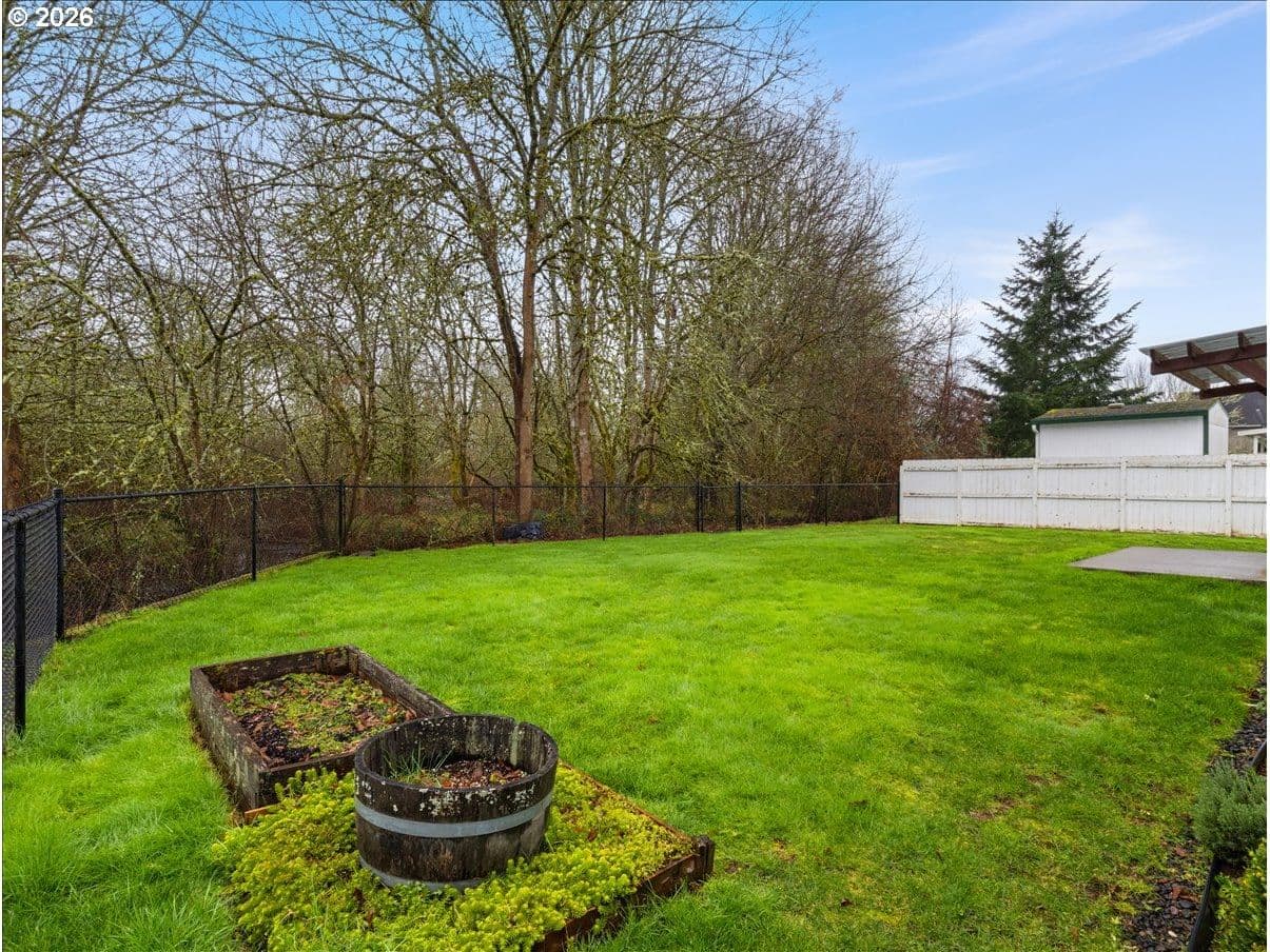 Perfect floorplan - refreshed with NEW carpet, NEW interior paint, annual HVAC service, NEW roof 2024, NEW bath faucets, NEW garbage disposal, plus NEW glass in slider! Just waiting for a new owner. Conveniently located in Parkview Trails neighborhood, this single level home backs to greenspace (watch the seasonal wildlife from your patio or either of the 3 bedrooms). The entryway, kitchen and dining area are solid oak/hardwood for a lovely warmth when you enter through the covered front porch. (all kitchen appliances stay - including 4-door French door refrigerator!), New carpet (and upgraded pad) in living room, hallway and 3 bedrooms. There's indoor laundry hook-ups, a total of 3 linen/storage closets (large 2-door closet in hallway, 1 smaller closet in hallway next to hall bath and 1 smaller closet in primary bedroom). Both baths are FULL baths (tub/shower combo). Dining area off kitchen has an eating bar so bring your stools. Did I mention the garage is semi-finished with taped drywall and how about the large paved RV parking along the side of the garage? All wrapped up with a white vinyl picket fence, sidewalks and street lights!