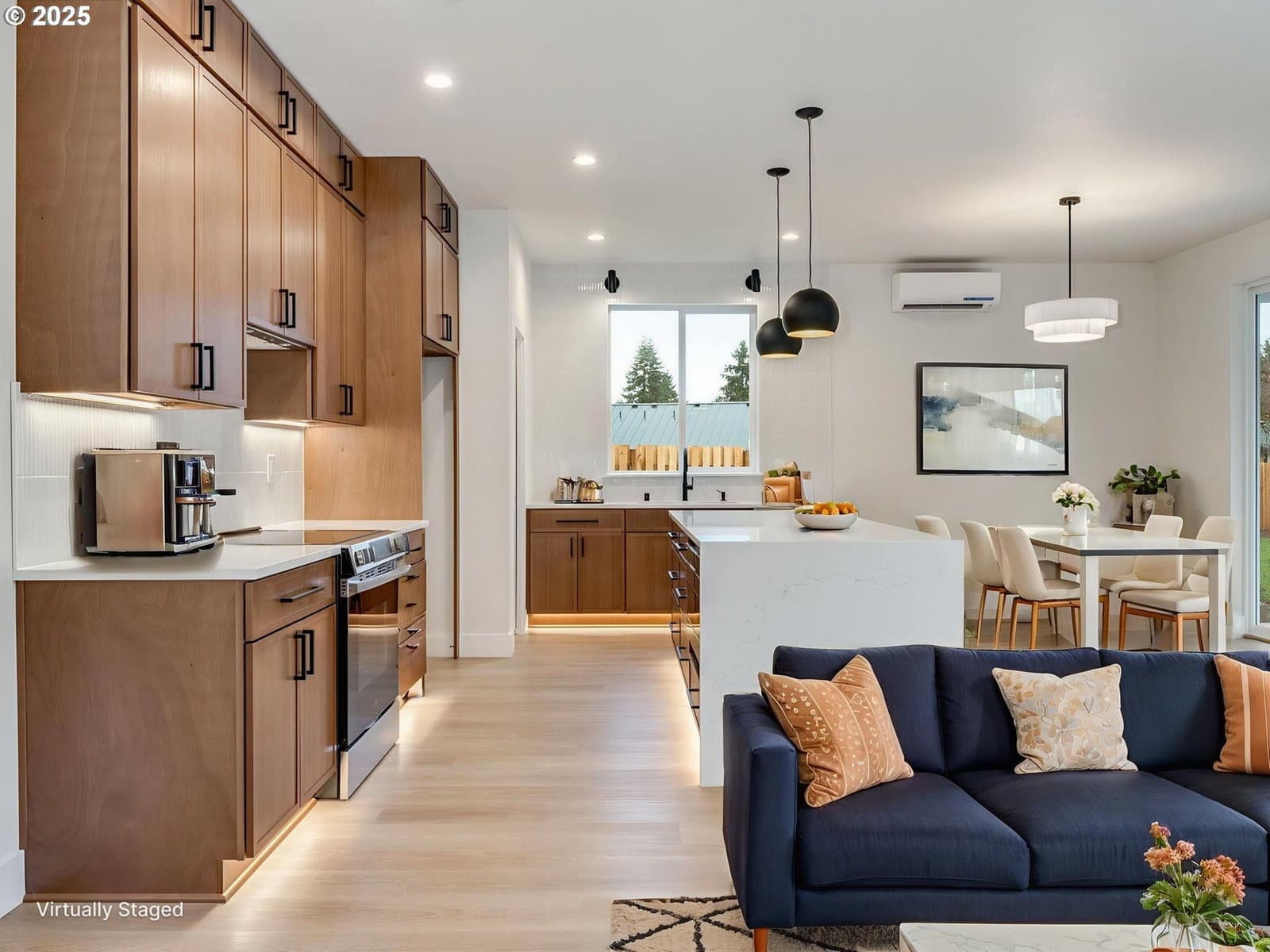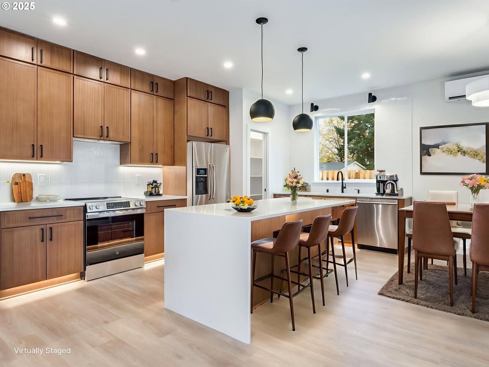 Discover contemporary luxury in this brand-new, 1,725 sq. ft., 2-story home. Inside, 9-foot and vaulted ceilings soar over seamless luxury vinyl plank floors, leading you to a showstopper kitchen featuring darker cabinets, gold accents, a massive quartz waterfall island, a walk-in pantry, and a full-height tile backsplash. All 3 bedrooms are privately located upstairs, including the large master suite which boasts a walk-in closet and a spa-like tile bath with a double sink vanity and walk-in shower. Situated on a generous 6,928 sq. ft. lot, this stunning home is complete with full landscaping and fencing, making it perfectly move-in ready. Driving Directions 4200 NE 143RD AVE, VANCOUVER, WA 98682 45.6526,-122.5265