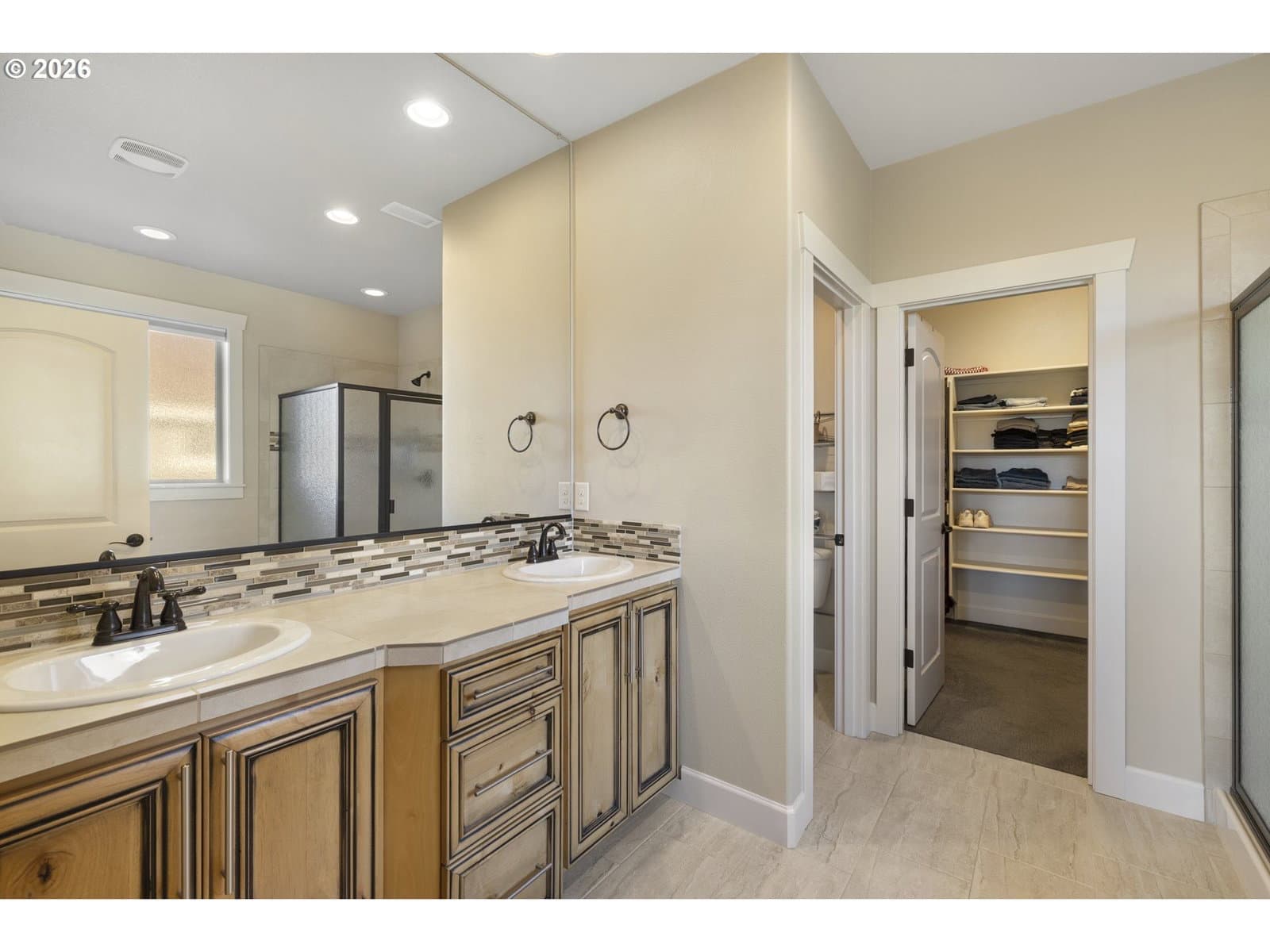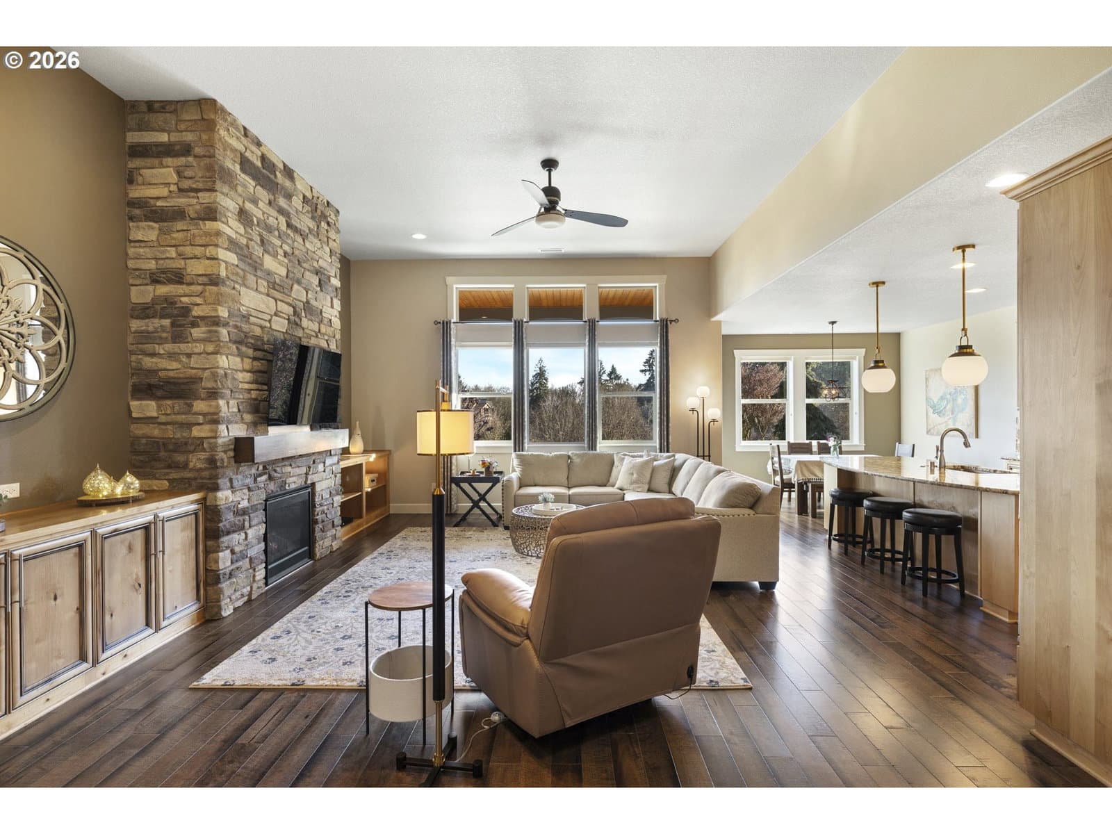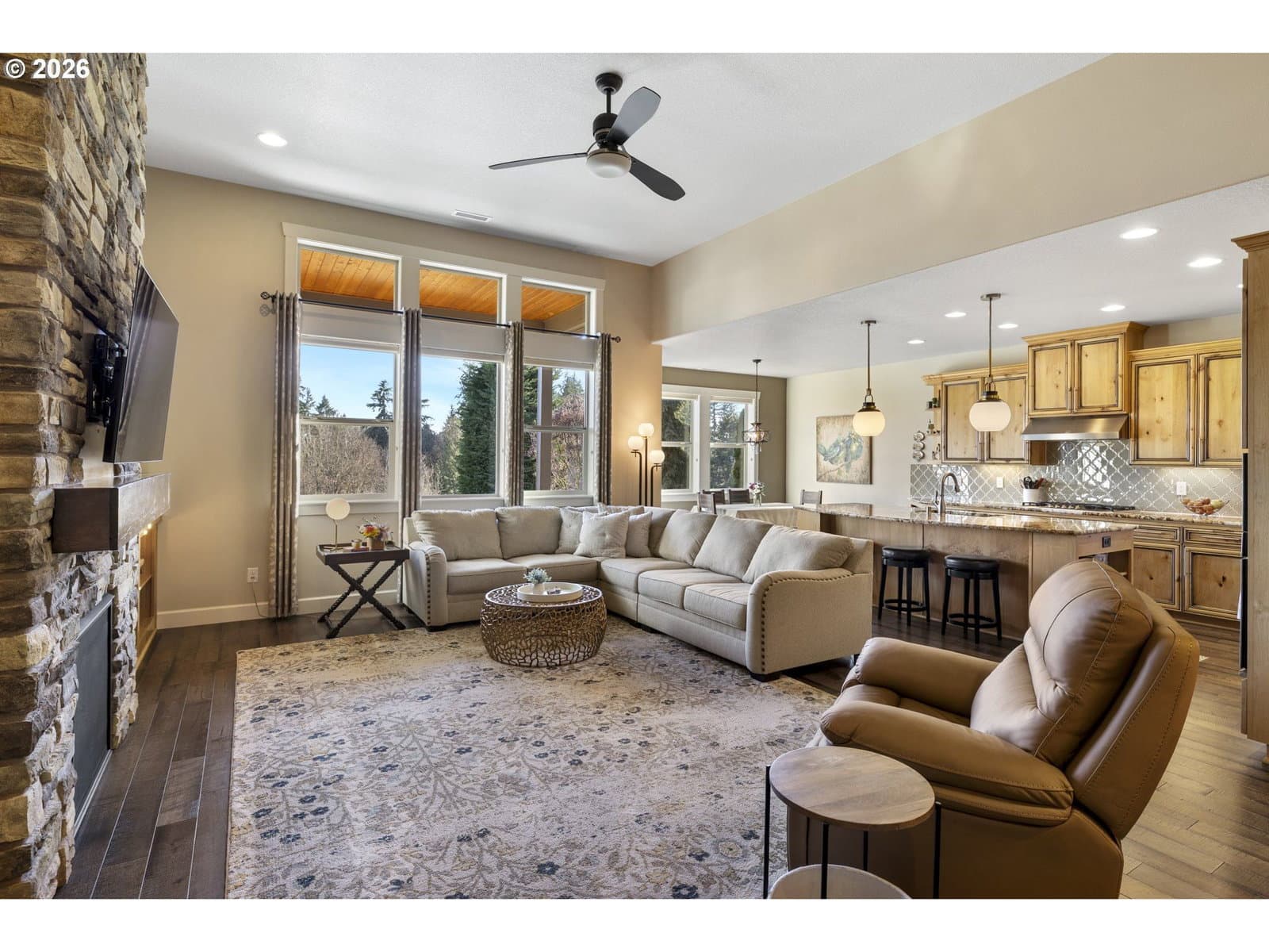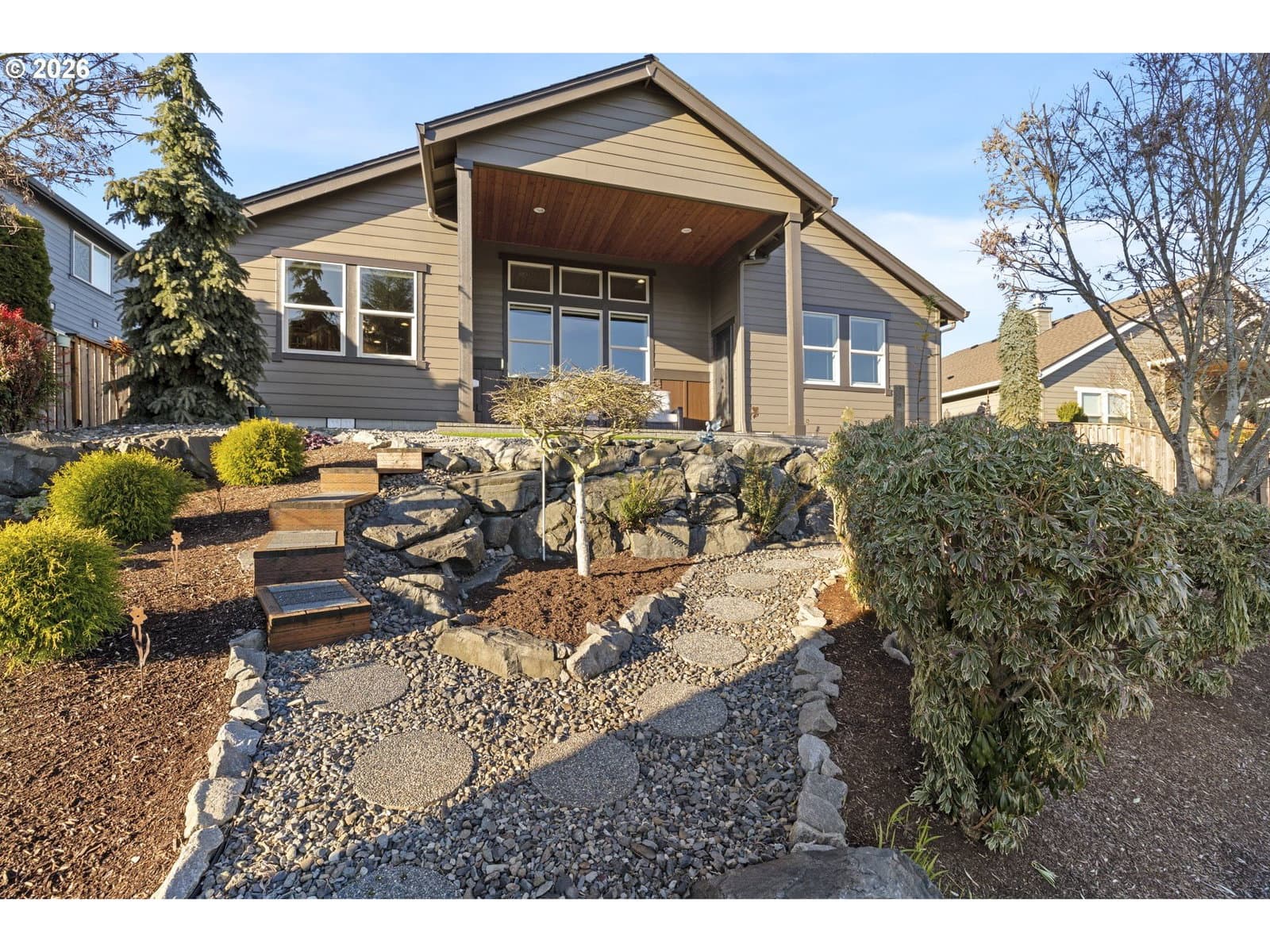 Home backs to a greenbelt and features an insulated five-car garage. Experience effortless one-level living in this impeccably maintained, one-owner home built in 2015, where exceptional craftsmanship reflects the skill of the original owner, a master carpenter by trade. This thoughtfully designed 4-bedroom, 3.5 bath layout offers ideal flexibility for guests, multigenerational living, or work-from-home needs. A rare and desirable feature, the fourth bedroom includes its own ensuite bath and walk-in closet. Two additional bedrooms share a Jack-and-Jill bath, while the private primary suite is set apart from the other bedrooms and features a relaxing soaker tub, walk-in shower, and a walk-in closet with shelving. The open-concept design seamlessly connects the great room, eating nook, and formal dining area, creating an ideal flow for everyday living and entertaining. Expansive windows frame peaceful greenbelt views maintained by the HOA. Retractable Wizard screen doors from both the eating nook and primary suite lead to the covered porch, inviting fresh air while preserving comfort. The terraced backyard is designed for low-maintenance enjoyment with paver walkways, artificial turf, and a mature magnolia tree that delivers stunning spring blooms. A full sprinkler system keeps the front yard lush year-round. A truly rare highlight is the five-car garage configuration, including two tandem-depth bays, a standard bay, and a dedicated workshop with built-in shelving. The stand alone "built in" freezer remains. This extraordinary space accommodates vehicles, recreational toys, tools, and seasonal storage with room to spare, a standout feature for car enthusiasts, hobbyists, and those who value exceptional organization. Located minutes from shopping, downtown Ridgefield, the dog park, and the Wildlife Refuge, this home also offers access to highly rated Ridgefield schools, community parks, convenient freeway access, and over 35 miles of scenic walking trails nearby.