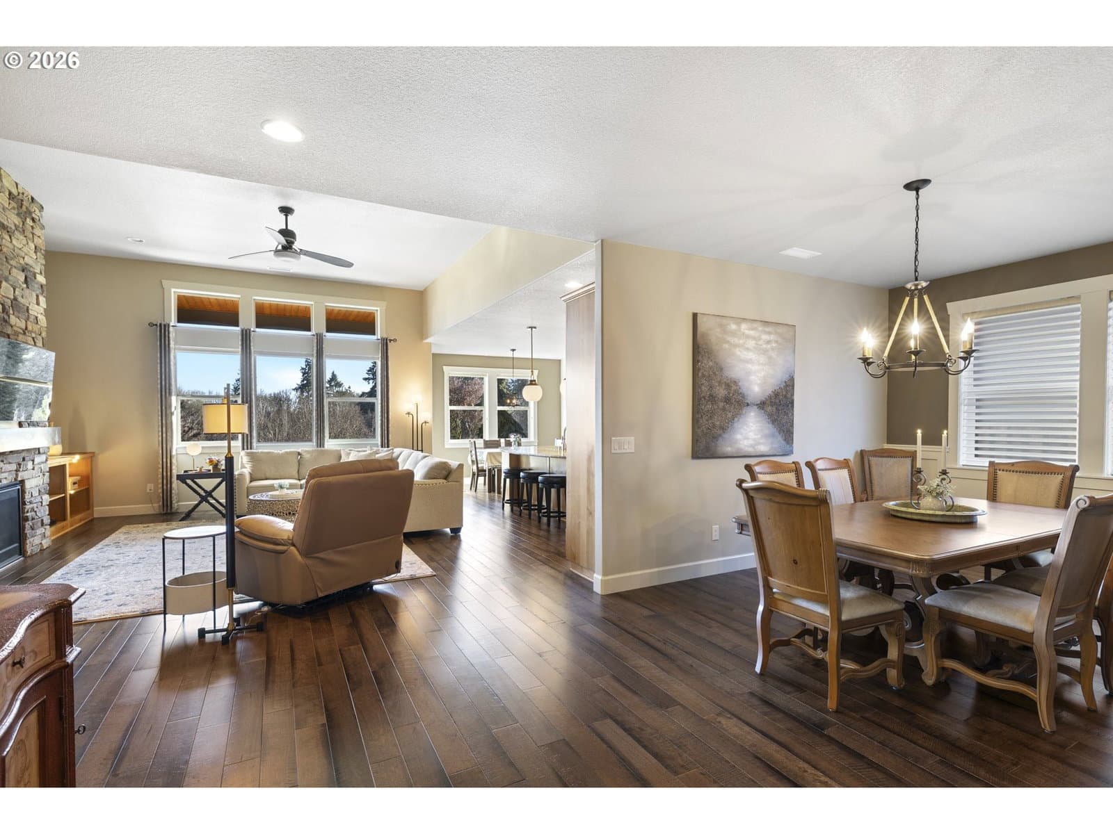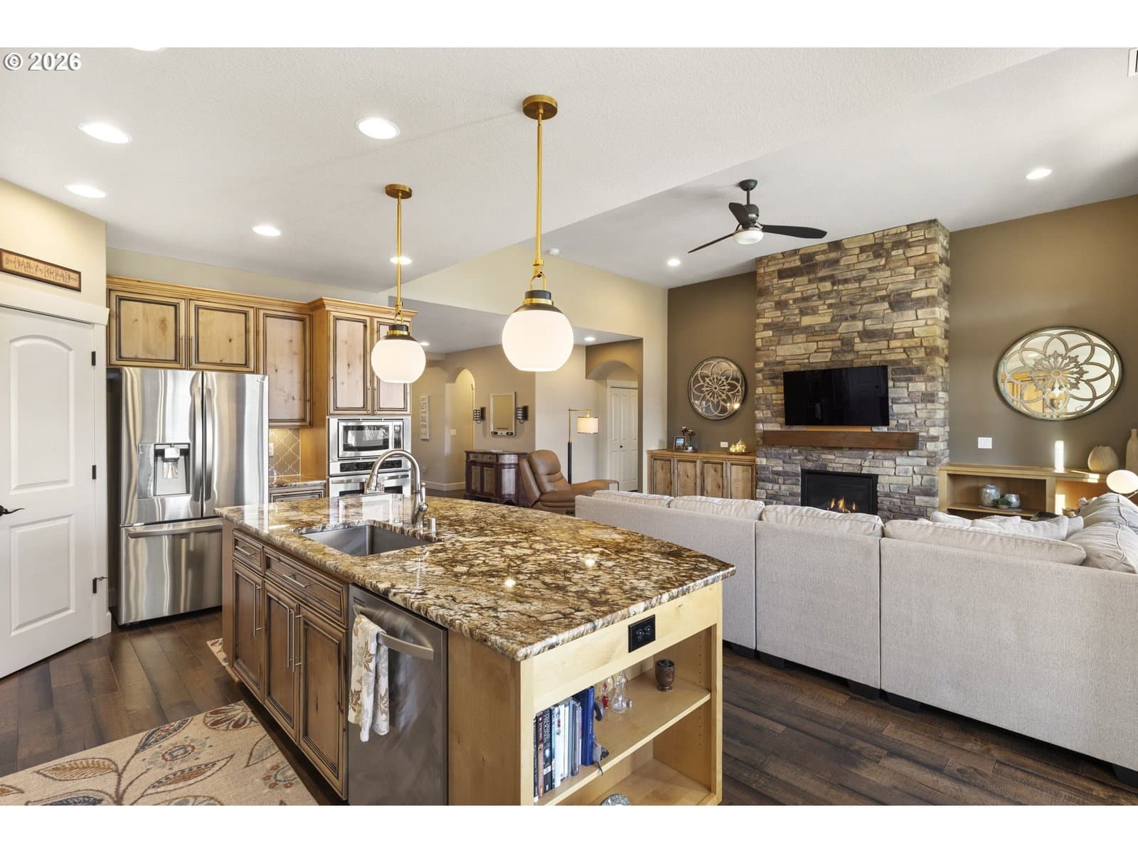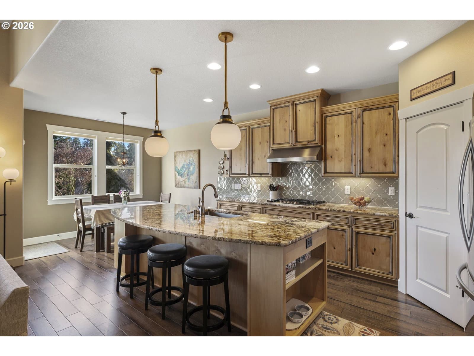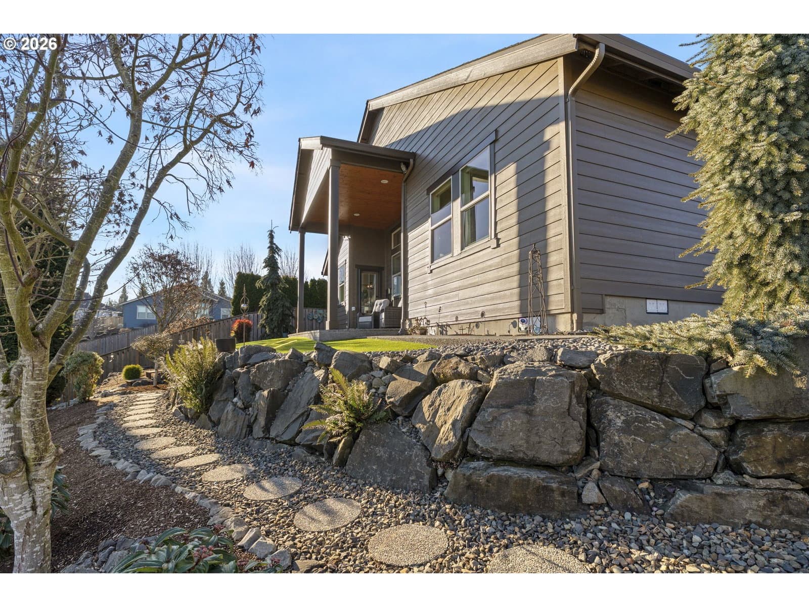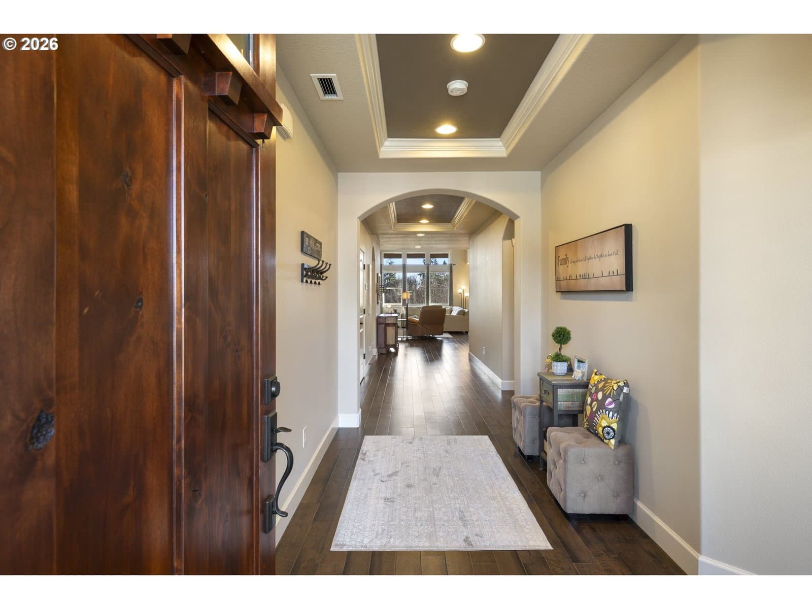 Home backs to a greenbelt and features an insulated five-car garage. Experience effortless one-level living in this impeccably maintained, one-owner home built in 2015, where exceptional craftsmanship reflects the skill of the original owner, a master carpenter by trade. This thoughtfully designed 4-bedroom, 3.5 bath layout offers ideal flexibility for guests, multigenerational living, or work-from-home needs. A rare and desirable feature, the fourth bedroom includes its own ensuite bath and walk-in closet. Two additional bedrooms share a Jack-and-Jill bath, while the private primary suite is set apart from the other bedrooms and features a relaxing soaker tub, walk-in shower, and a walk-in closet with shelving. The open-concept design seamlessly connects the great room, eating nook, and formal dining area, creating an ideal flow for everyday living and entertaining. Expansive windows frame peaceful greenbelt views maintained by the HOA. Retractable Wizard screen doors from both the eating nook and primary suite lead to the covered porch, inviting fresh air while preserving comfort. The terraced backyard is designed for low-maintenance enjoyment with paver walkways, artificial turf, and a mature magnolia tree that delivers stunning spring blooms. A full sprinkler system keeps the front yard lush year-round. A truly rare highlight is the five-car garage configuration, including two tandem-depth bays, a standard bay, and a dedicated workshop with built-in shelving. The stand alone "built in" freezer remains. This extraordinary space accommodates vehicles, recreational toys, tools, and seasonal storage with room to spare, a standout feature for car enthusiasts, hobbyists, and those who value exceptional organization. Located minutes from shopping, downtown Ridgefield, the dog park, and the Wildlife Refuge, this home also offers access to highly rated Ridgefield schools, community parks, convenient freeway access, and over 35 miles of scenic walking trails nearby.
