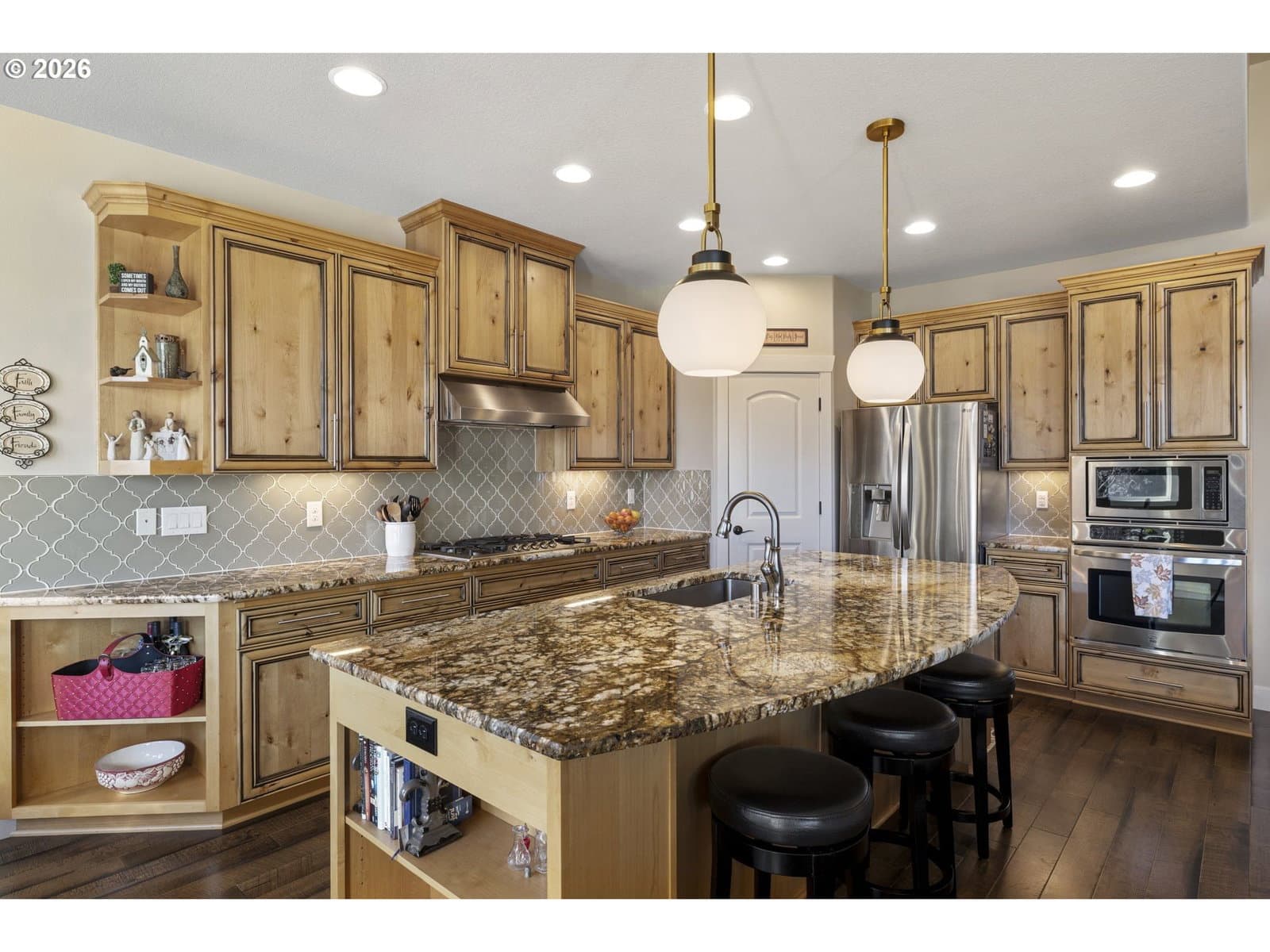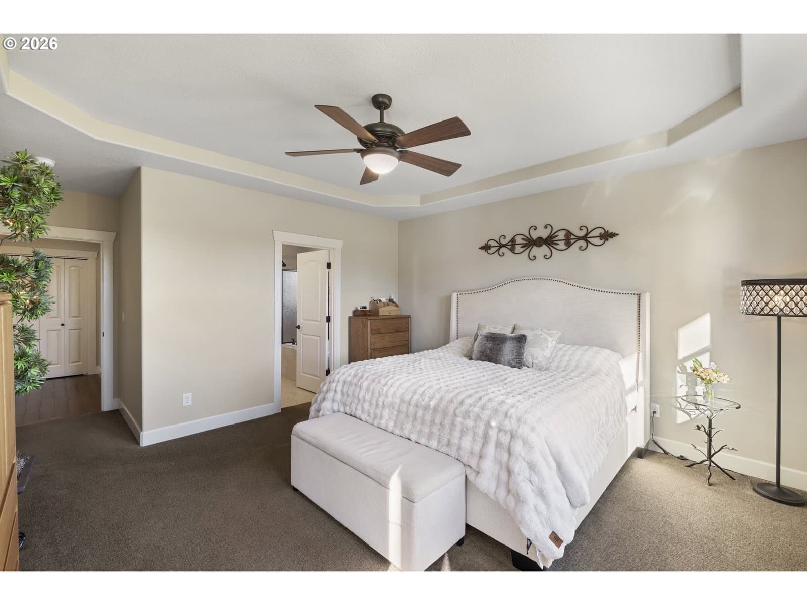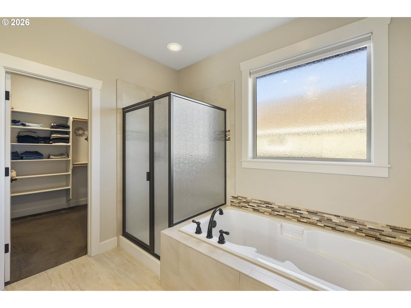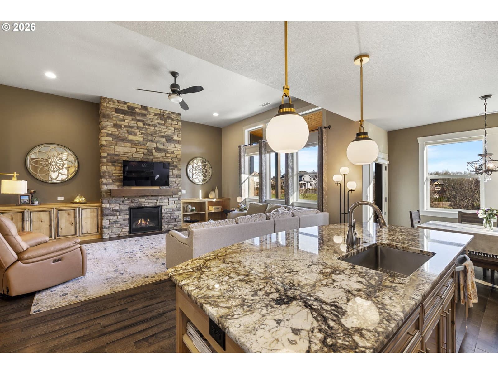 Home backs to a greenbelt and features an insulated five-car garage. Experience effortless one-level living in this impeccably maintained, one-owner home built in 2015, where exceptional craftsmanship reflects the skill of the original owner, a master carpenter by trade. This thoughtfully designed 4-bedroom, 3.5 bath layout offers ideal flexibility for guests, multigenerational living, or work-from-home needs. A rare and desirable feature, the fourth bedroom includes its own ensuite bath and walk-in closet. Two additional bedrooms share a Jack-and-Jill bath, while the private primary suite is set apart from the other bedrooms and features a relaxing soaker tub, walk-in shower, and a walk-in closet with shelving. The open-concept design seamlessly connects the great room, eating nook, and formal dining area, creating an ideal flow for everyday living and entertaining. Expansive windows frame peaceful greenbelt views maintained by the HOA. Retractable Wizard screen doors from both the eating nook and primary suite lead to the covered porch, inviting fresh air while preserving comfort. The terraced backyard is designed for low-maintenance enjoyment with paver walkways, artificial turf, and a mature magnolia tree that delivers stunning spring blooms. A full sprinkler system keeps the front yard lush year-round. A truly rare highlight is the five-car garage configuration, including two tandem-depth bays, a standard bay, and a dedicated workshop with built-in shelving. The stand alone "built in" freezer remains. This extraordinary space accommodates vehicles, recreational toys, tools, and seasonal storage with room to spare, a standout feature for car enthusiasts, hobbyists, and those who value exceptional organization. Located minutes from shopping, downtown Ridgefield, the dog park, and the Wildlife Refuge, this home also offers access to highly rated Ridgefield schools, community parks, convenient freeway access, and over 35 miles of scenic walking trails nearby.