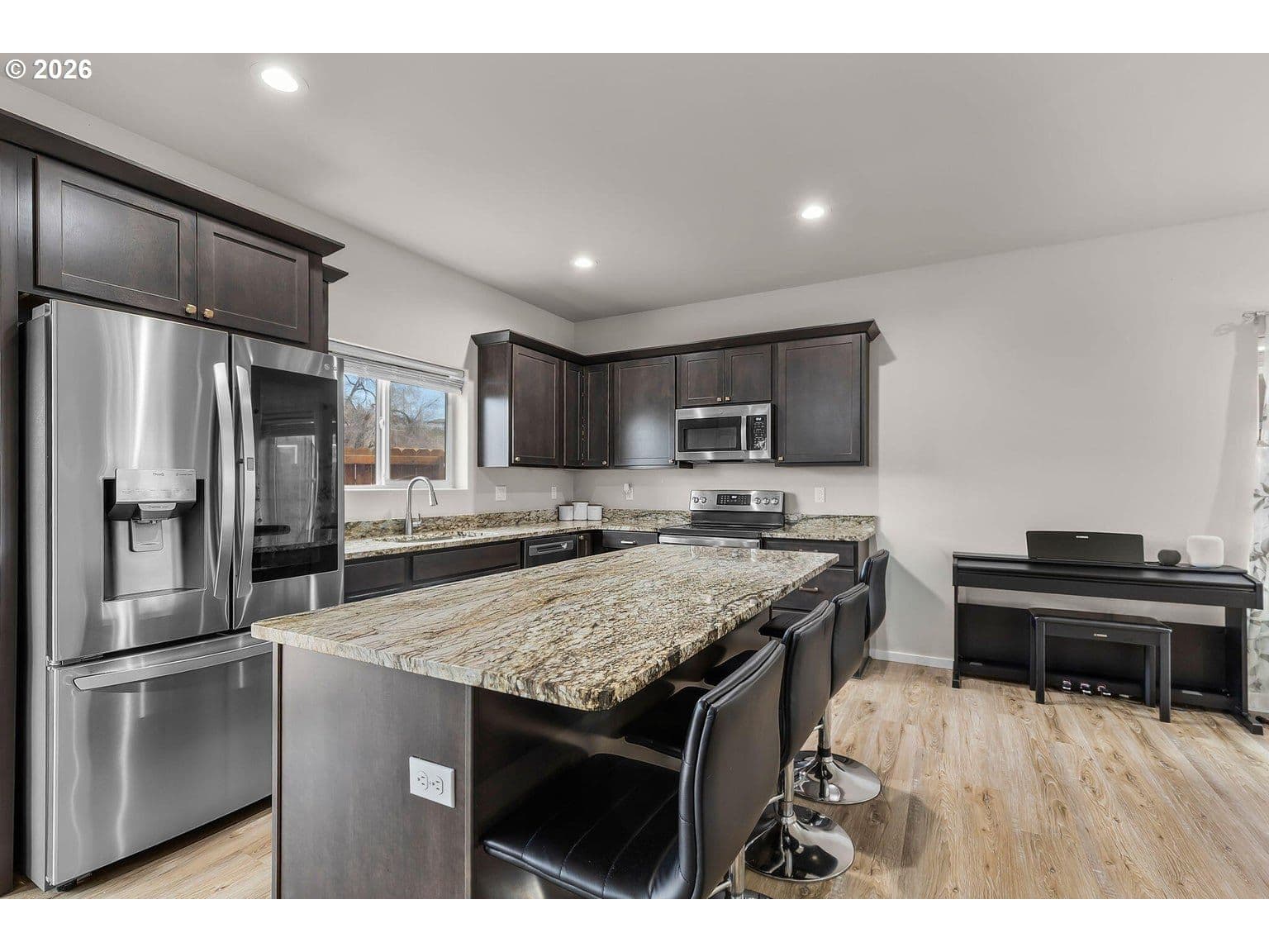 Don't miss this like new home in NE Prineville! Home ftrs an open floorplan w/an abundance of natural light throughout & durable LVP flooring in main living areas. Bright kitchen ftrs granite counters, large island w/bfast bar seating, pantry, an abundance of cabinetry + prep space & large eating area w/sliding doors to the covered back deck. Well appointed primary suite w/dual vanities & shower-tub combo. 2 addtnl rooms w/shared full bath. Central A/C & electric heat, one-car attached garage, fenced backyard w/shed, extended gravel parking -- ideal for all your Central Oregon gear & toys. Backs to the Tracks to Trails corridor & just 1/2 block to Ochoco Creek Park & the 1.25-acre bike park ftring pump tracks, jumps & skills course! Steps to 10-mile Ochoco Creek bike path, outdoor amphitheater, pickleball & basketball courts & beloved community events. Hiking, fishing, Crooked River Canyon & two local golf courses just minutes away. Come experience the best of Oregon outdoor living!