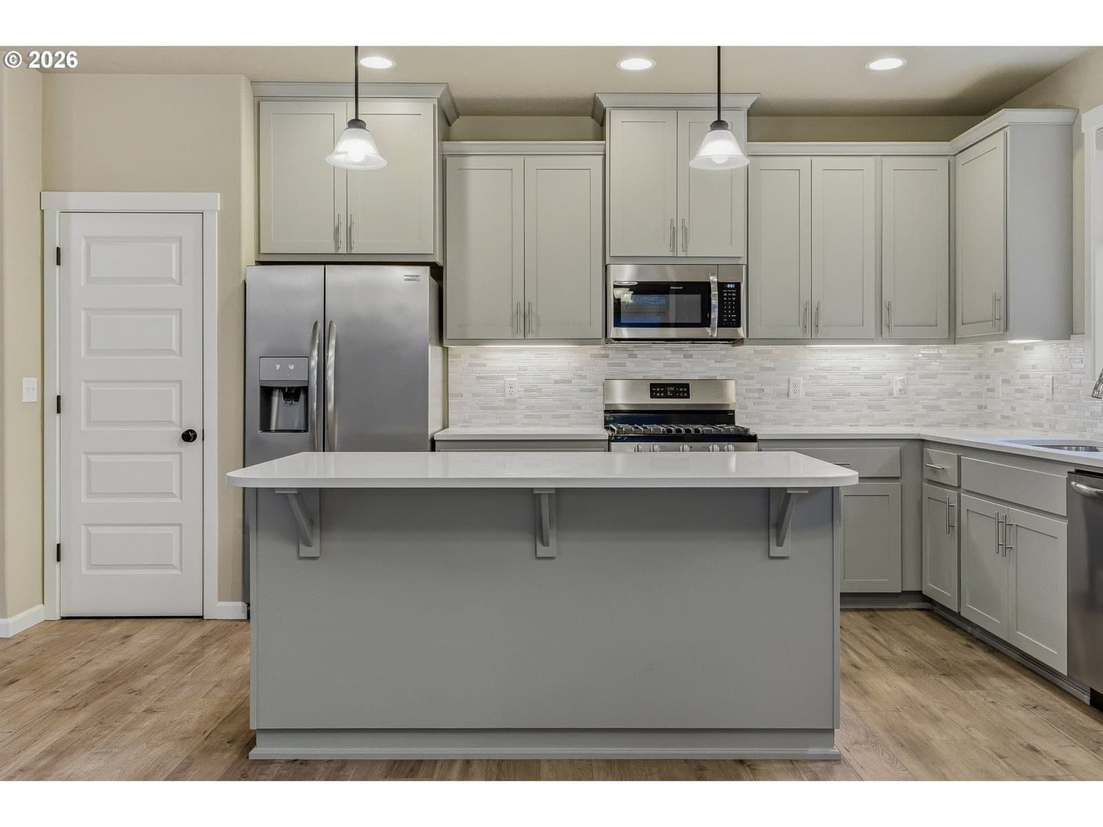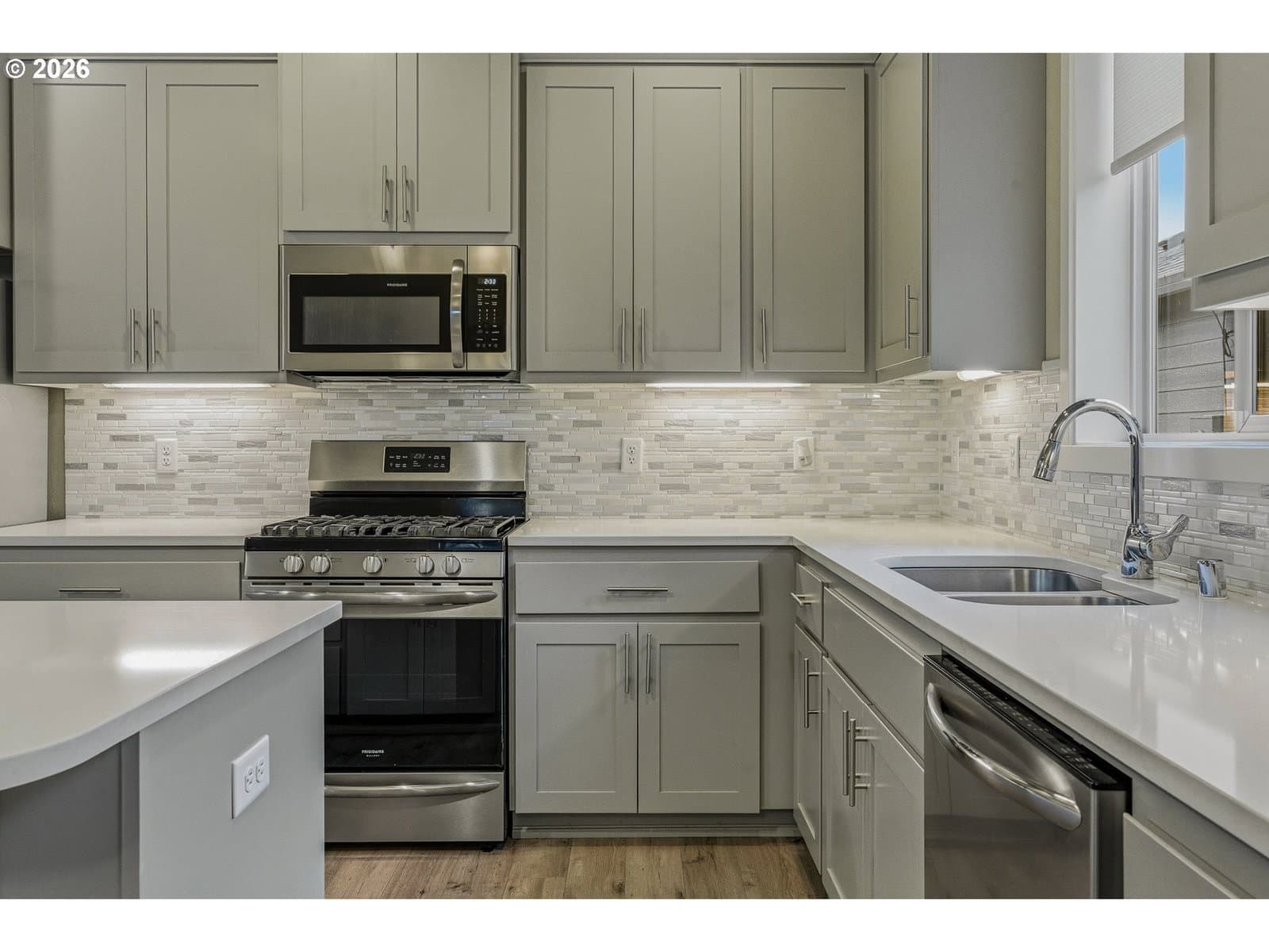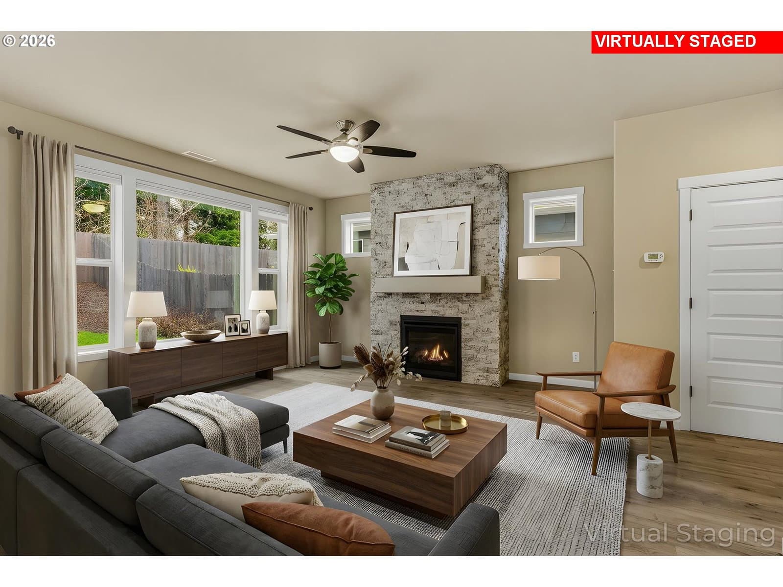 Located in a great residential neighborhood in Vancouver, this beautifully designed two-story home offers comfort, style, and convenience just minutes from everyday amenities. A covered front porch welcomes you inside to an open-concept main floor featuring a spacious living room with a striking gas fireplace and floor-to-ceiling stone hearth. The kitchen is thoughtfully appointed with stainless steel appliances, a center island, tiled backsplash, pantry, and an adjoining dining area perfect for gatherings. A sliding door leads to the covered back patio overlooking the treed and private fully fenced backyard—ideal for year-round outdoor enjoyment. The sprinkler drip system provides ease of upkeep. The main level also includes a convenient half bath. Upstairs, you’ll find three bedrooms, including a generous primary suite with double-door entry, a private en suite with double vanity, and a walk-in closet. A full hallway bath and a separate laundry room with utility sink add everyday functionality to this well-appointed home. This home has many upgrades including the soft close cabinets and pull out drawers in the kitchen, rounded corners for sophistication, and natural gas heating and cooling systems.