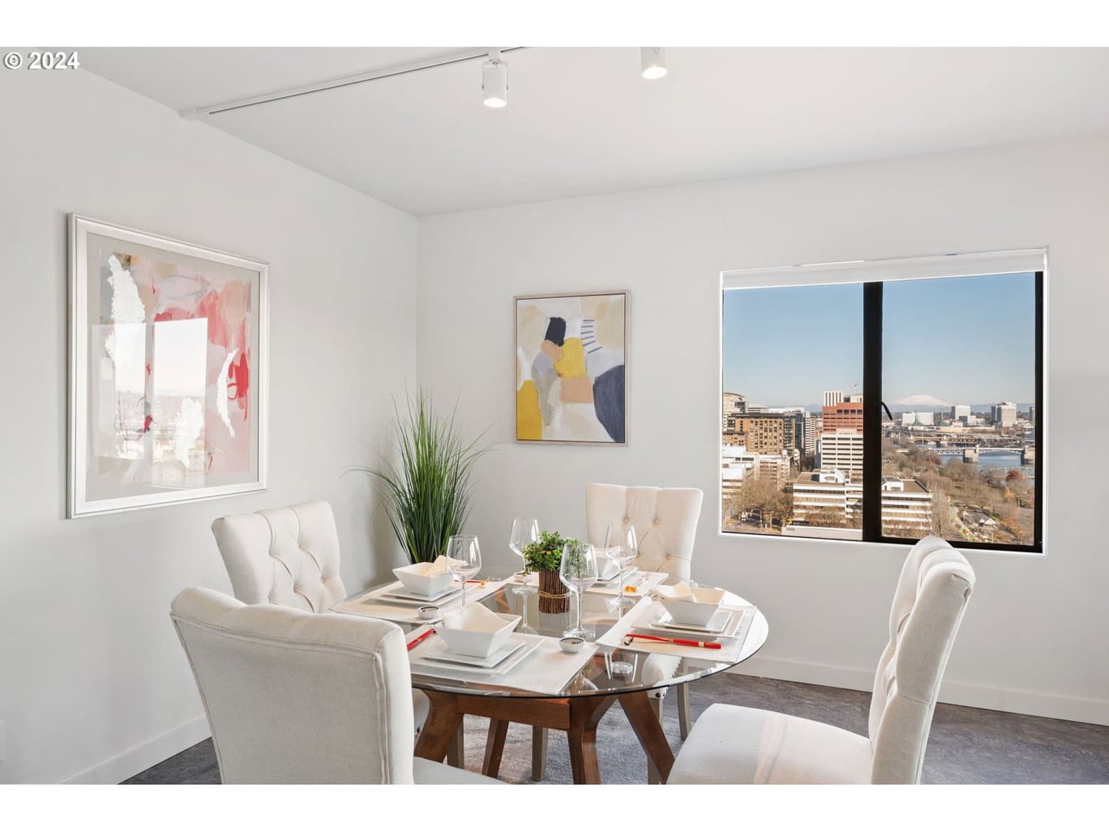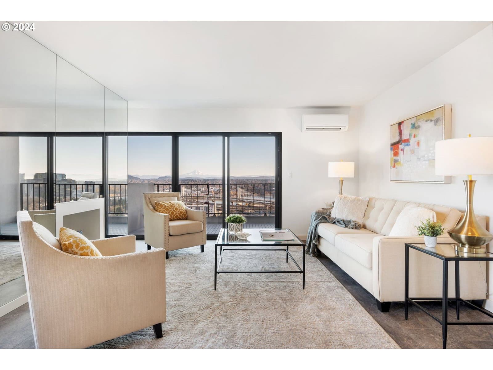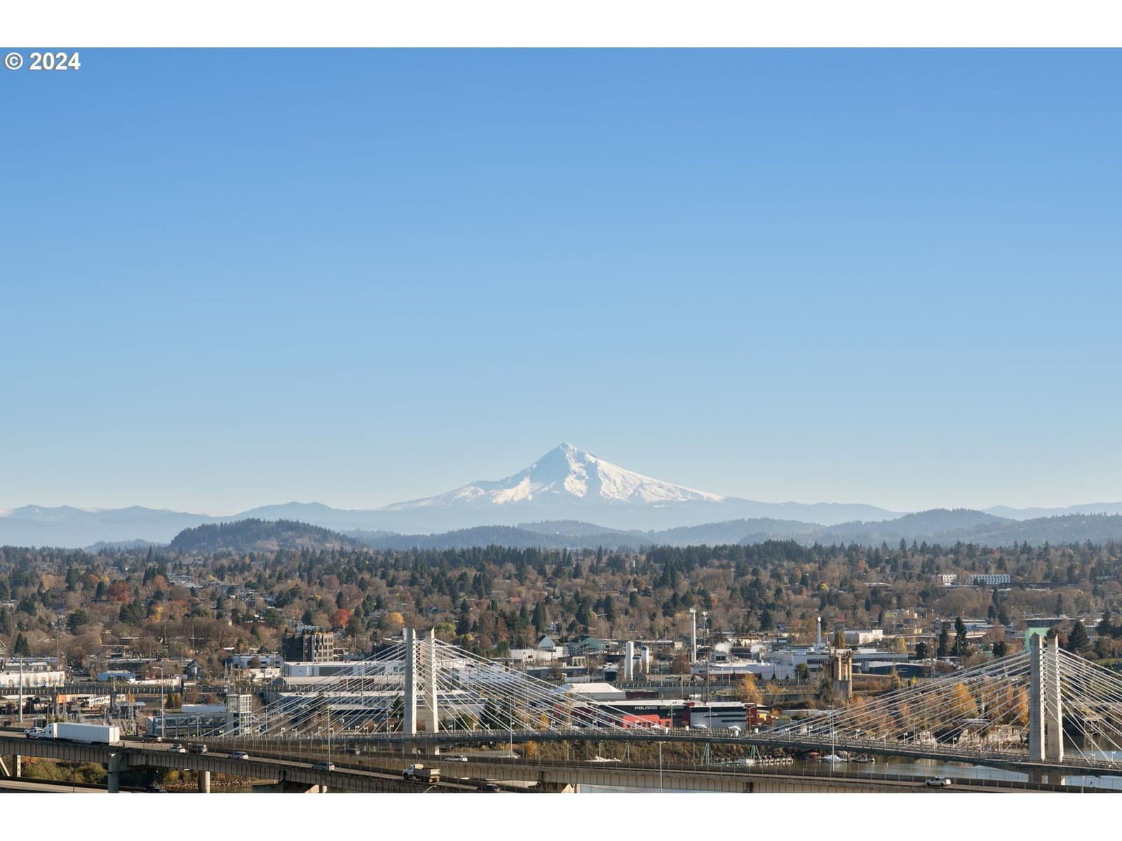This beautifully remodeled condo showcases an open and airy layout that perfectly complements its breathtaking panoramic views of Mt. Hood, Mt. St. Helens, and the Willamette River. Whether it's the twinkling city lights at night or the serene sunrises in the morning, this property offers a stunning backdrop for daily living. The total remodel features a gourmet kitchen with custom cabinets and stainless steel appliances, an eating bar and family room with new slider that opens to large west facing deck with city and west hills views. The spacious living and dining areas seamlessly transition to an expansive east-facing deck, ideal for entertaining or simply enjoying the incredible mountain and river views. The primary suite is a true retreat, offering deck access through a private slider, a walk-in closet, and a beautifully renovated bath complete with a walk-in shower. The second bedroom is equally inviting, equipped with its own west-facing balcony and a dedicated remodeled bath.This condo's amenities extend beyond its walls. Residents can enjoy access to a brand new saltwater indoor pool, jacuzzi, and updated locker rooms in the Sivers Center. HOA includes two community rooms leading to patios and pools designed for social gatherings, plus workout facilities, 24 hour concierge and 53 guest parking spaces unheard of downtown, conveniently located on the Max line and bus routes, just a short walk from the streetcar one block north, close to OHSU and Portland State. Stroll the Halprin Park Sequence to the Downtown Cultural center or RiverPlace Esplanade shops and restaurants. Vibrant city living at its best.