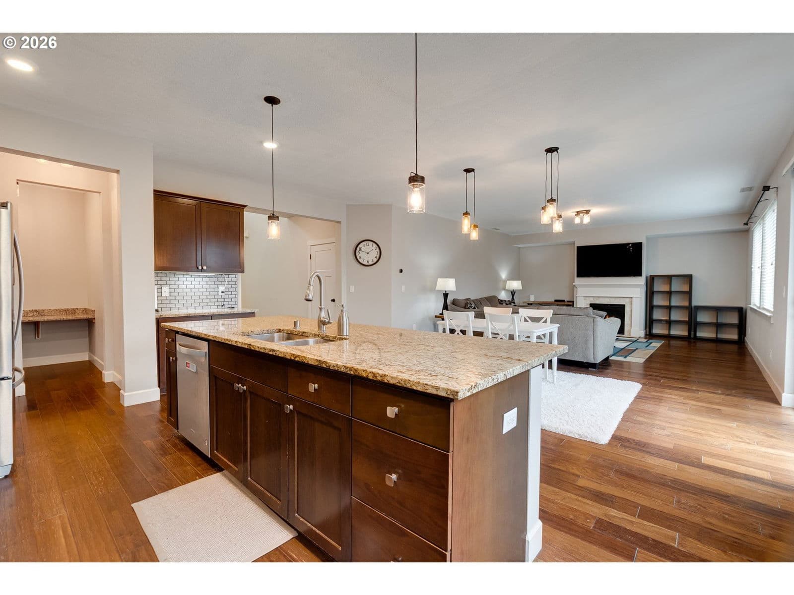 Beautifully maintained Craftsman-style home featuring open-concept living and thoughtful design throughout. The main level showcases stunning slab granite countertops in both the kitchen and dedicated office/workspace areas, complemented by stylish stainless-steel appliances, gas cooktop, double sink, and expansive island ideal for gathering, entertaining, and everyday living. The spacious living room is anchored by a cozy travertine-lined gas fireplace, creating a warm and inviting focal point while maintaining clean modern lines. Large windows and sliding doors bring in natural light and connect seamlessly to the fully fenced backyard. Perfect for relaxing, grilling, or entertaining. Upstairs, the versatile loft area offers incredible flexibility and has been virtually staged as a recreation and entertainment space, ideal for pool table, media lounge, playroom, or additional family gathering area. The generous primary suite includes a walk-in-closet and well-appointed bath, while additional bedrooms and/or bonus space provide flexibility for guests, hobbies, or work-from-home living. Located in a quiet, well maintained, and peaceful neighborhood within the desirable Greater Brush Prairie area, this home offers convenient access to local amenities while maintaining a serene residential feel. Nearby attractions include Alderbrook Park with trails and recreation, neighborhood parks, and easy access to Vancouver's shopping, dining. This move-in-ready home combines comfort, versatility, and lifestyle in a sought-after location.