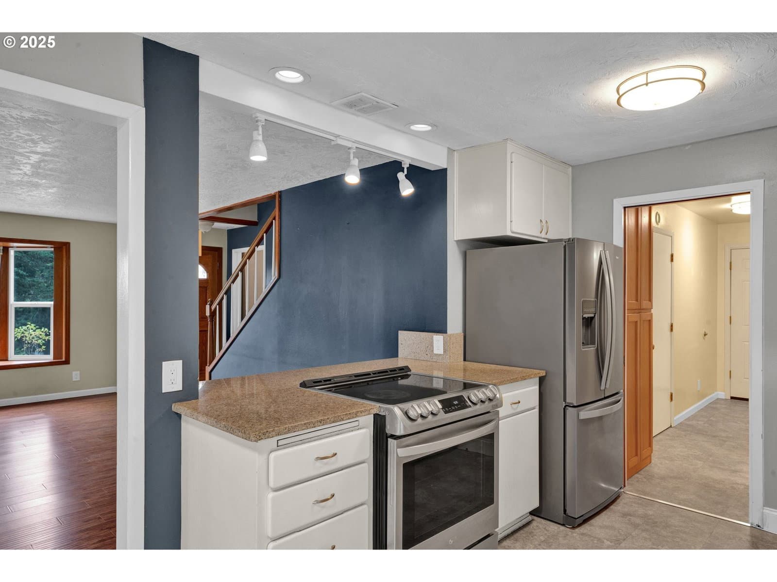 Step inside to a comfortably designed living space with a focus on light and functionality. The main floor features a living room with a big bay window. The galley kitchen boasts granite countertops, a convenient breakfast bar, and French doors that lead directly out to a lovely covered patio—perfect for year-round outdoor cooking and dining. This home offers great flexibility with a one-car garage that opens into a laundry room, complete with a half bath, easily converted to a whole bath. The laundry room conveniently connects to the kitchen and the 4th bedroom. This downstairs room, with its half-bath access, can easily serve as a comfortable downstairs primary suite, a family room, a private office, or a formal dining room, adapting perfectly to your needs. Ascend the stairs to find a full bathroom along with 3 total bedrooms, one being your own private sanctuary: a huge upstairs primary suite. Massive windows and skylights bathe the room in natural light. The exquisite en-suite bathroom is a true retreat, featuring tile work, a glass-stall shower, a luxurious and deep jetted tub for ultimate relaxation, and tons of storage. As a final touch of convenience, the primary bathroom also includes a dedicated laundry chute! Outside, the large lot offers a tiered raised garden bed right off the covered patio—ideal for cultivating your kitchen herbs or flowers. Tucked away in the bottom corner of the yard is a serene cove with a fire pit, a perfect spot for cozy evenings and marshmallow roasting. This versatile home offers a premium location, remarkable indoor-outdoor living, and a truly stunning primary suite. This highly sought-after area offers incredible access to Eugene's best amenities; moments away from shopping and dining. Outdoor enthusiasts will adore the proximity to Eugene's extensive park and trail systems. This home has a lot to offer; the perfect blend of suburban tranquility and urban accessibility, just waiting for your touches.