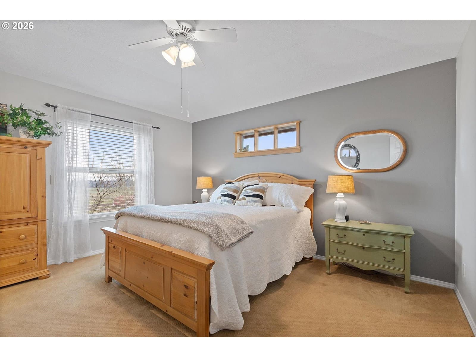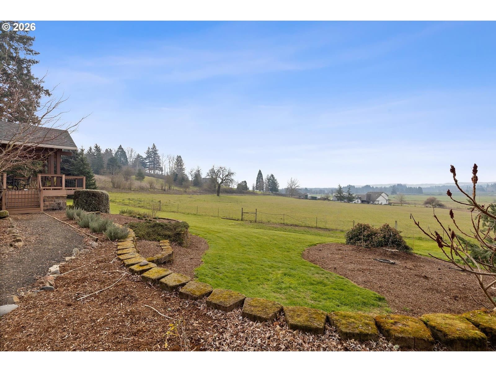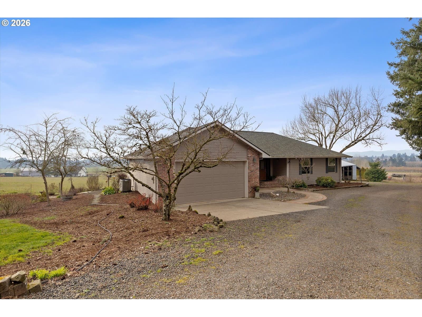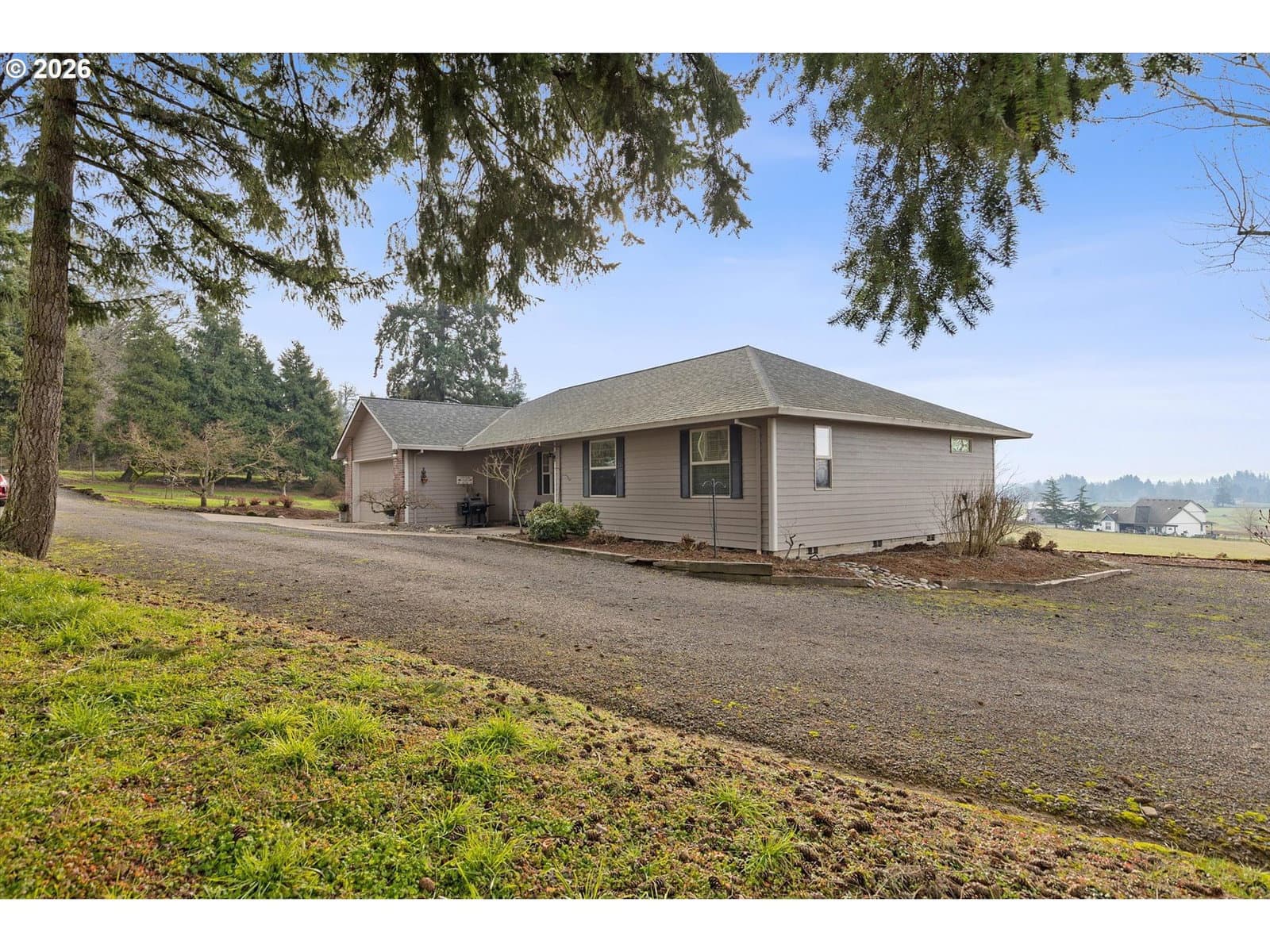 This charming single-level retreat sits on 5 acres of picturesque land in a setting complete with coast range sunsets! Welcome to this stunning home with open living spaces that seamlessly flow between the kitchen featuring stainless steel appliances and abundant counter space, the dining area, and the living room/sitting area with built-ins. This well-designed home offers a modern and spacious layout, perfect for entertaining and everyday living.The spacious en suite comes with a beautiful walk-in closet and well appointed bathroom. The garage has an abundance of storage and leads to a laundry room / mudroom with washer and dryer. An inviting covered deck area provides a contemplative view rain or shine and is perfect for entertaining in warmer months. Outside, you will also discover a spacious 48’ x 30’ open shop space with two bays to work or park your vehicles as well as two horse stalls and a tack room with an attached 14’ x 30’ covered space which will accommodate plenty of storage for your tractor, quad, or anything else you can imagine. The home includes a well system which is supported by a 1500 gallon storage tank to ensure an ample supply year-round. Ideally located near Newberg, Dayton, and McMinnville, this property offers both tranquility and convenience in a sought-after area.