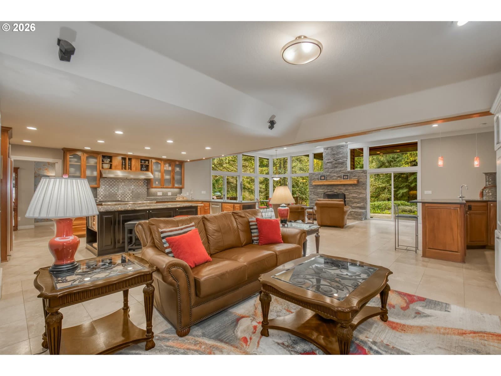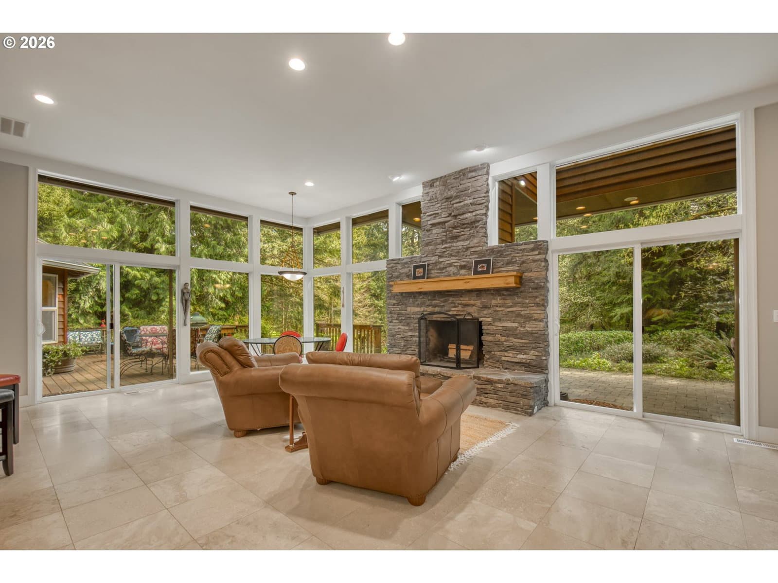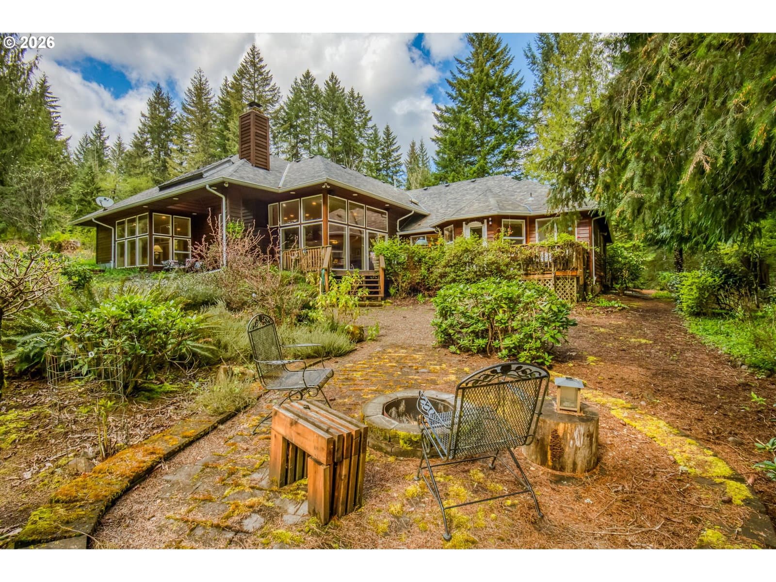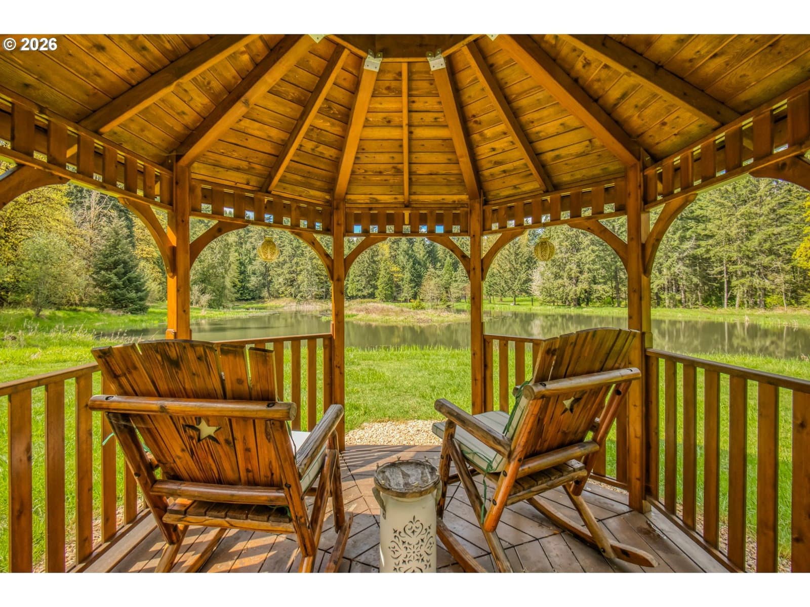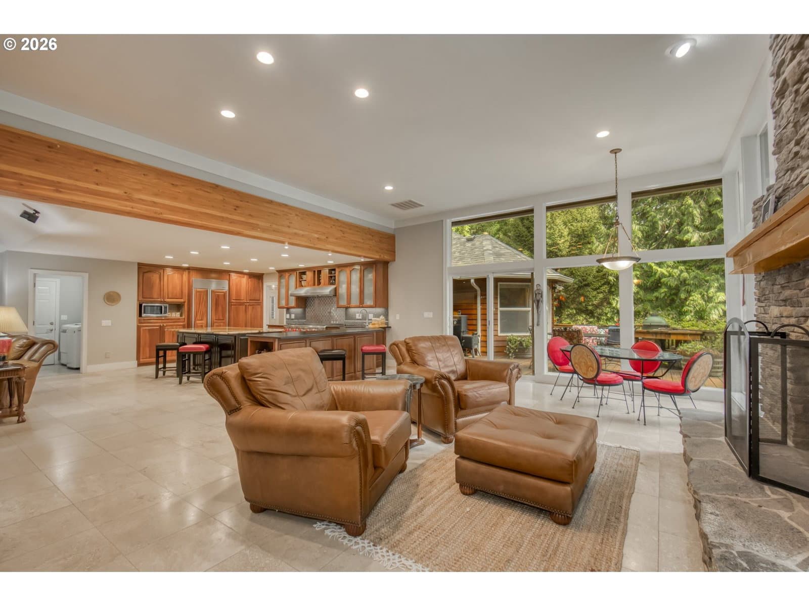 Set on 29.5 private, wooded acres, this cedar and brick estate offers a perfect blend of luxury and rural tranquility. The open-concept interior is anchored by a massive architectural beam and high ceilings, creating an inviting space for both daily living and formal entertaining, all set atop elegant travertine flooring that flows throughout the main living area. The gourmet kitchen is a true centerpiece, featuring durable ceramic tile, custom Brazilian mahogany cabinets, a built-in Sub-Zero refrigerator, and a professional-grade Wolf 6-burner stove with a griddle and double oven. Finished with leather-textured granite and a large island with storage on both sides, the kitchen flows into a great room highlighted by custom built-ins and a magnificent stacked stone fireplace. Large windows throughout provide peaceful views of the 3-acre pond and meadow. The thoughtful split floor plan ensures maximum privacy. The primary suite sits on its own wing, boasting a massive walk-in closet with a hidden bonus storage room and a spa-like ensuite. This private retreat features heated travertine floors, onyx countertops, and a walk-in shower. On the opposite side of the home, is a second primary suite, complete with a jetted tub and walk-in shower. A grand study with chair rail accents provides a sophisticated space for a home office. The exterior is designed to embrace the natural surroundings. Relax on the two-level deck accessible from the great room and secondary bedroom or the covered patio featuring a large skylight. The grounds are a nature lover’s dream, with lush landscaping, walking paths for viewing deer and elk, and a productive orchard of apple, pear, peach, and plum trees. The property is fully equipped for hobbies and utility with a barn, greenhouse, storage shed, gazebo, and fenced raised-bed garden. Modern essentials like a whole-house generator, two-car garage, and additional carport complete this exceptional private retreat.