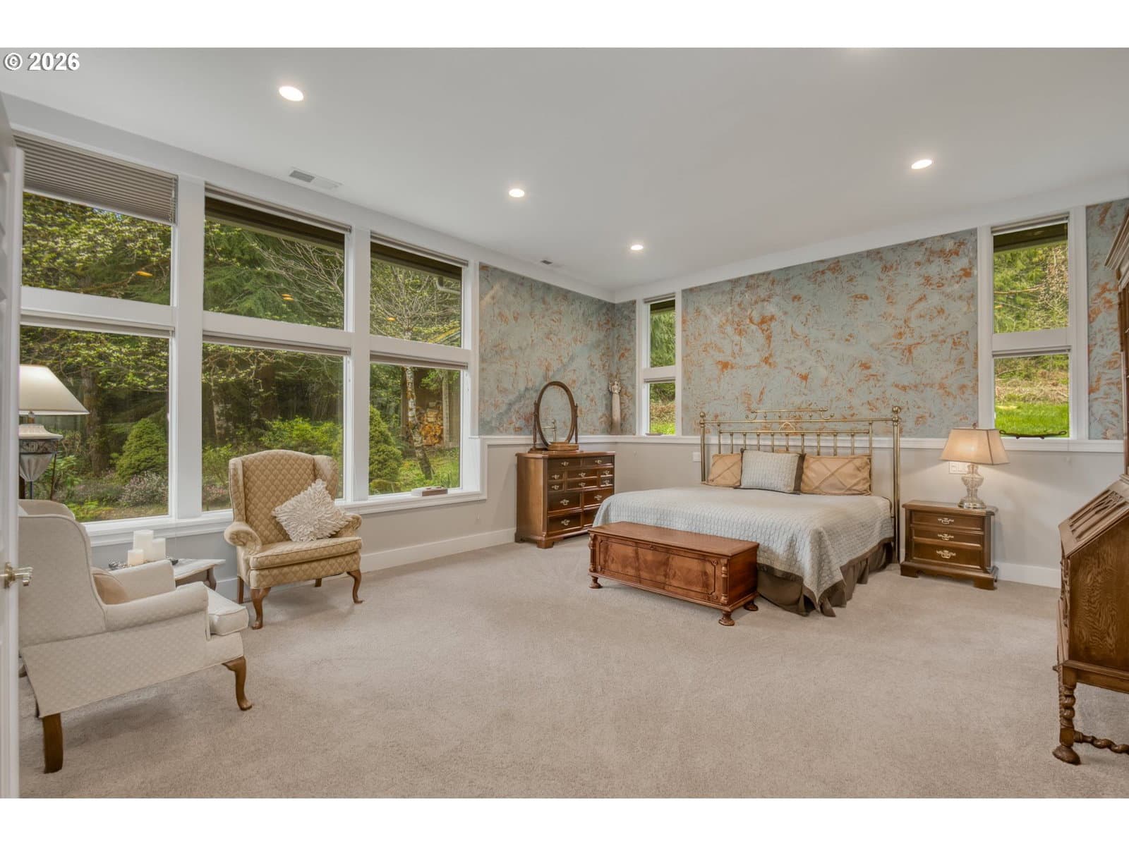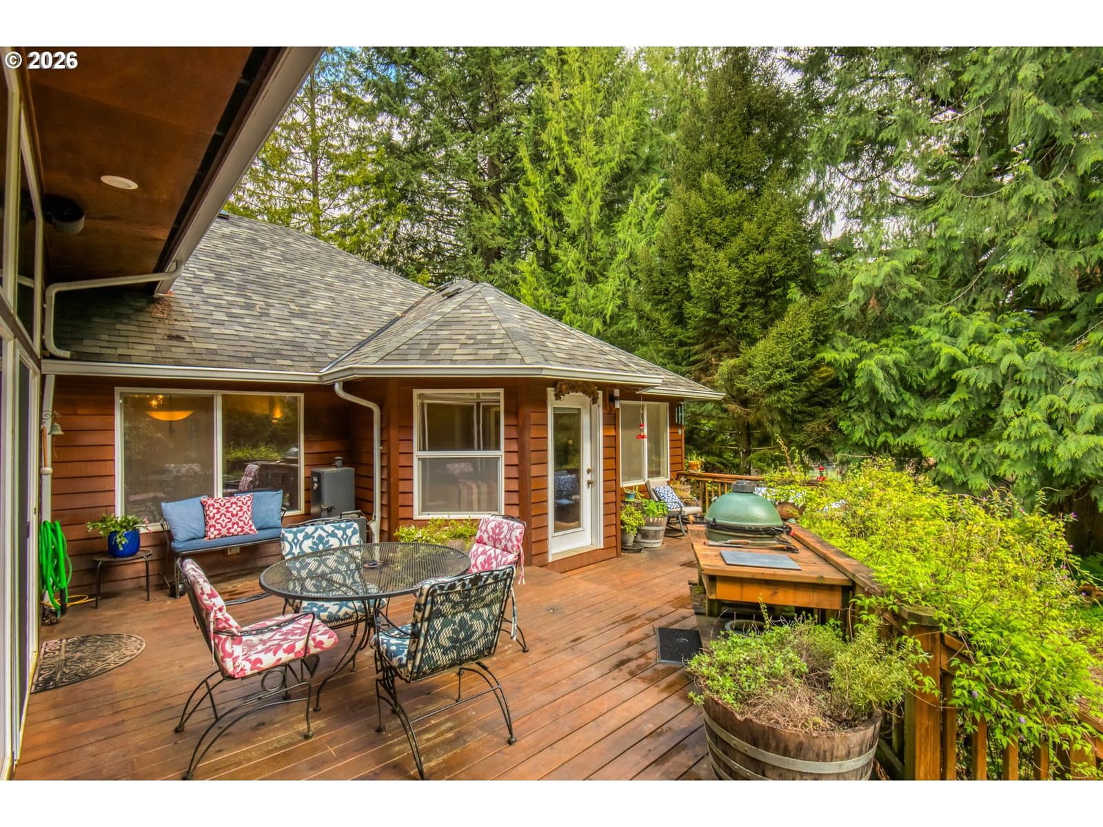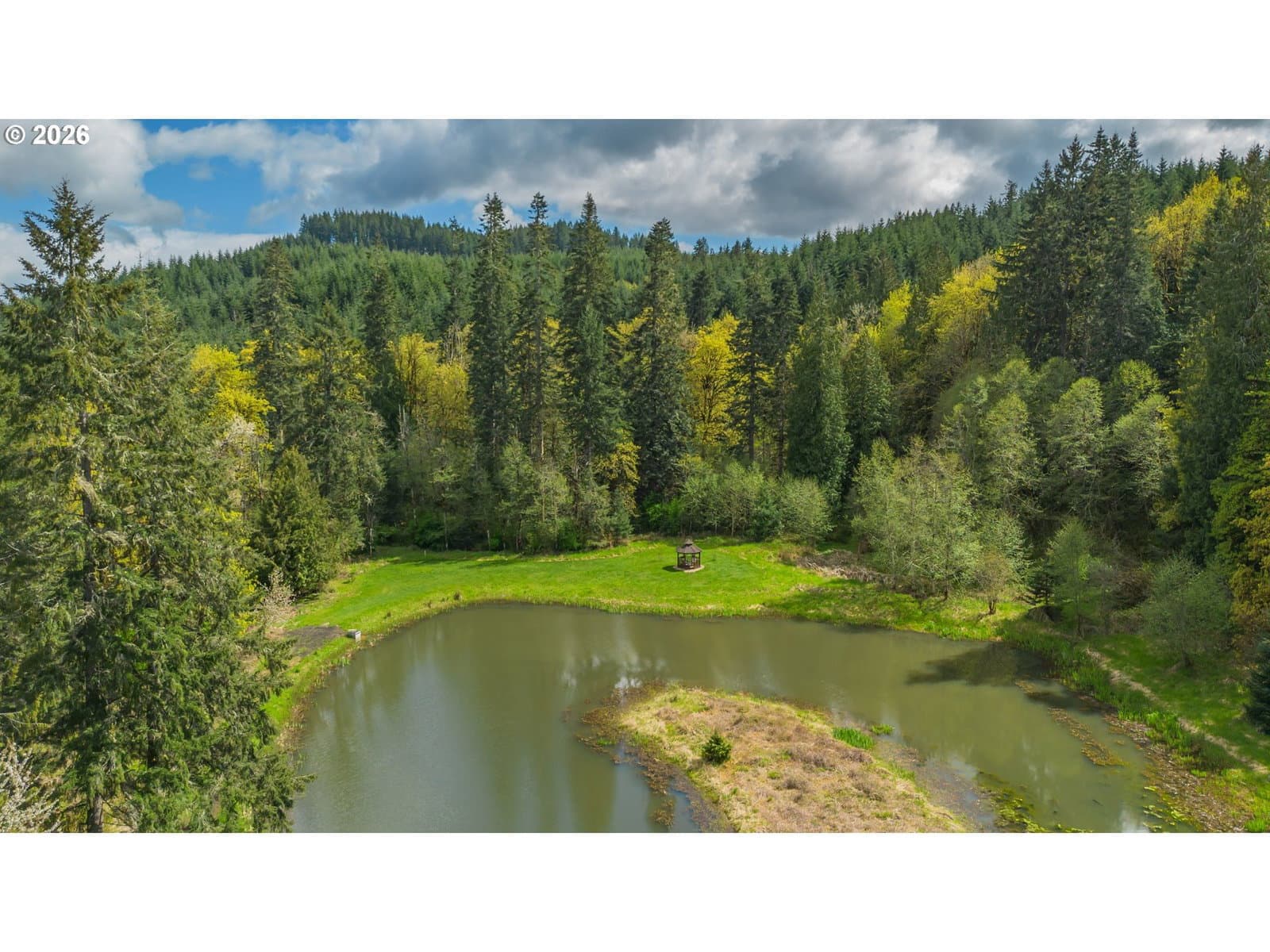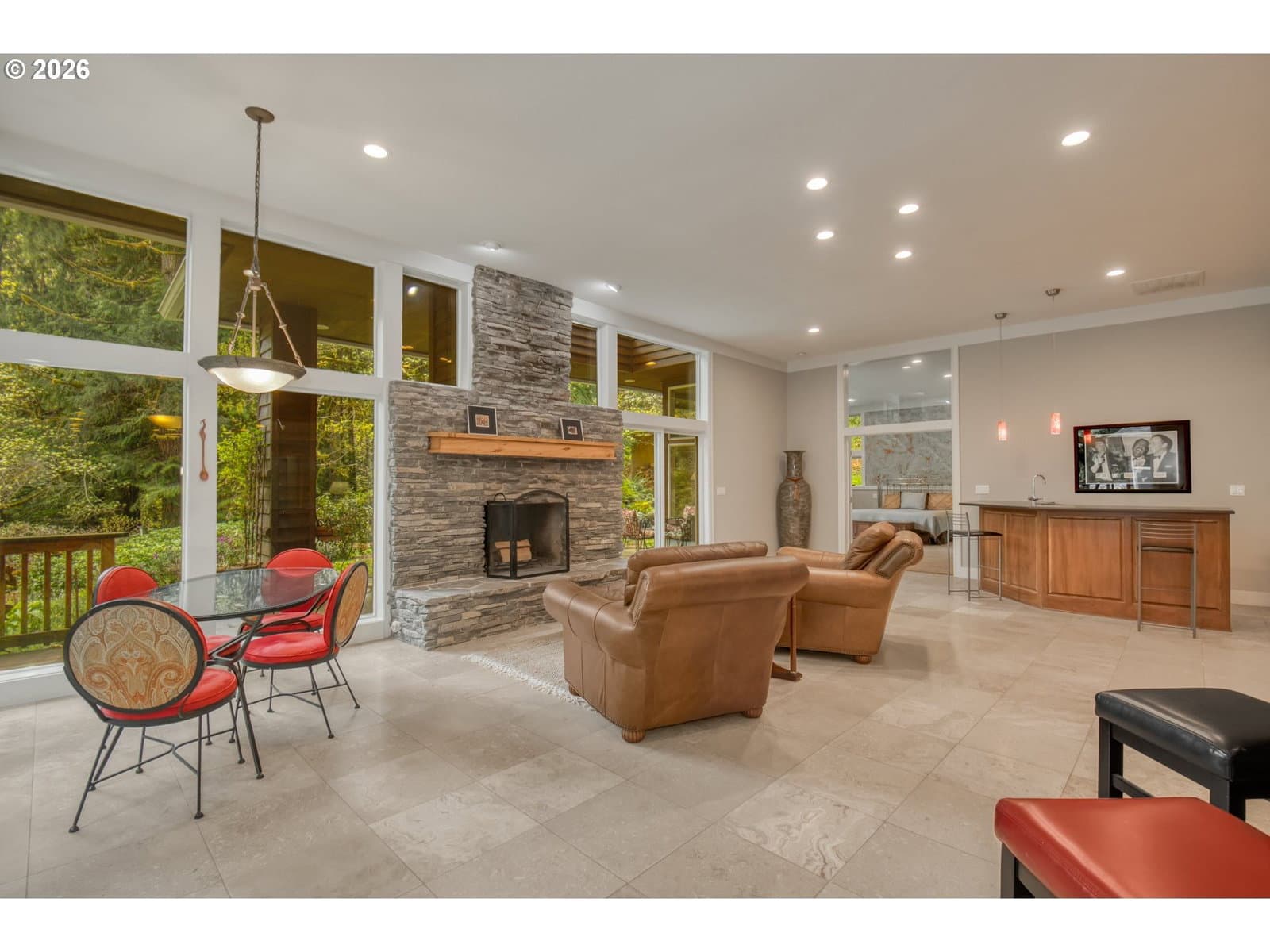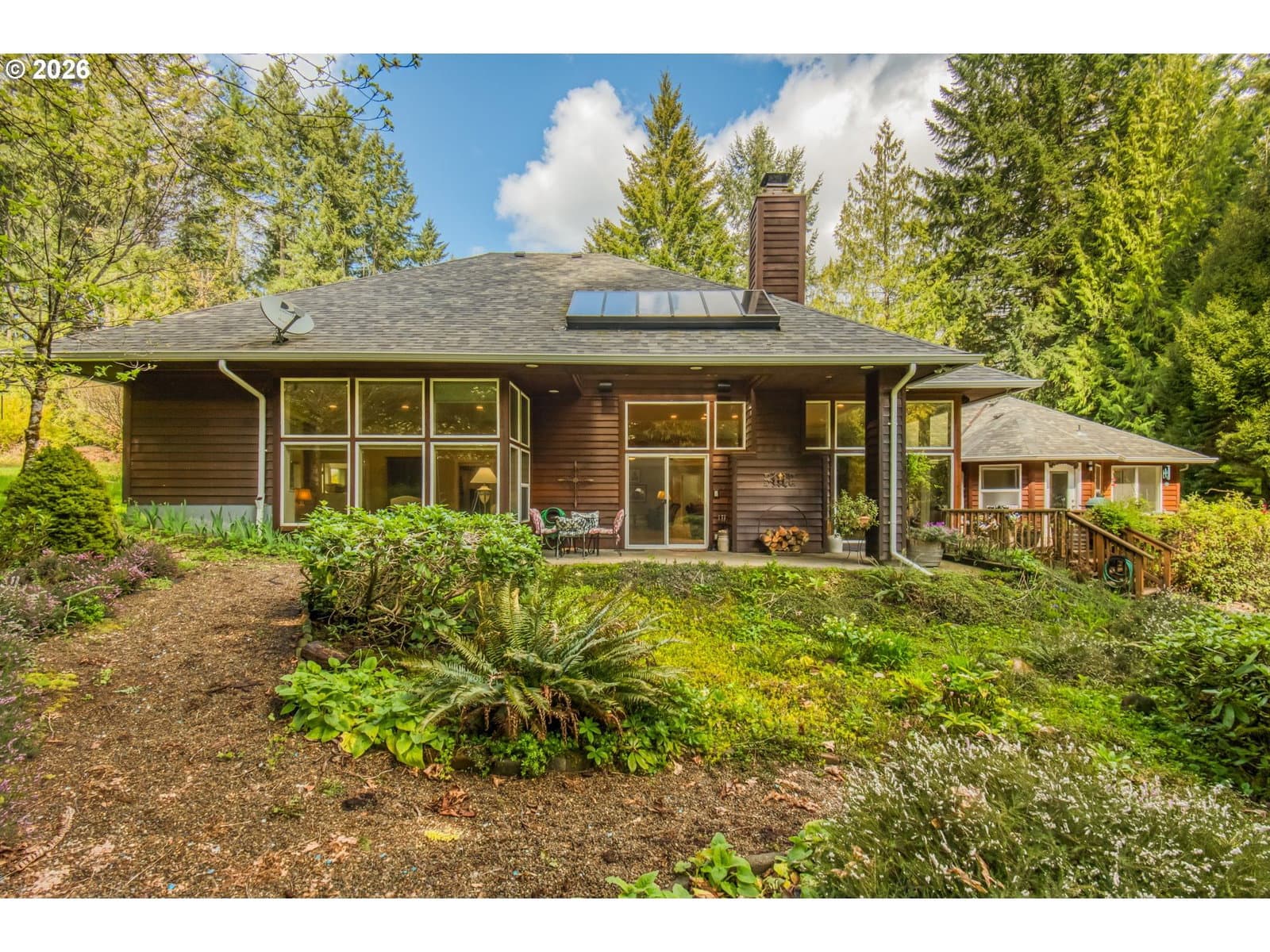 Set on 29.5 private, wooded acres, this cedar and brick estate offers a perfect blend of luxury and rural tranquility. The open-concept interior is anchored by a massive architectural beam and high ceilings, creating an inviting space for both daily living and formal entertaining, all set atop elegant travertine flooring that flows throughout the main living area. The gourmet kitchen is a true centerpiece, featuring durable ceramic tile, custom Brazilian mahogany cabinets, a built-in Sub-Zero refrigerator, and a professional-grade Wolf 6-burner stove with a griddle and double oven. Finished with leather-textured granite and a large island with storage on both sides, the kitchen flows into a great room highlighted by custom built-ins and a magnificent stacked stone fireplace. Large windows throughout provide peaceful views of the 3-acre pond and meadow. The thoughtful split floor plan ensures maximum privacy. The primary suite sits on its own wing, boasting a massive walk-in closet with a hidden bonus storage room and a spa-like ensuite. This private retreat features heated travertine floors, onyx countertops, and a walk-in shower. On the opposite side of the home, is a second primary suite, complete with a jetted tub and walk-in shower. A grand study with chair rail accents provides a sophisticated space for a home office. The exterior is designed to embrace the natural surroundings. Relax on the two-level deck accessible from the great room and secondary bedroom or the covered patio featuring a large skylight. The grounds are a nature lover’s dream, with lush landscaping, walking paths for viewing deer and elk, and a productive orchard of apple, pear, peach, and plum trees. The property is fully equipped for hobbies and utility with a barn, greenhouse, storage shed, gazebo, and fenced raised-bed garden. Modern essentials like a whole-house generator, two-car garage, and additional carport complete this exceptional private retreat.