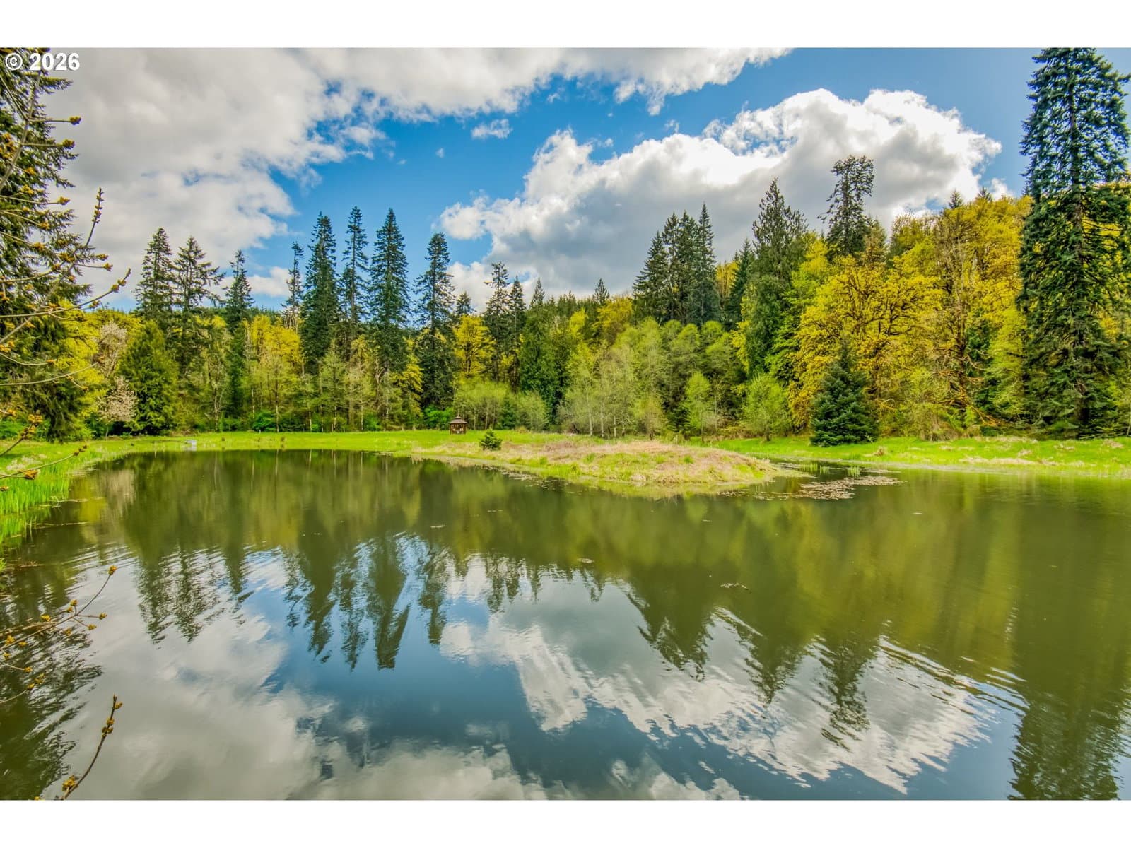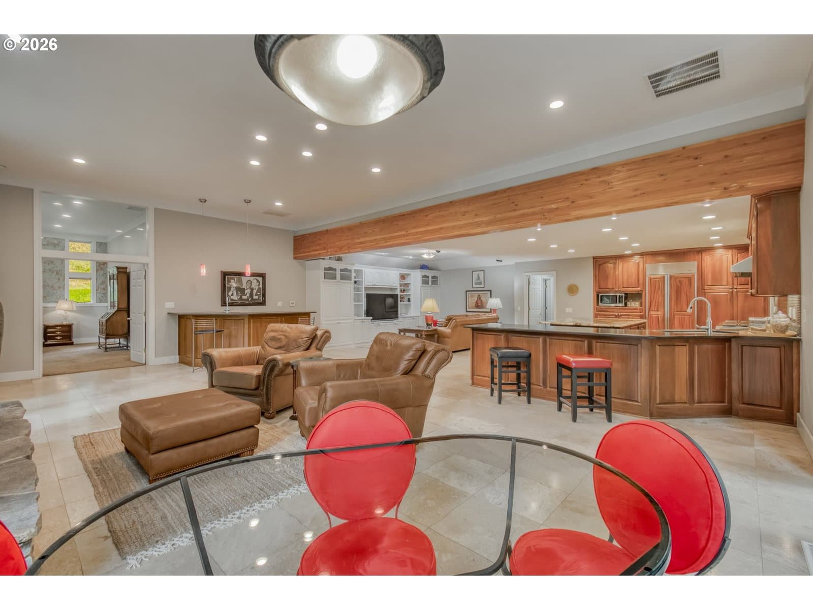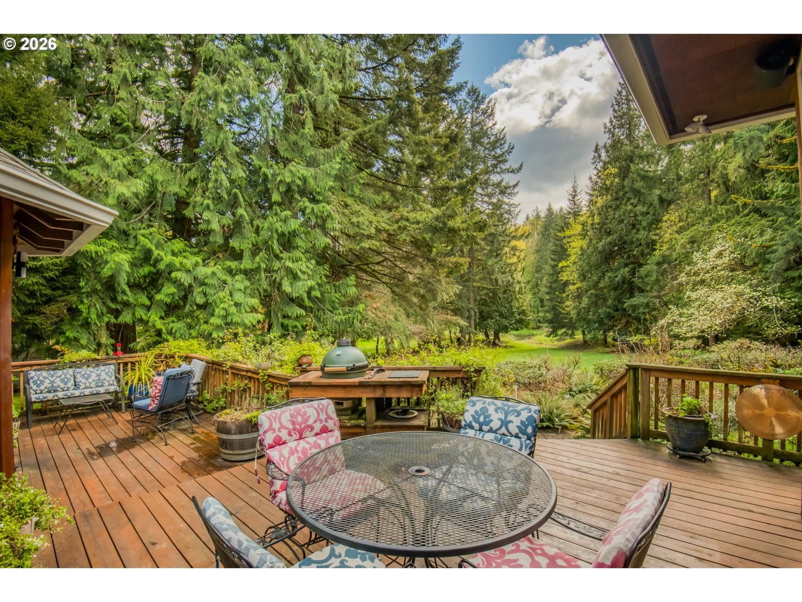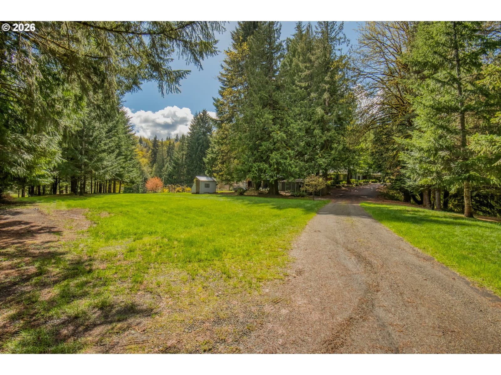 Set on 29.5 private, wooded acres, this cedar and brick estate offers a perfect blend of luxury and rural tranquility. The open-concept interior is anchored by a massive architectural beam and high ceilings, creating an inviting space for both daily living and formal entertaining, all set atop elegant travertine flooring that flows throughout the main living area. The gourmet kitchen is a true centerpiece, featuring durable ceramic tile, custom Brazilian mahogany cabinets, a built-in Sub-Zero refrigerator, and a professional-grade Wolf 6-burner stove with a griddle and double oven. Finished with leather-textured granite and a large island with storage on both sides, the kitchen flows into a great room highlighted by custom built-ins and a magnificent stacked stone fireplace. Large windows throughout provide peaceful views of the 3-acre pond and meadow. The thoughtful split floor plan ensures maximum privacy. The primary suite sits on its own wing, boasting a massive walk-in closet with a hidden bonus storage room and a spa-like ensuite. This private retreat features heated travertine floors, onyx countertops, and a walk-in shower. On the opposite side of the home, is a second primary suite, complete with a jetted tub and walk-in shower. A grand study with chair rail accents provides a sophisticated space for a home office. The exterior is designed to embrace the natural surroundings. Relax on the two-level deck accessible from the great room and secondary bedroom or the covered patio featuring a large skylight. The grounds are a nature lover’s dream, with lush landscaping, walking paths for viewing deer and elk, and a productive orchard of apple, pear, peach, and plum trees. The property is fully equipped for hobbies and utility with a barn, greenhouse, storage shed, gazebo, and fenced raised-bed garden. Modern essentials like a whole-house generator, two-car garage, and additional carport complete this exceptional private retreat.