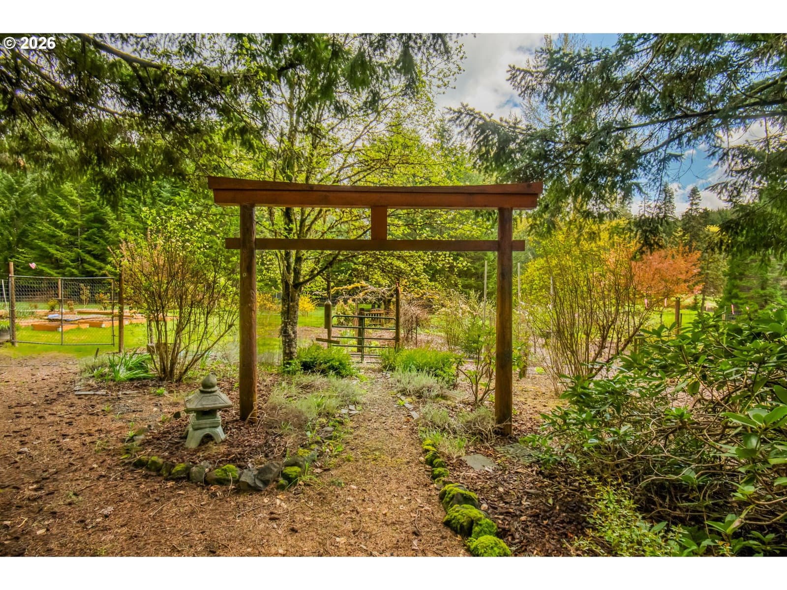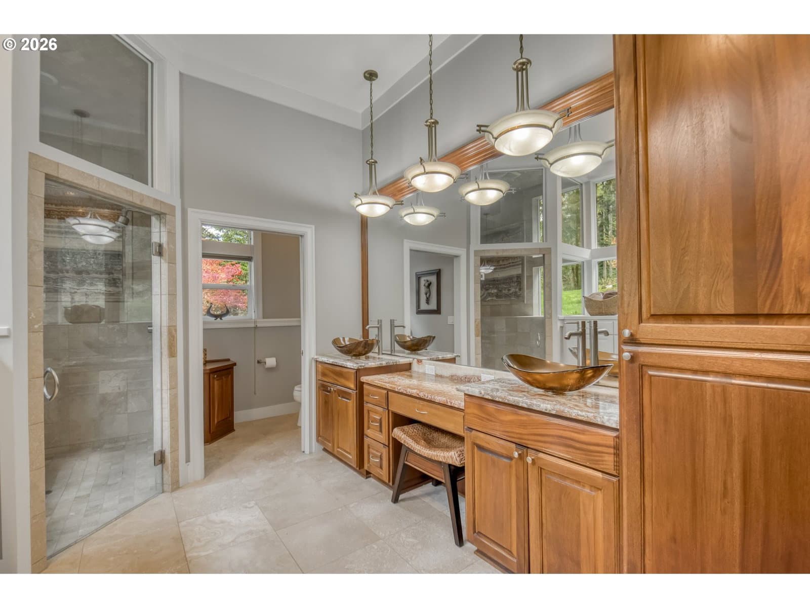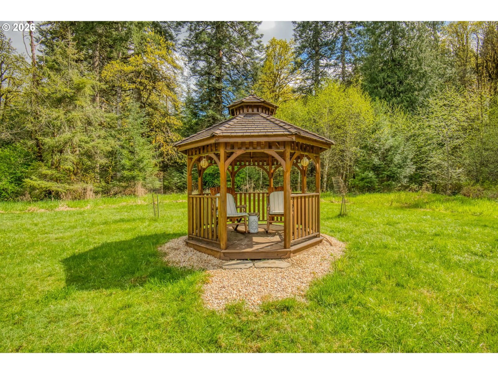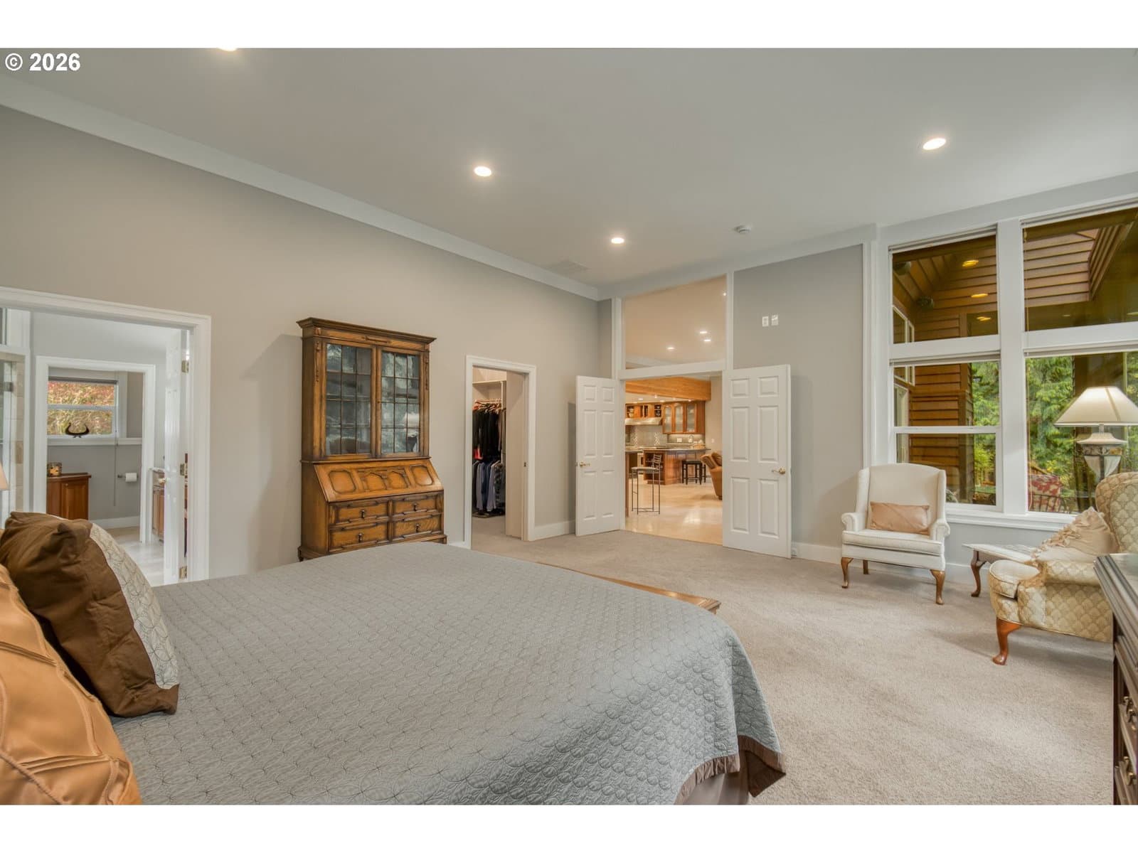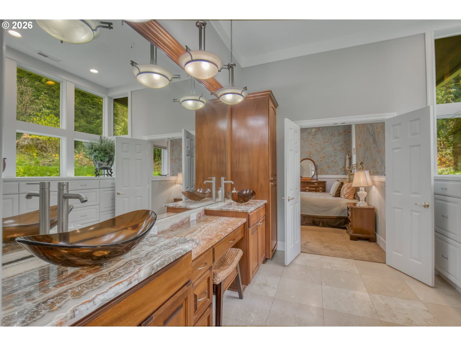 Set on 29.5 private, wooded acres, this cedar and brick estate offers a perfect blend of luxury and rural tranquility. The open-concept interior is anchored by a massive architectural beam and high ceilings, creating an inviting space for both daily living and formal entertaining, all set atop elegant travertine flooring that flows throughout the main living area. The gourmet kitchen is a true centerpiece, featuring durable ceramic tile, custom Brazilian mahogany cabinets, a built-in Sub-Zero refrigerator, and a professional-grade Wolf 6-burner stove with a griddle and double oven. Finished with leather-textured granite and a large island with storage on both sides, the kitchen flows into a great room highlighted by custom built-ins and a magnificent stacked stone fireplace. Large windows throughout provide peaceful views of the 3-acre pond and meadow. The thoughtful split floor plan ensures maximum privacy. The primary suite sits on its own wing, boasting a massive walk-in closet with a hidden bonus storage room and a spa-like ensuite. This private retreat features heated travertine floors, onyx countertops, and a walk-in shower. On the opposite side of the home, is a second primary suite, complete with a jetted tub and walk-in shower. A grand study with chair rail accents provides a sophisticated space for a home office. The exterior is designed to embrace the natural surroundings. Relax on the two-level deck accessible from the great room and secondary bedroom or the covered patio featuring a large skylight. The grounds are a nature lover’s dream, with lush landscaping, walking paths for viewing deer and elk, and a productive orchard of apple, pear, peach, and plum trees. The property is fully equipped for hobbies and utility with a barn, greenhouse, storage shed, gazebo, and fenced raised-bed garden. Modern essentials like a whole-house generator, two-car garage, and additional carport complete this exceptional private retreat.