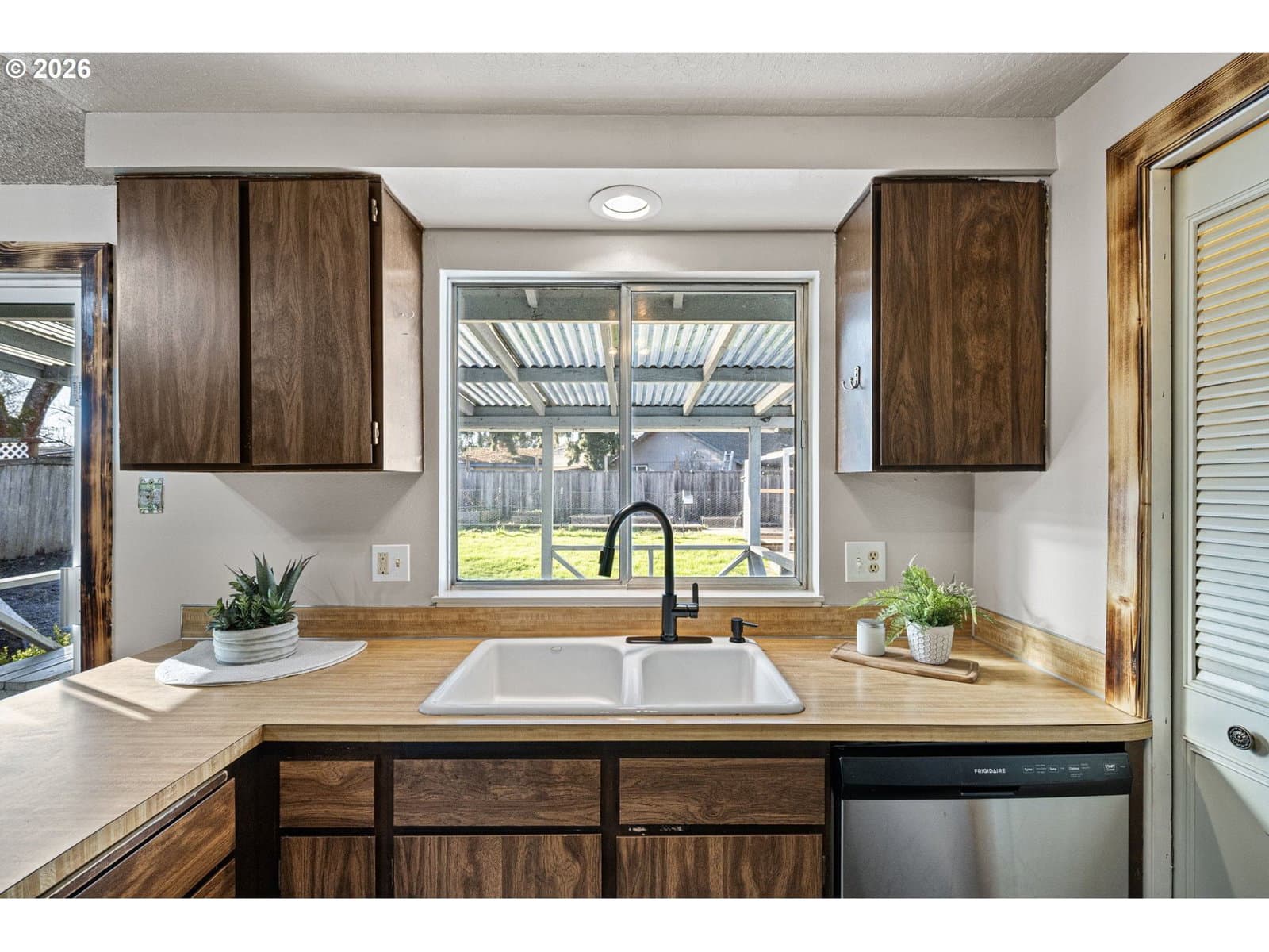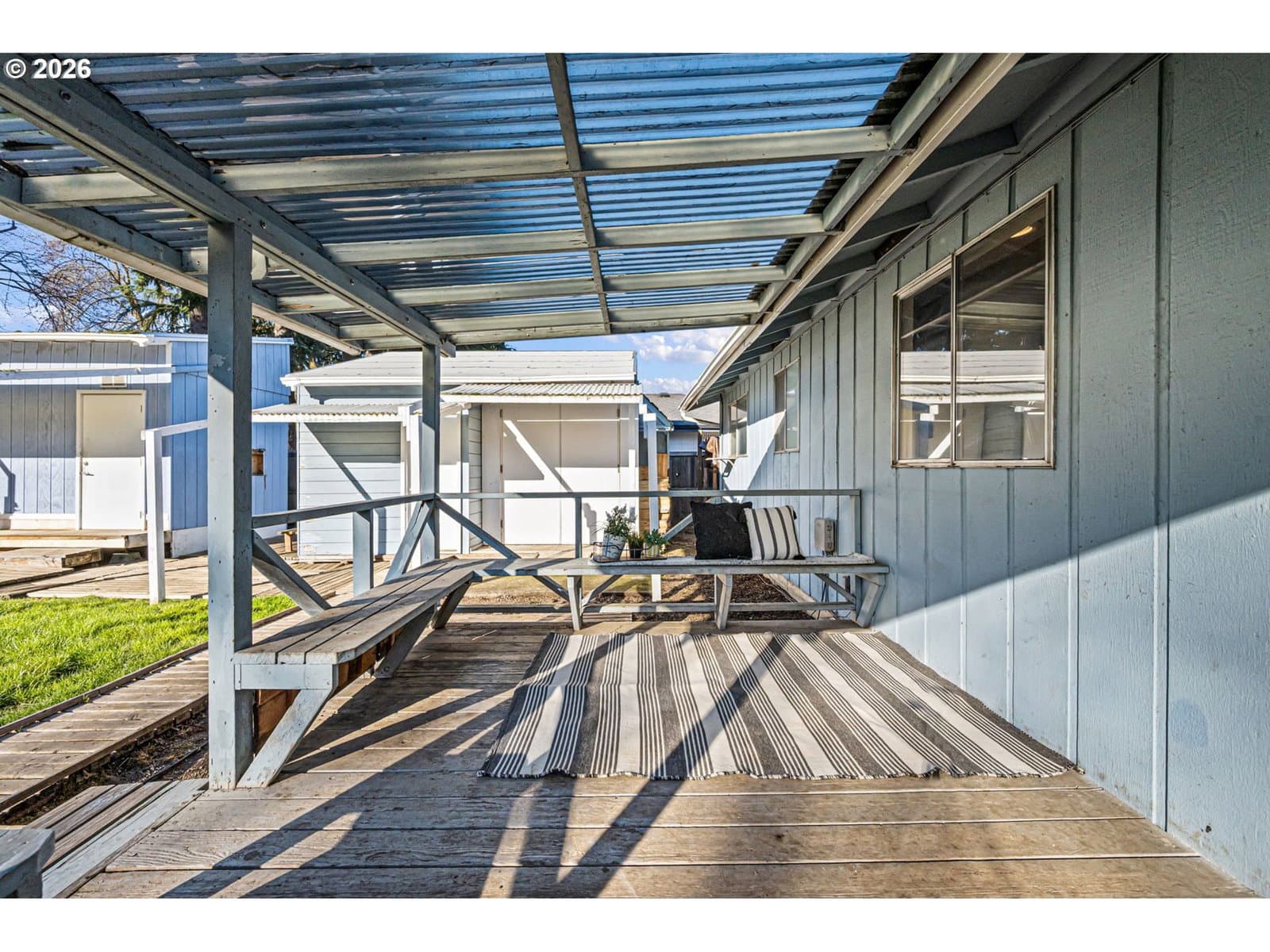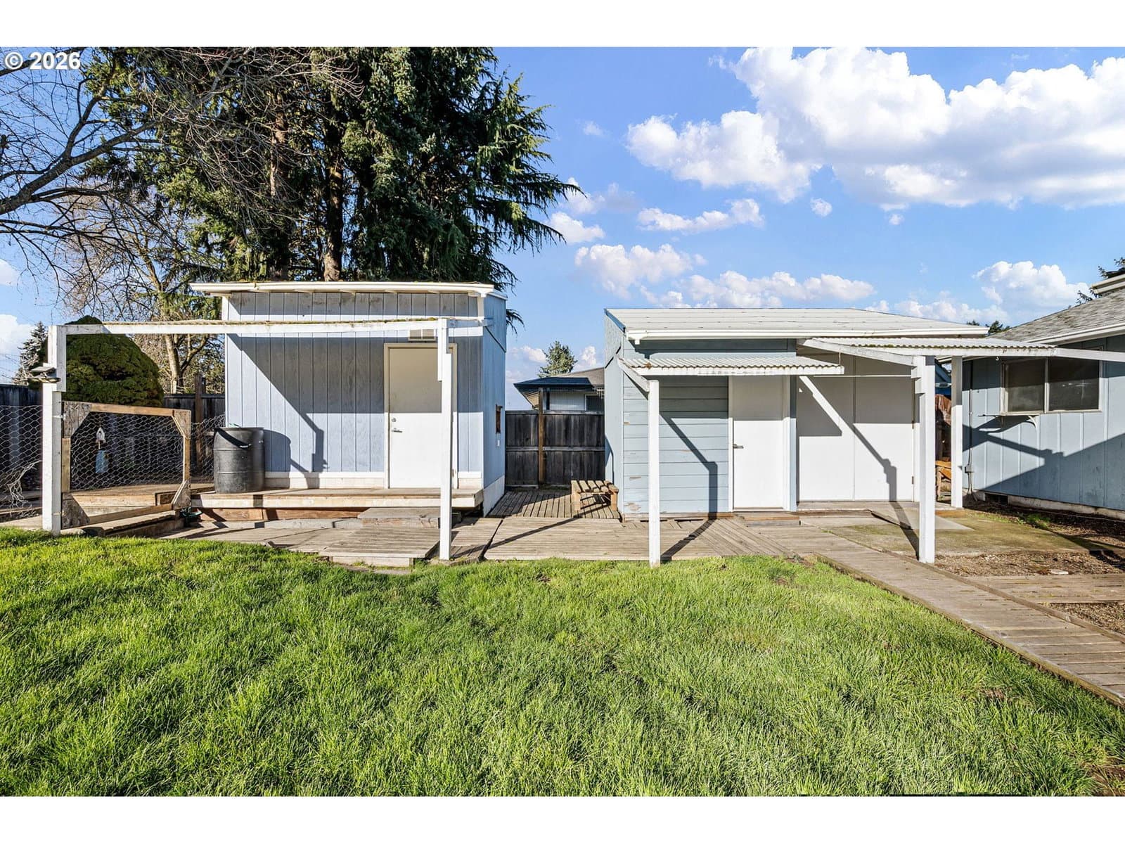 Cute and updated 2-bedroom, 1-bath home on a large lot in West Eugene with excellent outdoor space and RV parking. Recent updates include new flooring, fresh interior paint, and updated fixtures throughout. The living room features a cozy fireplace, while the dining area offers a slider that opens to a covered back deck—perfect for indoor-outdoor living.The kitchen includes stainless steel appliances, a pantry, and a disposal. Both bedrooms feature wood floors and ceiling fans. The spacious bathroom also includes laundry hookups for added convenience.Outside, enjoy fully fenced front and back yards, sprinkler system in the front yard, drive-through RV parking with access to both the front and backyard, and a covered deck with built-in seating. The property also includes two sheds/workshops with power and covered porches, plus a fenced garden area with raised beds—ideal for hobbies, storage, or gardening.