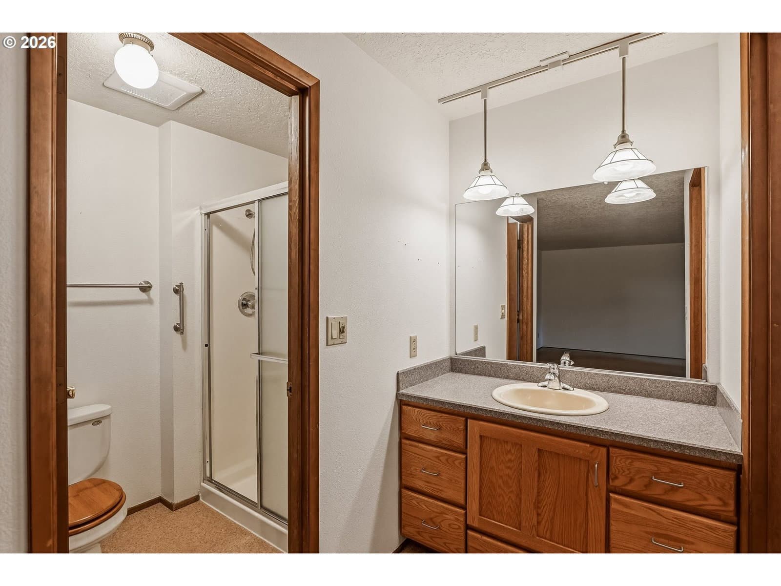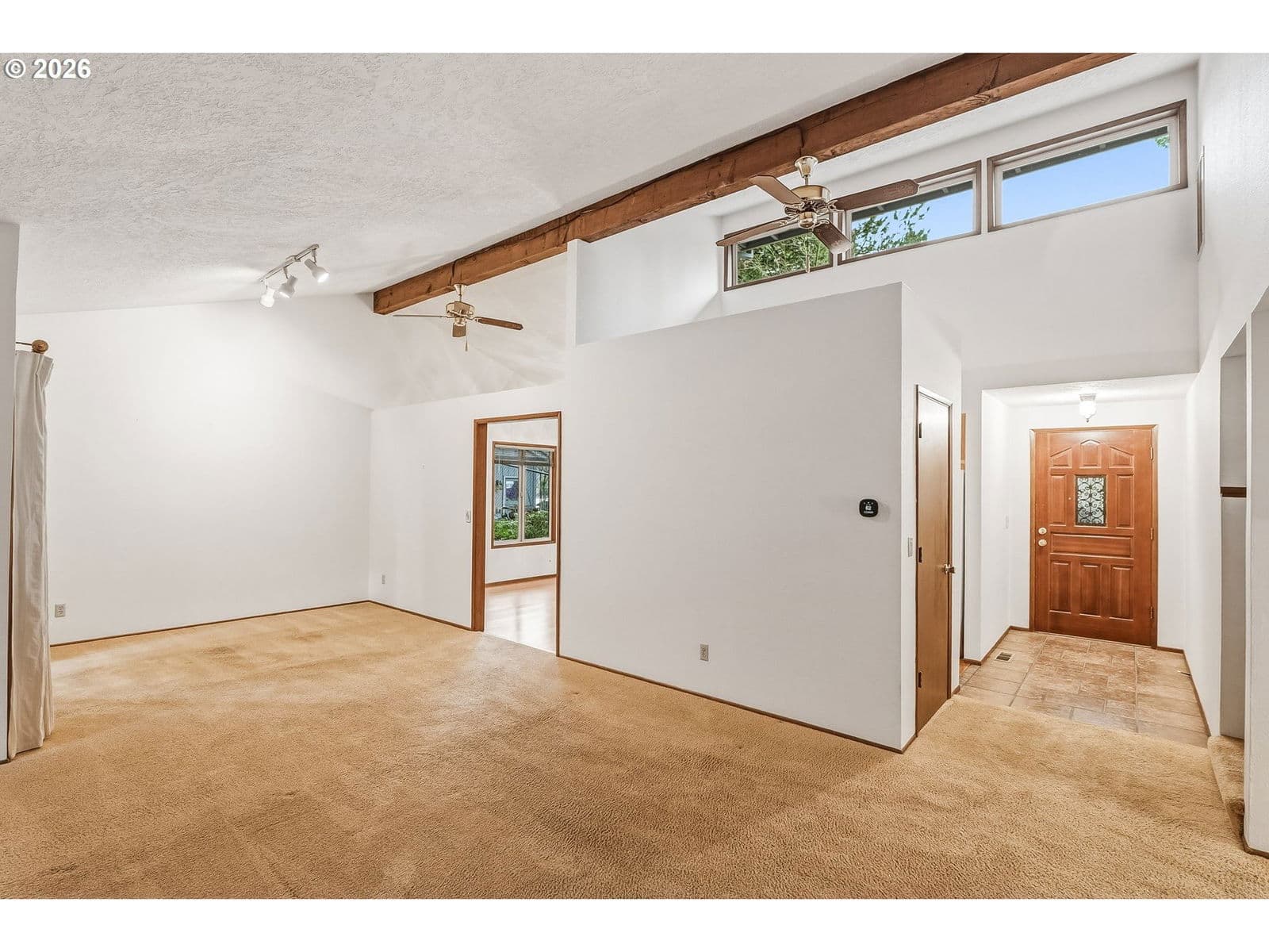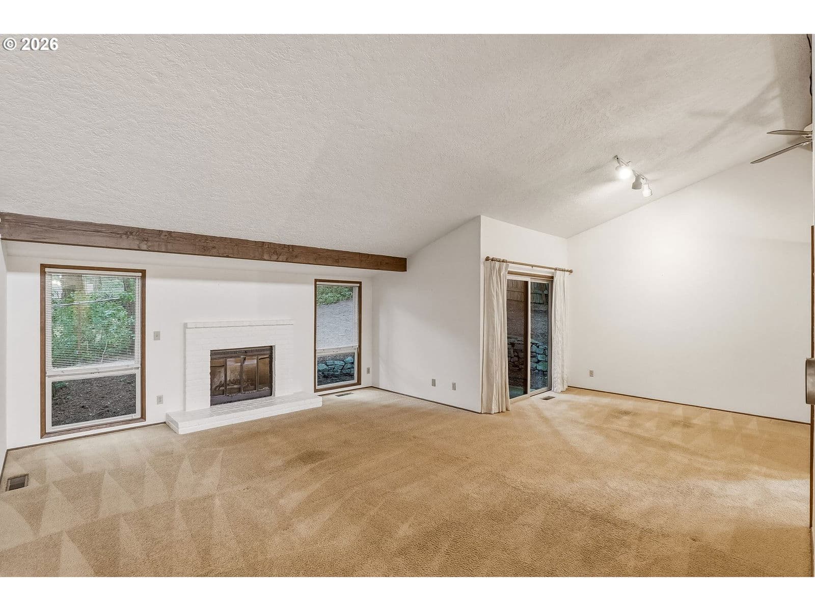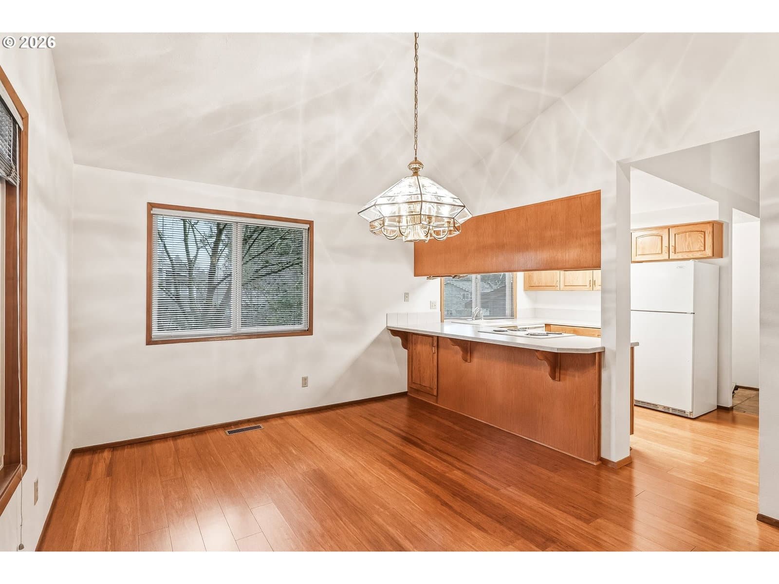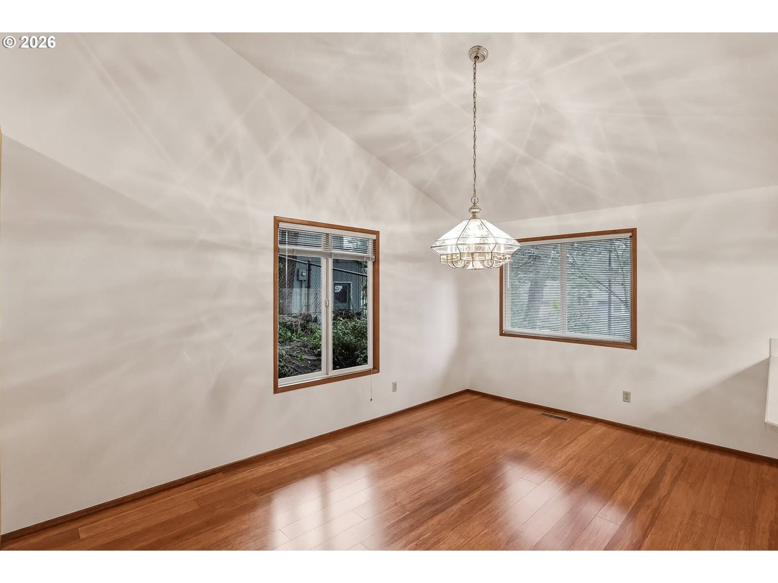 Tri-level with contemporary flair in wooded setting. Front deck to the right of front entrance. Foyer with Italian tile. Open, airy living room & dining room combo with vaulted ceilings. Living area with wood burning fireplace. Dining area with slider to covered porch & backyard. Kitchen with bamboo floors, large eating area, pantry, & breakfast bar. Upper level with primary suite plus two additional bedrooms & a bathroom. Lower level with flex space/family room, fireplace, & slider to back deck. New furnace & AC in 2024. Roof replaced in 2015. New exterior paint in 2021. All new Milgard windows. Newer front & back decks. Great storage. Washer, dryer, refrigerator stay. Oversized 2 car garage with built in work bench & storage cabinets. Excellent neighborhood with easy access to parks, paths, & greenways.