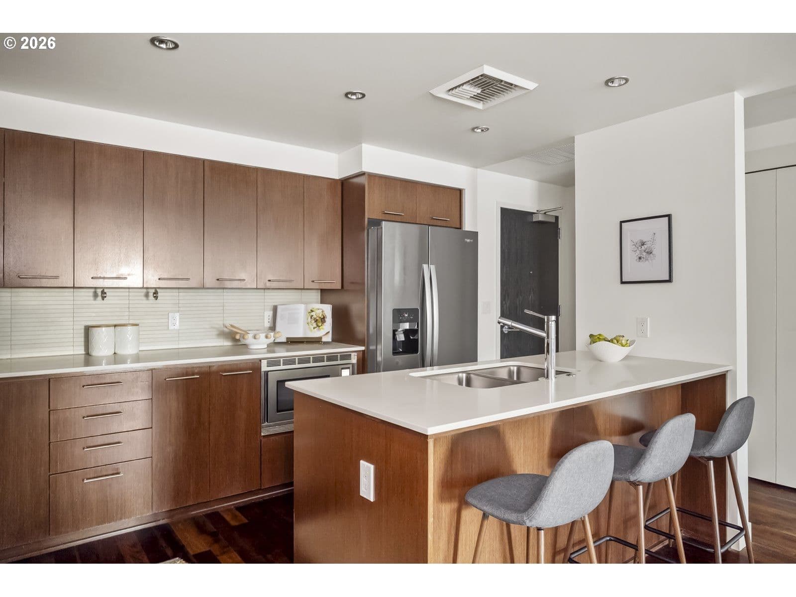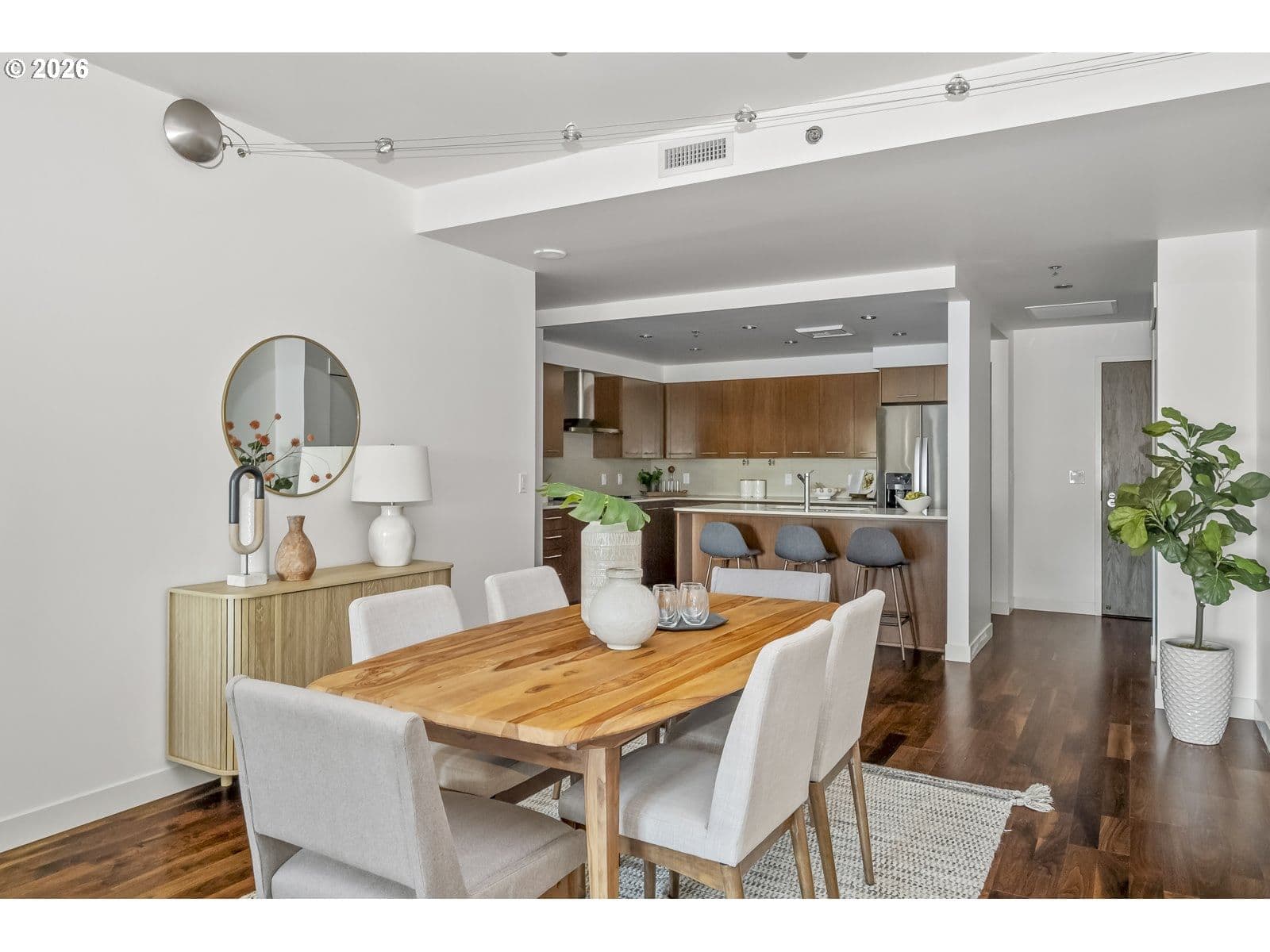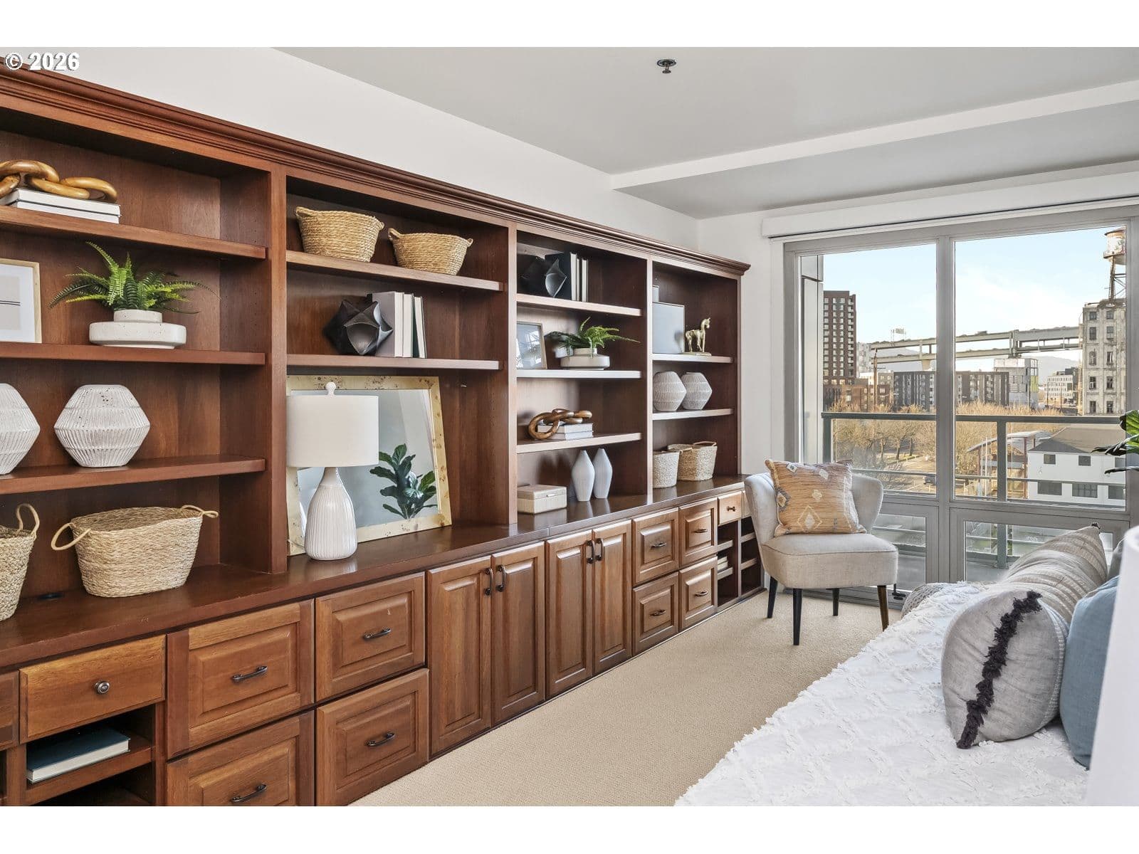 This is Pearl living at its finest: enjoy the convenience of a secure modern building with Willamette River views that's off the beaten path while still walkable to countless amenities. This oversized unit features an open-concept main entertaining space with hardwood floors, a cook's kitchen with a large island, and a private covered balcony to take in the water views. Tucked into its own wing, find two comfortable bedrooms and two beautiful baths, including a primary ensuite with dual sinks, soaking tub, walk-in shower, and spacious closet. There is also an additional flex room that could be used as a home office, library, meditation space, or the perfect media room to screen your favorite movies. Every luxury is at your fingertips here: easy elevator access, in-unit laundry, two separate deeded garage parking spaces, a private storage unit, and community amenities like a gym, sauna, BBQ area, and local waterfront walking paths are at your disposal. This prime location is walkable to countless coveted shops and restaurants, within a mile of Powells and the Slabtown New Seasons, and just over the Broadway Bridge from the Moda Center!