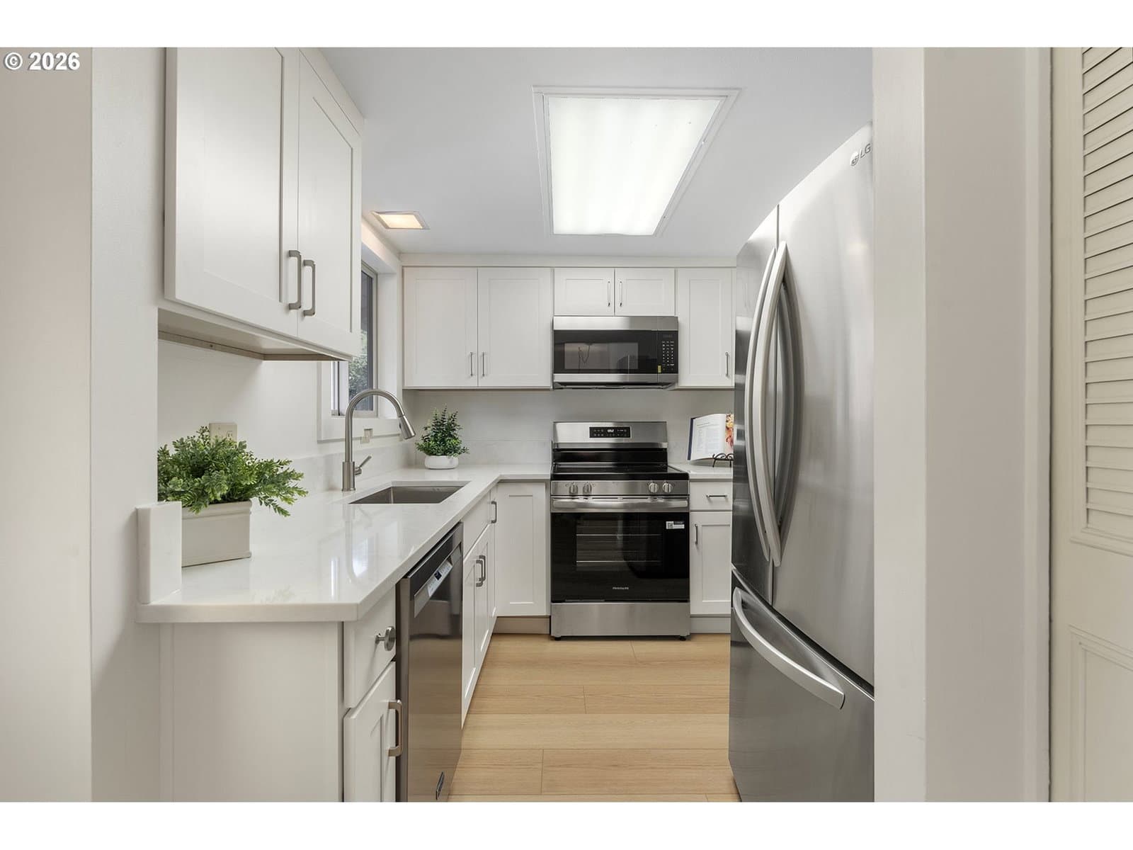 Tucked into a quiet corner of the sought-after King City Civic Association, this charming 1-bedroom, 1-bath condominium at 11575 SW Crown Ct Unit #2 offers the perfect blend of ground floor access with no step entry, comfort, style, and easy living—all in a beautifully updated 672 sq ft package. Step inside and feel instantly at home. Fresh interior paint, new doors, molding, and baseboards create a crisp, modern feel, while luxury vinyl plank flooring flows throughout (with cozy carpet in the bedroom). Sunlight pours through vinyl windows and the sliding glass door, illuminating a thoughtfully refreshed interior. The kitchen shines with new cabinetry, sleek countertops, stainless steel appliances, and a built-in microwave—making everyday living and entertaining effortless. The bathroom has been tastefully updated with a new vanity and a stunning walk-in tile shower. Year-round comfort is yours with an efficient mini-split system for heating and cooling. Step outside to your large view deck—perfect for morning coffee as the sun rises or unwinding at the end of the day. Just a short “Par 3” stroll to the clubhouse, you’ll enjoy access to golf, a pool, a library, and a vibrant calendar of activities. The HOA simplifies life by covering water, sewer, garbage, cable, exterior maintenance, landscaping, and more. With parking right in front (plus optional carport rental) and a dedicated storage unit, convenience is built in. Ideally located near shopping and major routes, this home offers both tranquility and accessibility. Whether you're relaxing at home or embracing the active community lifestyle, this inviting condo is your gateway to the best of King City living.