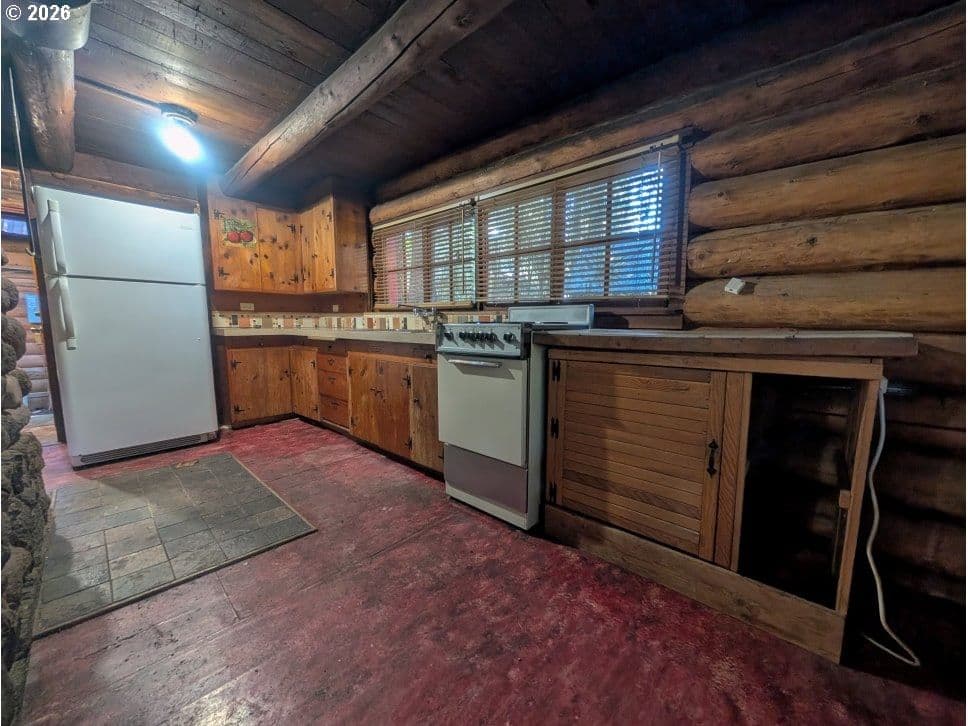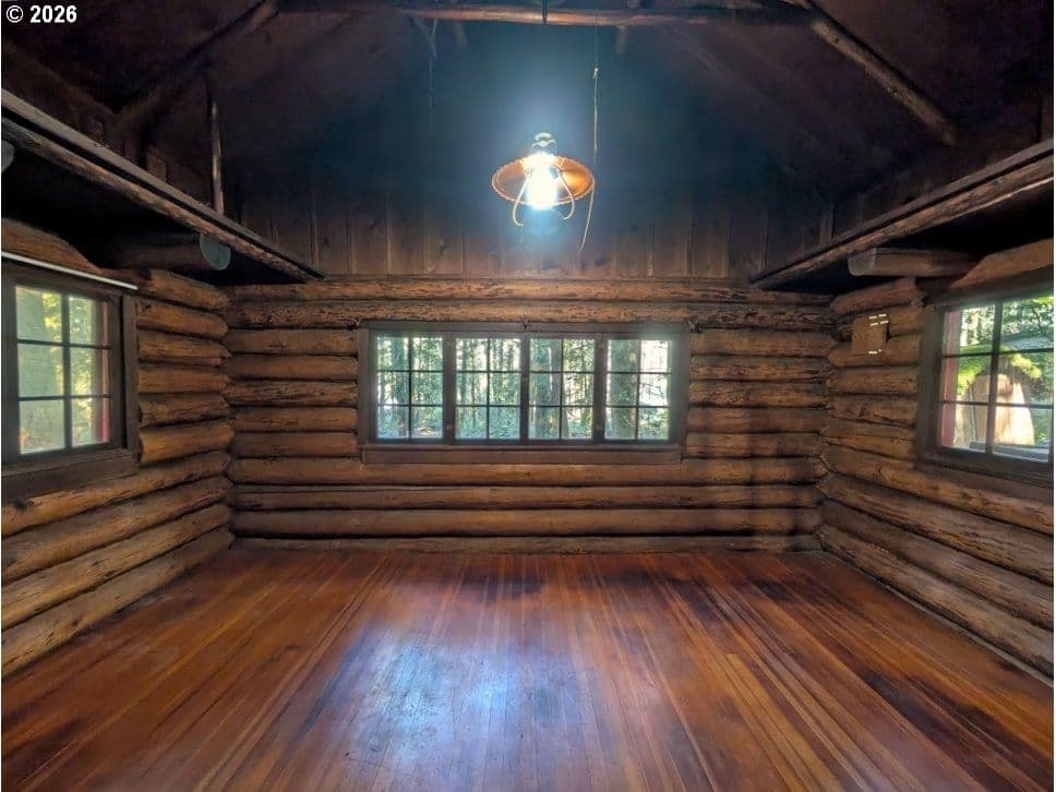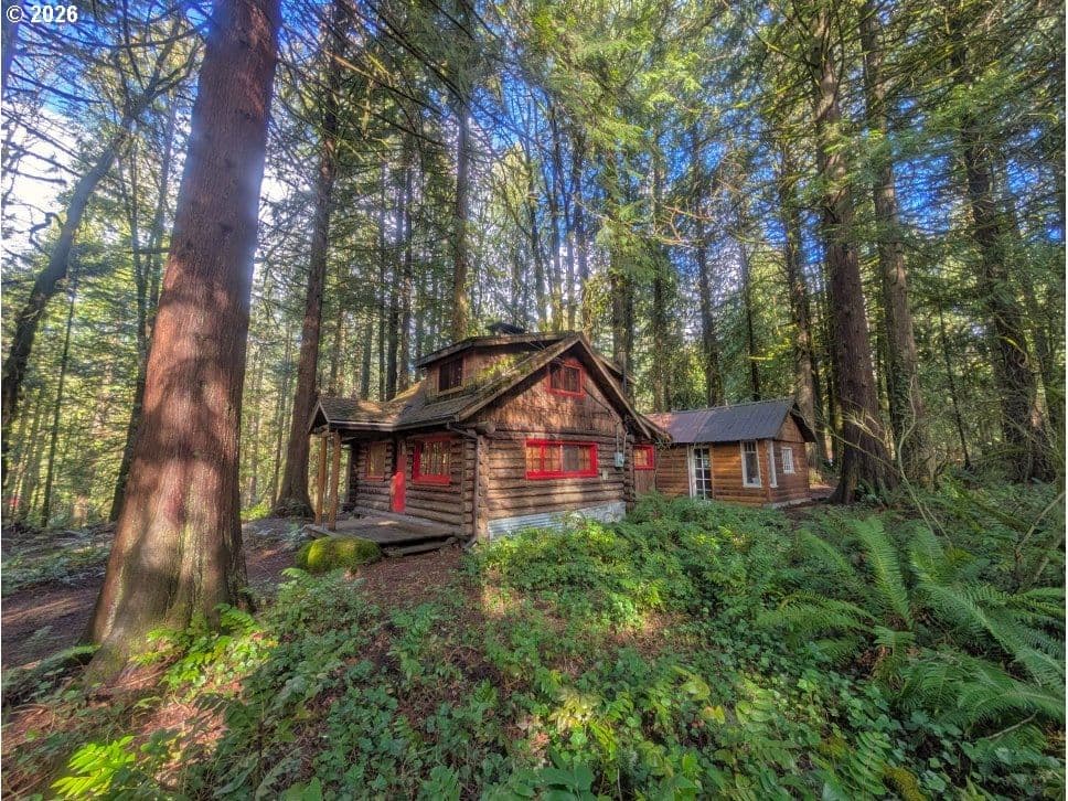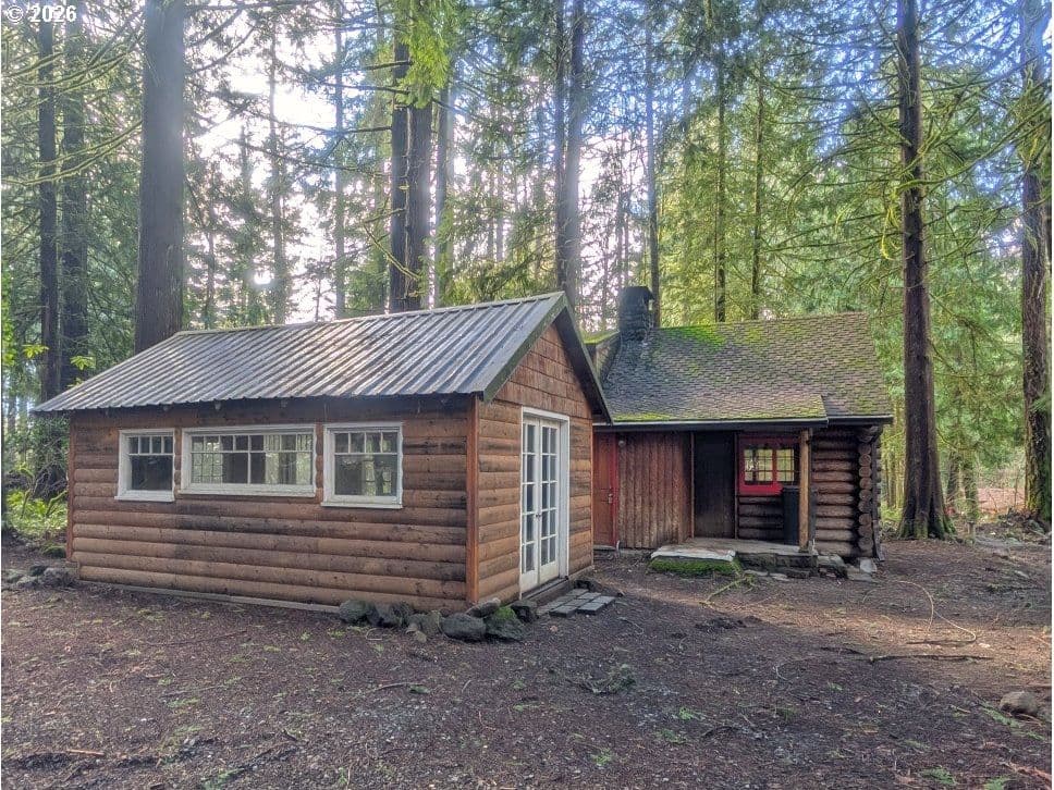 Step back in time to this 1930’s log cabin in the woods on nearly a half acre of land. A prior owner told the current owner that the original builder was a Norwegian carpenter but this information was never verified. Logs and stone for the fireplace were locally sourced. The logs were also hand-hewn and the chinking was dried moss. Hand crafted features include doorknobs carved from saplings and curved small tree trunk for the stair banister. Original paned windows throughout the cabin. Covered entry on the Sampson Street side with a small deck. The location is in Welches on a wooded lot. This rustic charmer needs some TLC and updates. A bathroom was added on at some point but the date is unknown. The main structure features a living room area, kitchen and a loft upstairs for sleeping. A stone fireplace is the centerpiece of the living room with high vaulted ceilings and horizontal log beams. The fireplace is a double flue according to the owner and at one time had a wood cook stove in the kitchen. Although rustic, the kitchen does have a frig and stove along with some decorative tile along the backsplash. The original wood floors glow. A curved log tree trunk hand rail is one of the most unique features of the cabin. Upstairs is an open loft for sleeping. A bumper out dormer and skylight at the stairs brings extra storage and light. There's a tiny closet tucked in next to the stone chimney too. Recent improvements include a brand new well and an upgraded electrical panel. A spacious log sided outbuilding would make a great office or storage area. The holding tank for the new well is located in this structure. The legal address is on E. Sampson Street but a more easily accessible driveway is off E. Chambreau Road and that's what everyone uses! Walk to stores and restaurants from this location. Only one hour from Portland. Terms: cash only and sold as is.