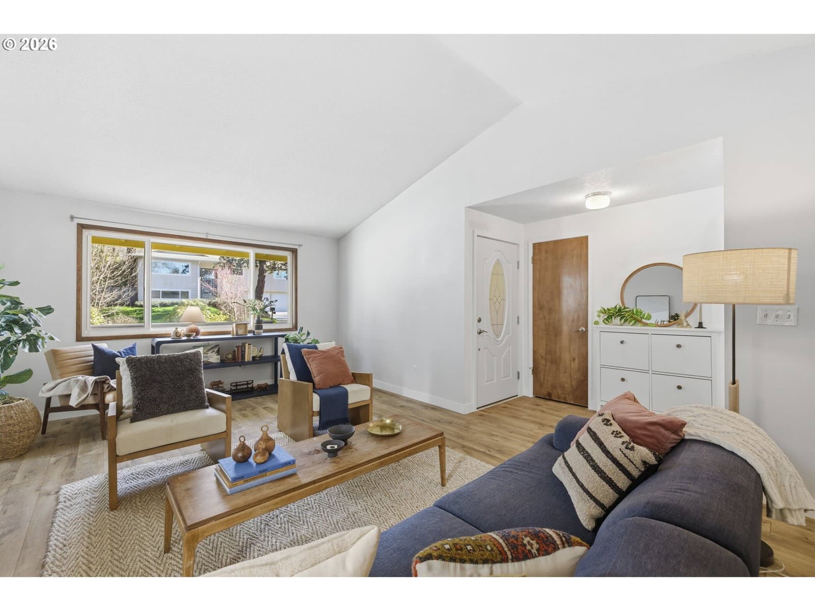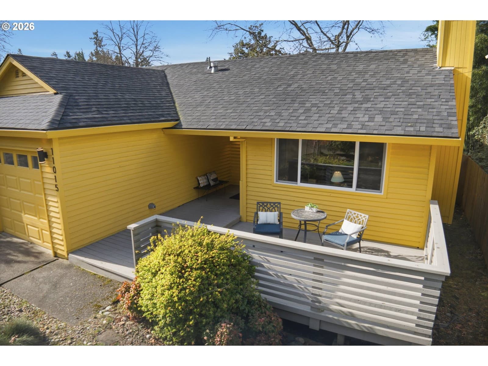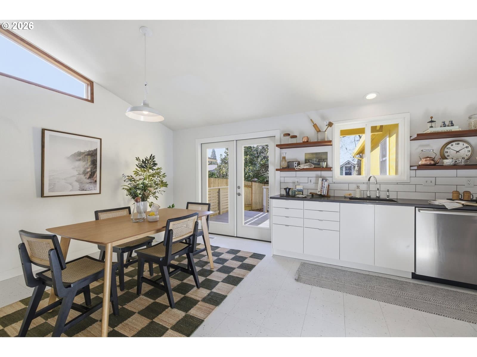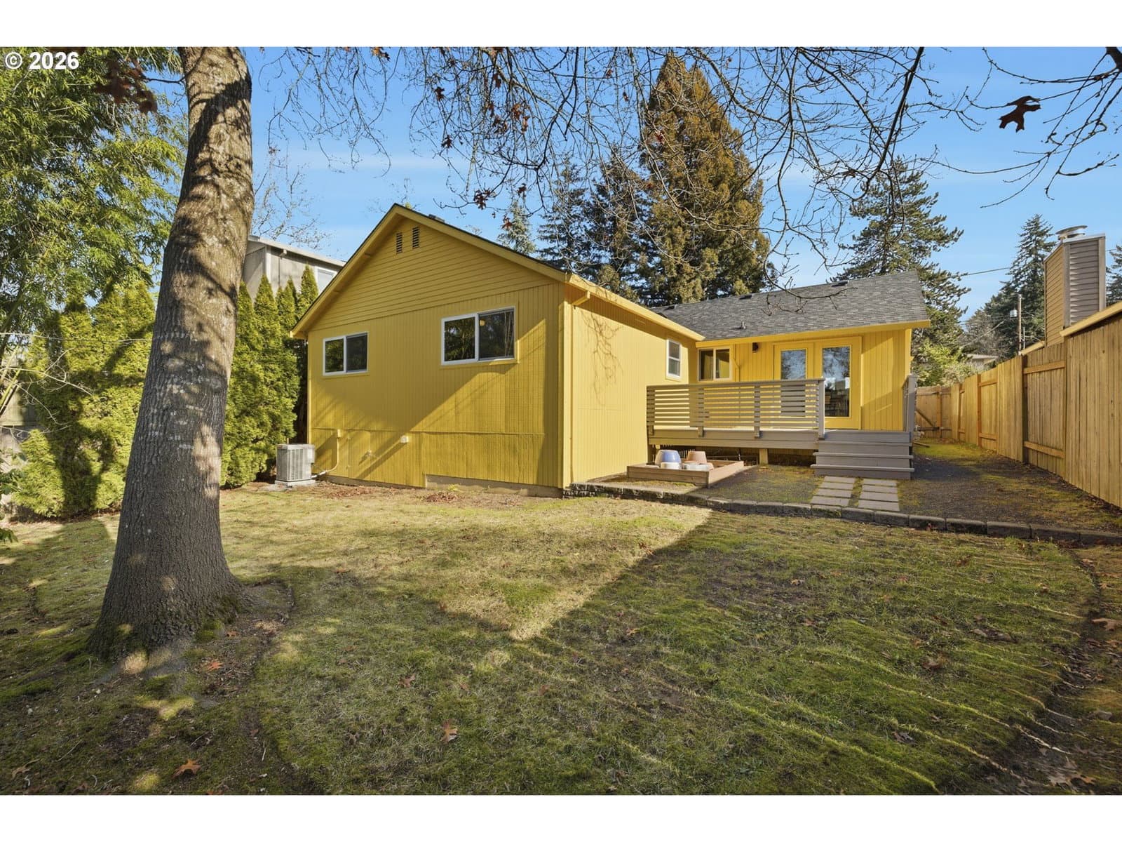 This thoughtfully updated 1979 ranch blends classic one-level living with standout curb appeal and modern upgrades. The home welcomes you with a charming front deck, beautifully planted yard, and a unique vestibule-style entry that sets it apart. Inside, the spacious living room features vaulted ceilings and a wood-burning fireplace, creating a warm and inviting space filled with natural light. The home offers 3 bedrooms and 2 bathrooms, including an ensuite primary, all on a highly accessible single level—ideal for easy, everyday living. The beautifully updated kitchen opens seamlessly to the light and bright dining area, where French doors lead to the back deck, creating a natural flow for entertaining or enjoying the private backyard. Fun architectural windows throughout bring in great natural light and add character you don’t often find in a ranch-style home. Major updates include vinyl windows, a new roof (2023), new HVAC system (2024), and fresh exterior paint (2023), providing both comfort and peace of mind. Additional features include a high crawlspace, two-car garage, and multiple outdoor living spaces with both front and back decks. Located just blocks from Dickinson Park and nearby walking trails, fresh air becomes part of the daily routine. With excellent proximity to Washington Square, Multnomah Village, Gabriel Park, and easy access to I-5, this home offers the perfect balance of quiet neighborhood living, everyday convenience, and commuter access. [Home Energy Score = 4. HES Report at https://rpt.greenbuildingregistry.com/hes/OR10105859]