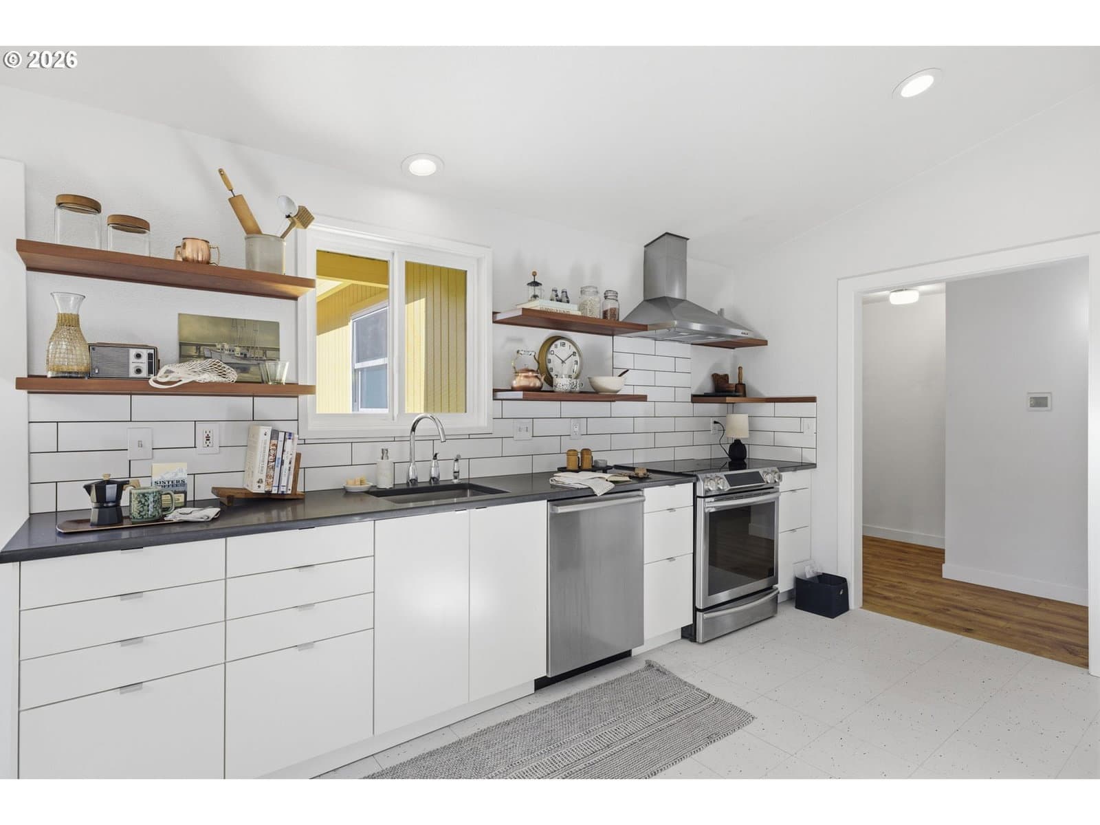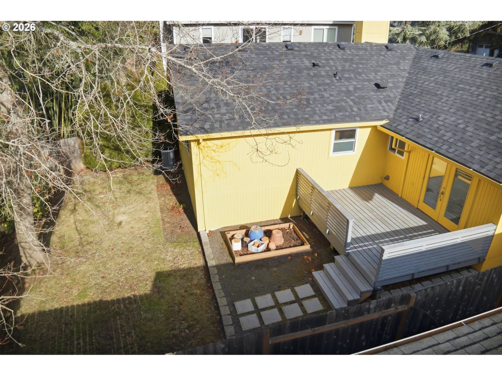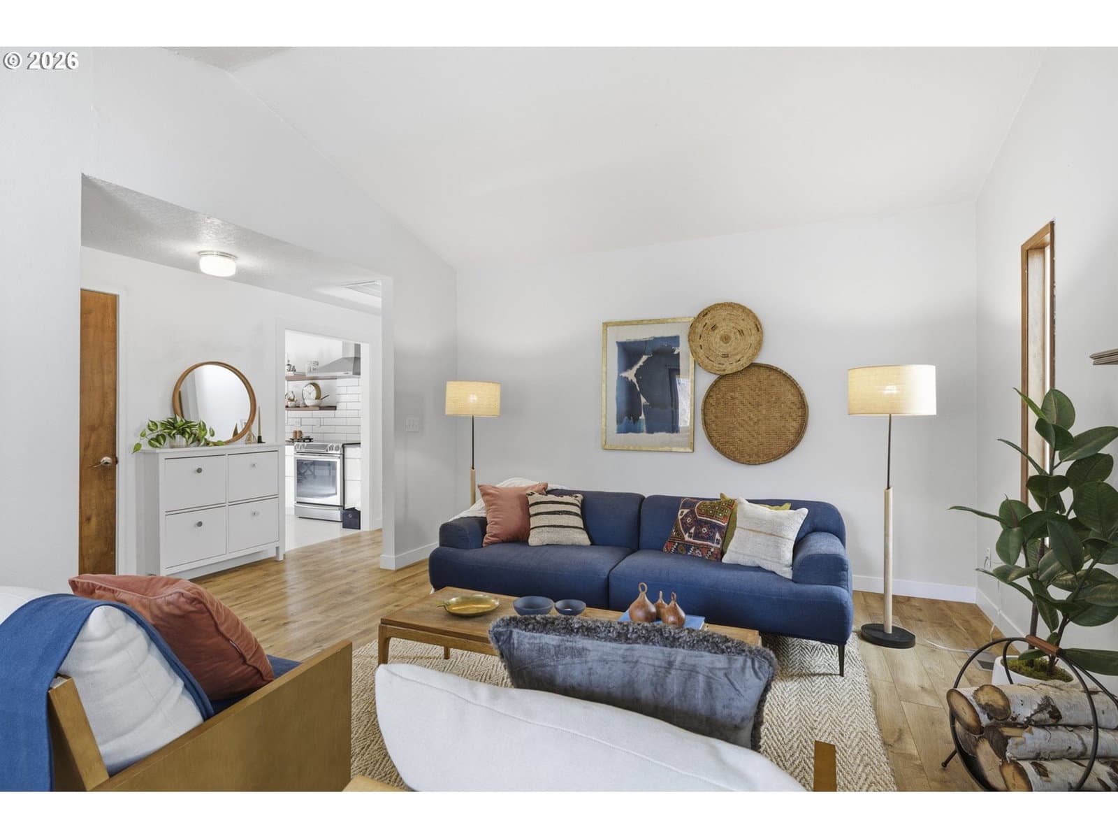This thoughtfully updated 1979 ranch blends classic one-level living with standout curb appeal and modern upgrades. The home welcomes you with a charming front deck, beautifully planted yard, and a unique vestibule-style entry that sets it apart. Inside, the spacious living room features vaulted ceilings and a wood-burning fireplace, creating a warm and inviting space filled with natural light. The home offers 3 bedrooms and 2 bathrooms, including an ensuite primary, all on a highly accessible single level—ideal for easy, everyday living. The beautifully updated kitchen opens seamlessly to the light and bright dining area, where French doors lead to the back deck, creating a natural flow for entertaining or enjoying the private backyard. Fun architectural windows throughout bring in great natural light and add character you don’t often find in a ranch-style home. Major updates include vinyl windows, a new roof (2023), new HVAC system (2024), and fresh exterior paint (2023), providing both comfort and peace of mind. Additional features include a high crawlspace, two-car garage, and multiple outdoor living spaces with both front and back decks. Located just blocks from Dickinson Park and nearby walking trails, fresh air becomes part of the daily routine. With excellent proximity to Washington Square, Multnomah Village, Gabriel Park, and easy access to I-5, this home offers the perfect balance of quiet neighborhood living, everyday convenience, and commuter access. [Home Energy Score = 4. HES Report at https://rpt.greenbuildingregistry.com/hes/OR10105859]