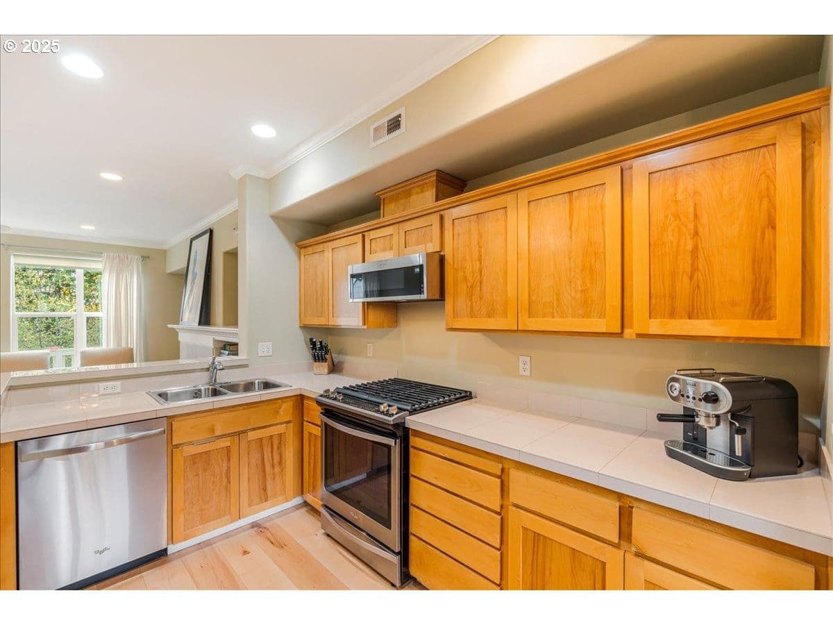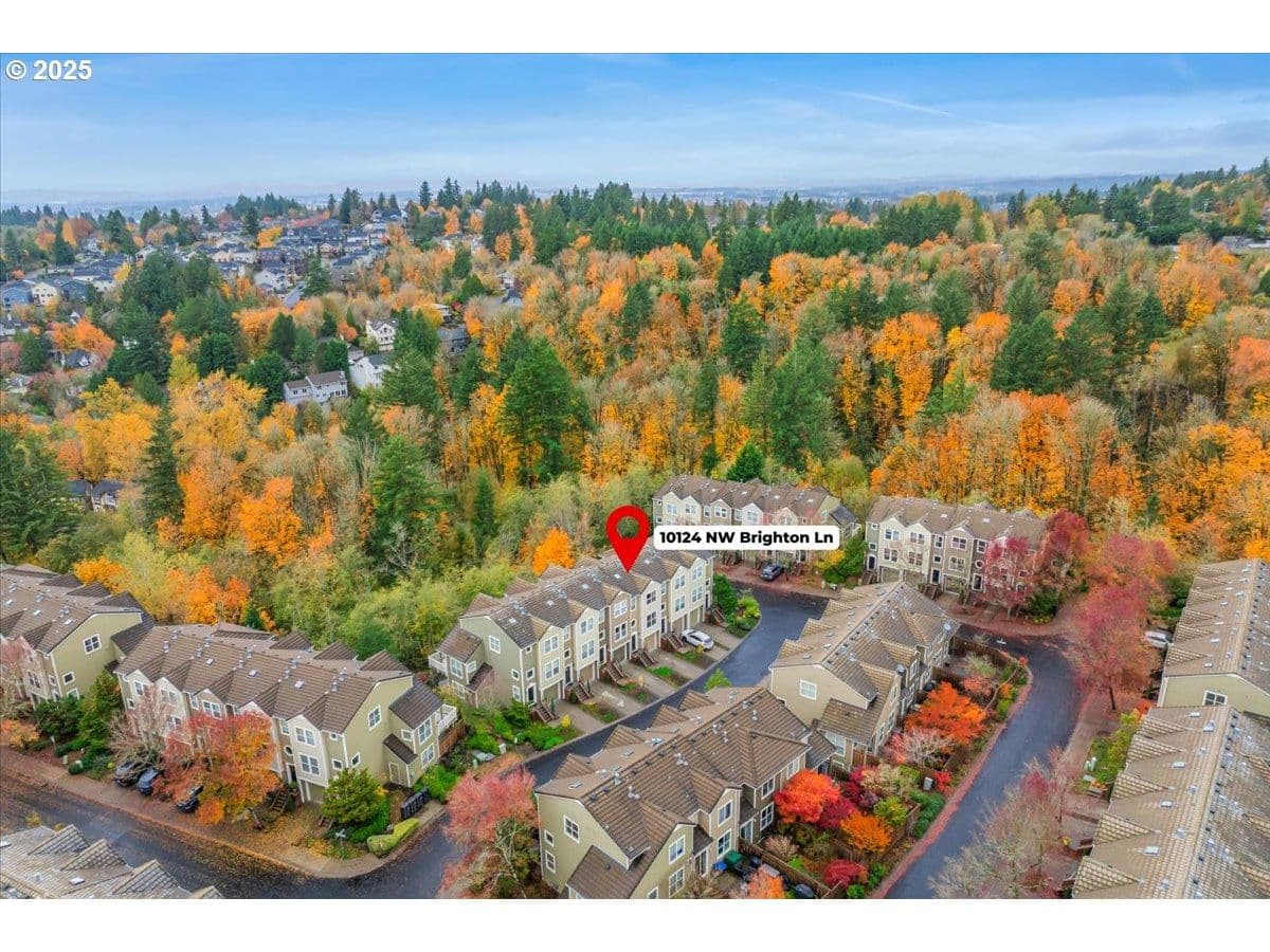 Nestled in a serene greenbelt setting, this elegant townhome offers the perfect blend of comfort, quality and style. With an ideal layout that seamlessly flows across three levels, the home is designed to take full advantage of its beautiful surroundings, including expansive views of greenspace and sunsets. The main floor is an entertainer's dream, showcasing extensive engineered maple hardwood floors throughout. The bright and airy living room offers a balcony overlooking the greenspace, while the gas fireplace adds warmth and ambiance. High ceilings and built-in bookcases add character and functionality to the space. The spacious kitchen boasts hardwood floors, modern appliances, including a gas range and freestanding refrigerator, tile counters and backsplash, light wood cabinetry, and flows seamlessly into a formal dining area. The upper-level primary bedroom is a true retreat, featuring hardwood floors, a walk-in closet, full bath, and stunning sunset views. The second bedroom upstairs is thoughtfully designed with hardwood floors, its own walk-in closet and easy access to the hall bath, providing privacy and convenience for family or guests. The versatile lower level is a private 3rd bedroom, office or family room and includes hardwood floors, a full bath, large walk-in closet, and sliding door to a private patio, perfect for relaxing or entertaining while enjoying the peaceful view of the greenspace. Whether you need a third bedroom, home office, or cozy family room, this space offers endless possibilities. Upgrades and updates include high quality wool carpeting on stairs, new engineered maple hardwoods throughout every level, new trim, and fresh paint, ensuring that every detail of this home feels both timeless and move-in ready. Location! Forest Heights offers picturesque walking trails, a park with a lake, a merchant center with coffee shop, pizza, and other services. All this while minutes to downtown, hospitals, Nike and Intel! [Home Energy Score = 9. HES Report at https://rpt.greenbuildingregistry.com/hes/OR10241753]