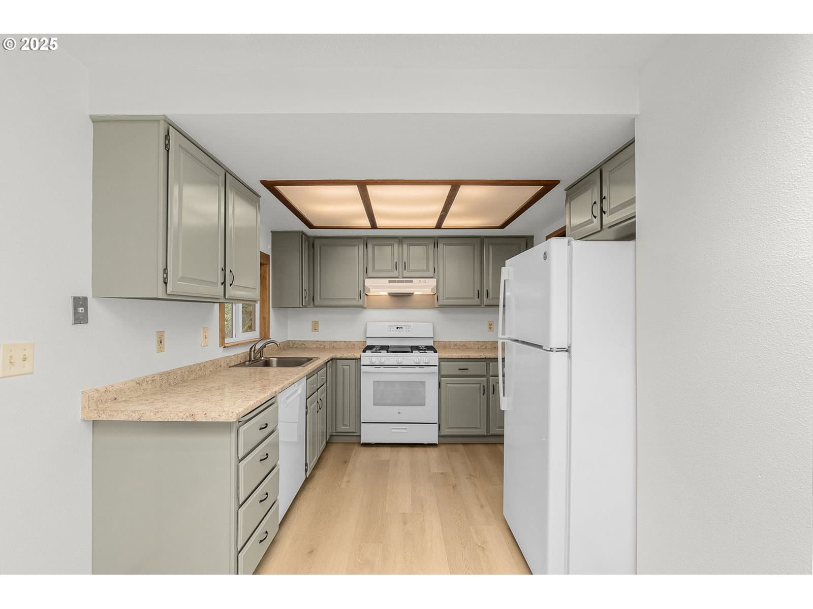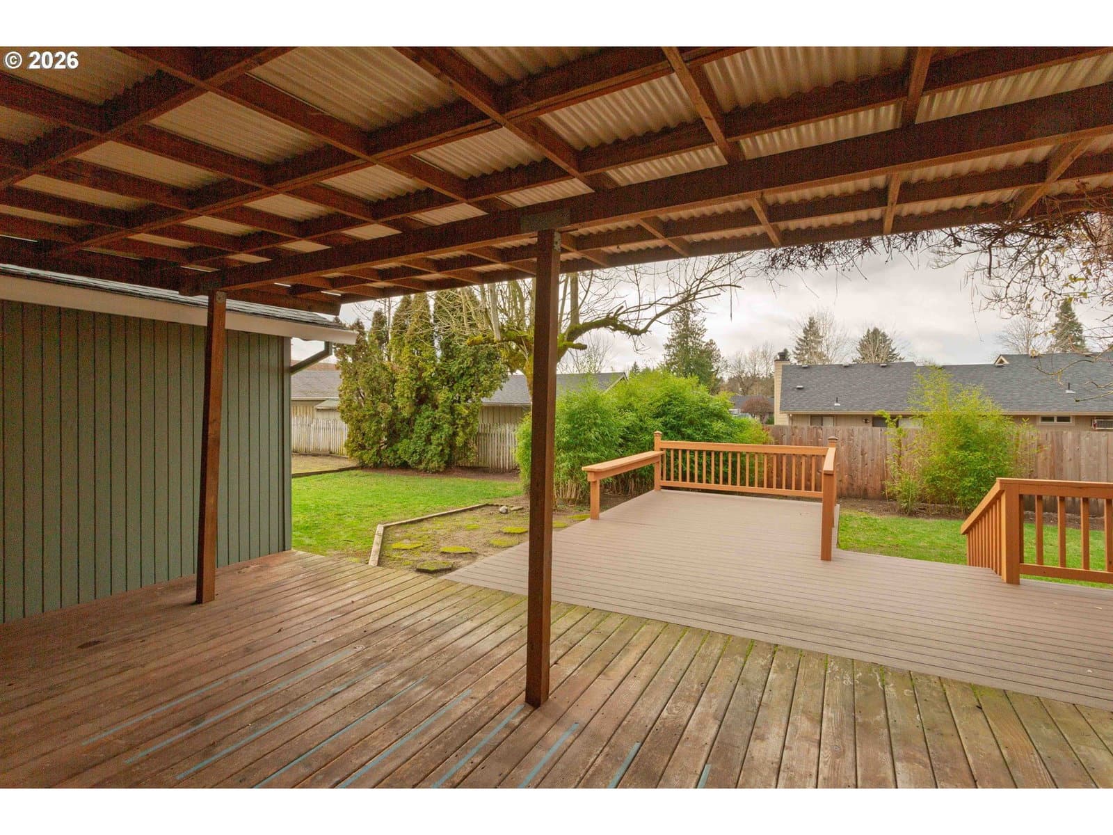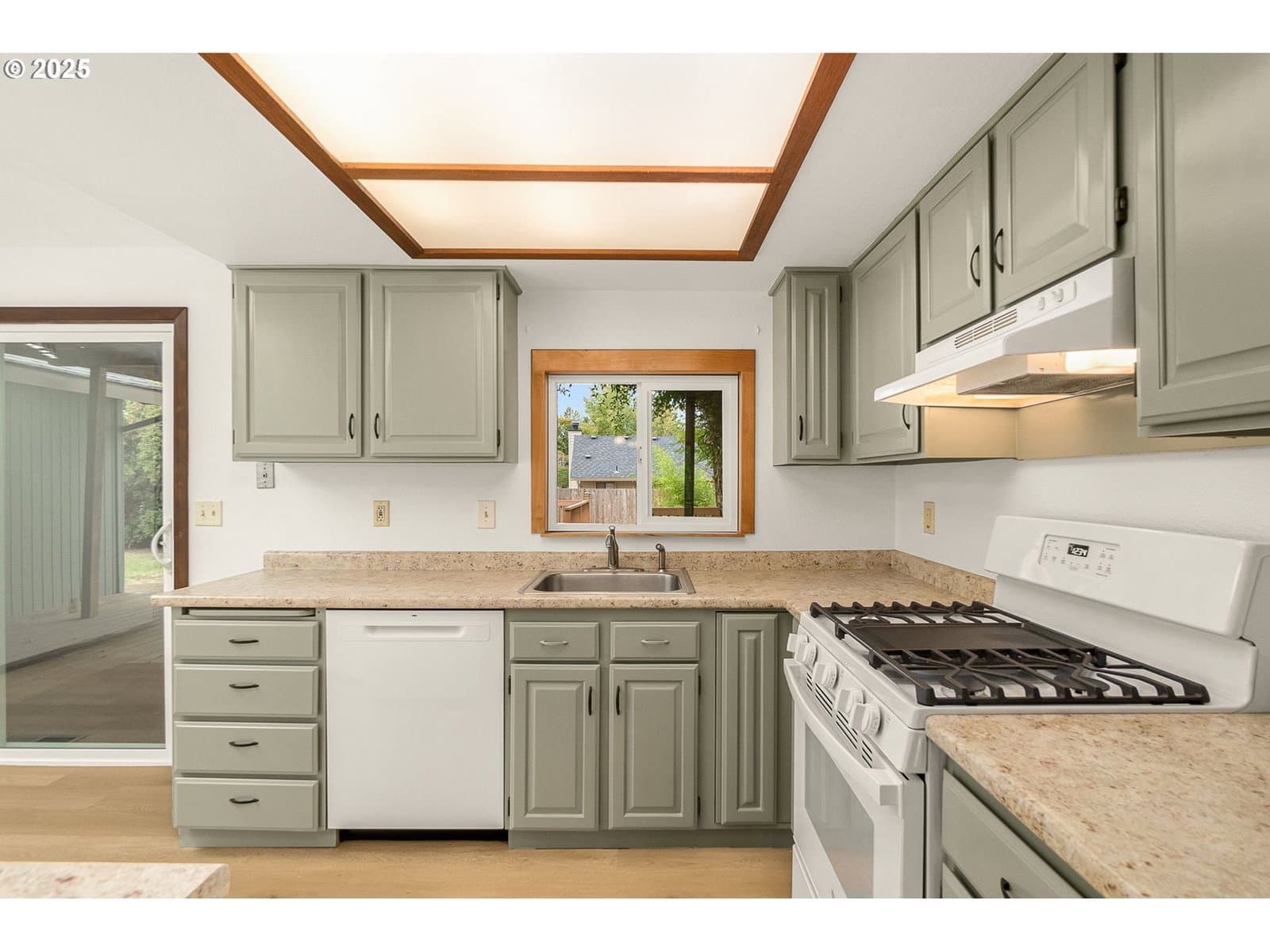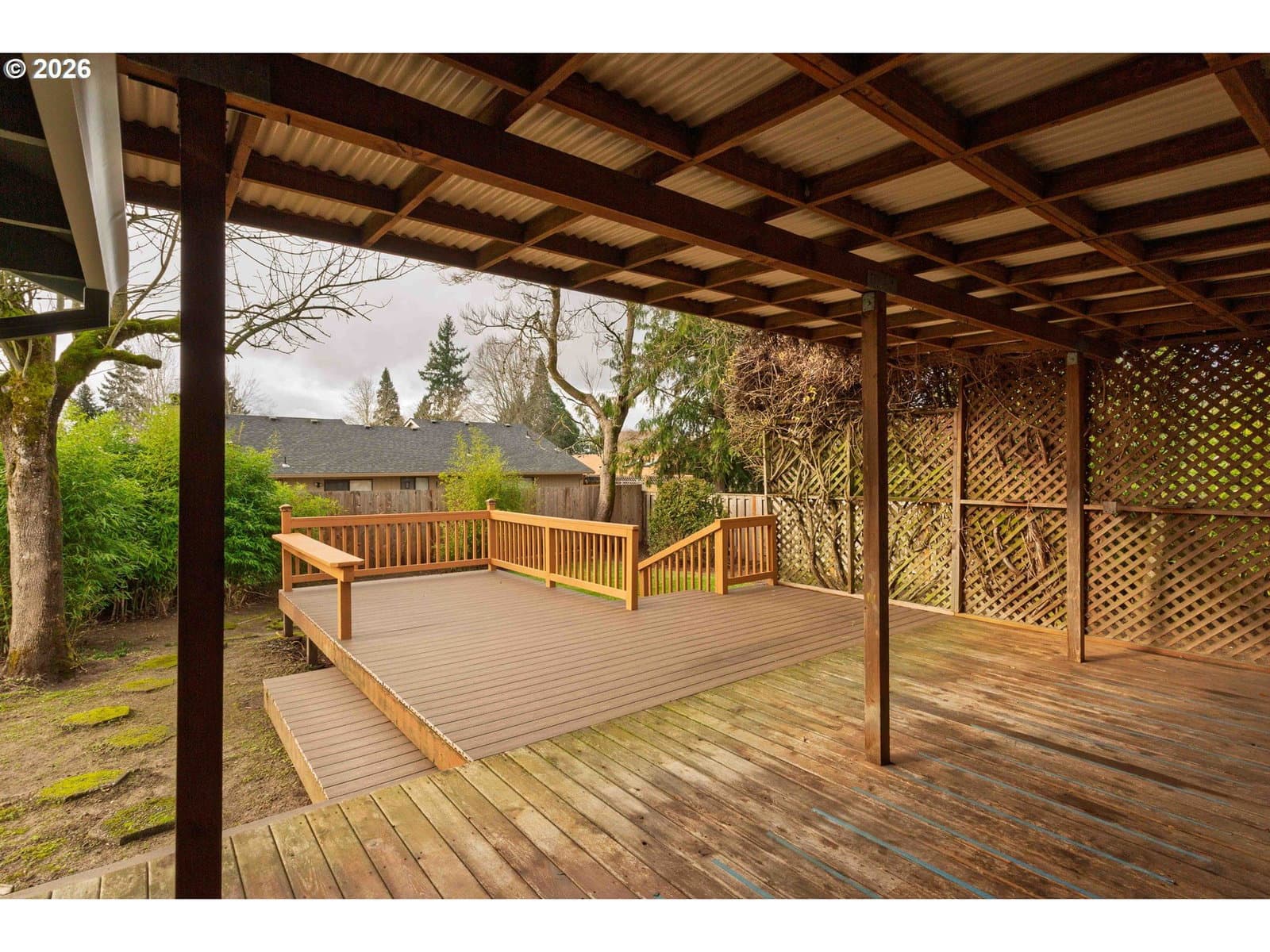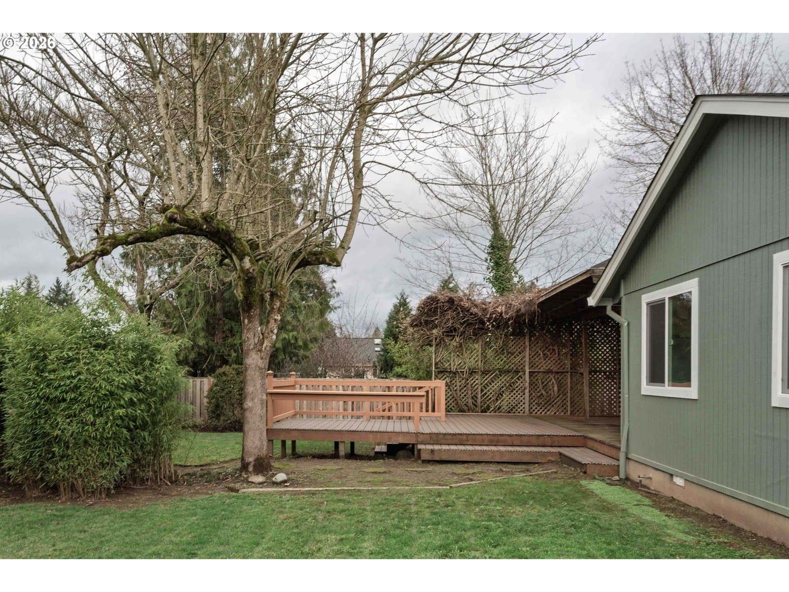Move-in ready ranch style home on spacious .30 acre lot. Room for all your toys with an RV parking pad with 30amp outlet and water. New LVP throughout plus fresh interior/exterior paint. New Milgard picture windows and a newer sliding door. LED lights and skylights make this home light and bright. Primary bedroom with spacious walk-in closet and updated ensuite. Vaulted ceiling in family room plus a new ceiling fan and new gas fireplace make this space comfortable and cozy. Fully fenced yard and a wood/Timbertech partially covered deck provide plenty of room for year round outdoor entertaining. Proximity to schools, downtown Tigard, Costco and other shops and restaurants. Proximity to public transportation. Possibility to build larger home or multiple units. Buyer to perform due diligence. Washer/Dryer included. New dishwasher and new range. Home warranty included with purchase. This sale may be part of a 1031 exchange.