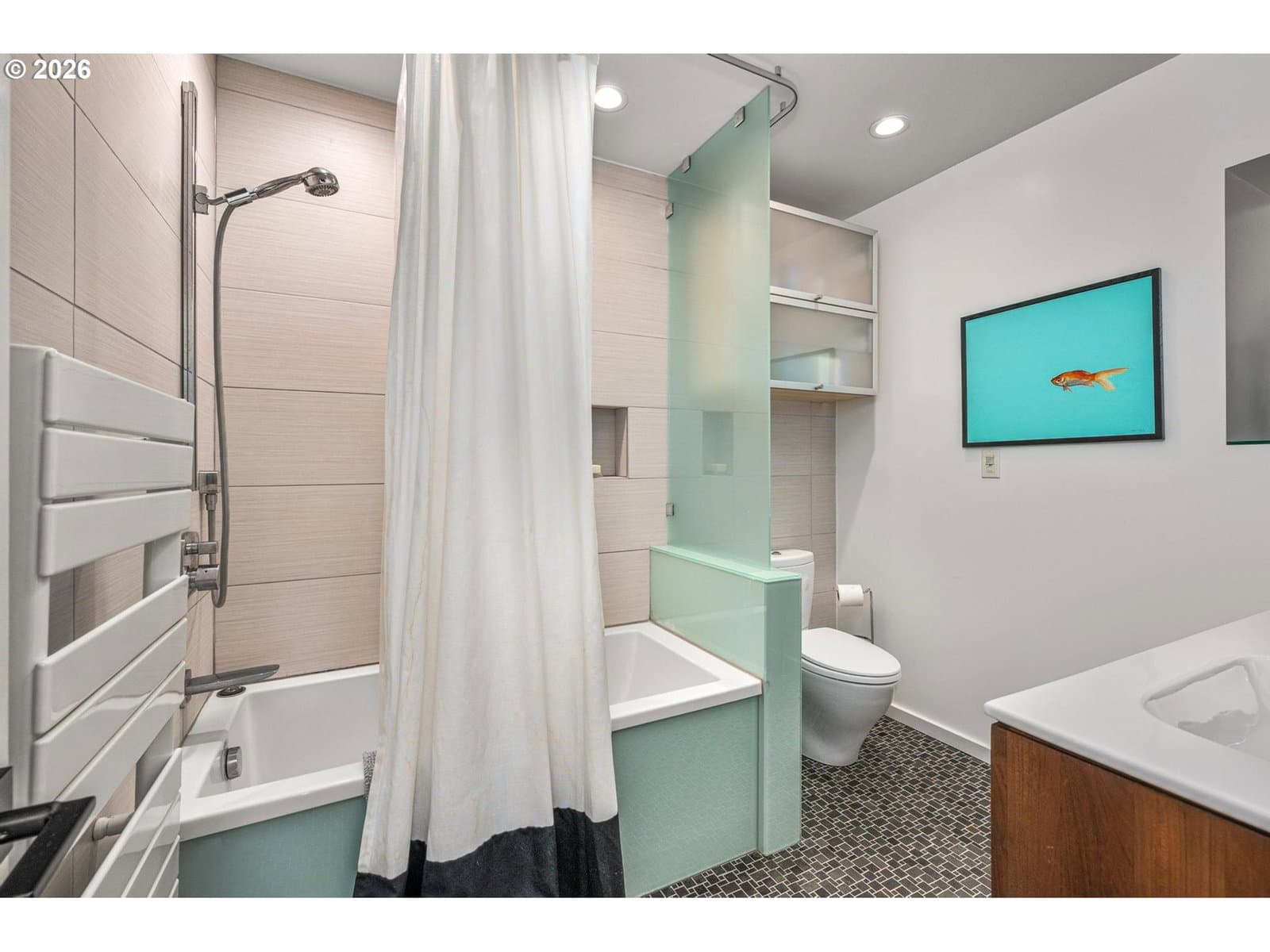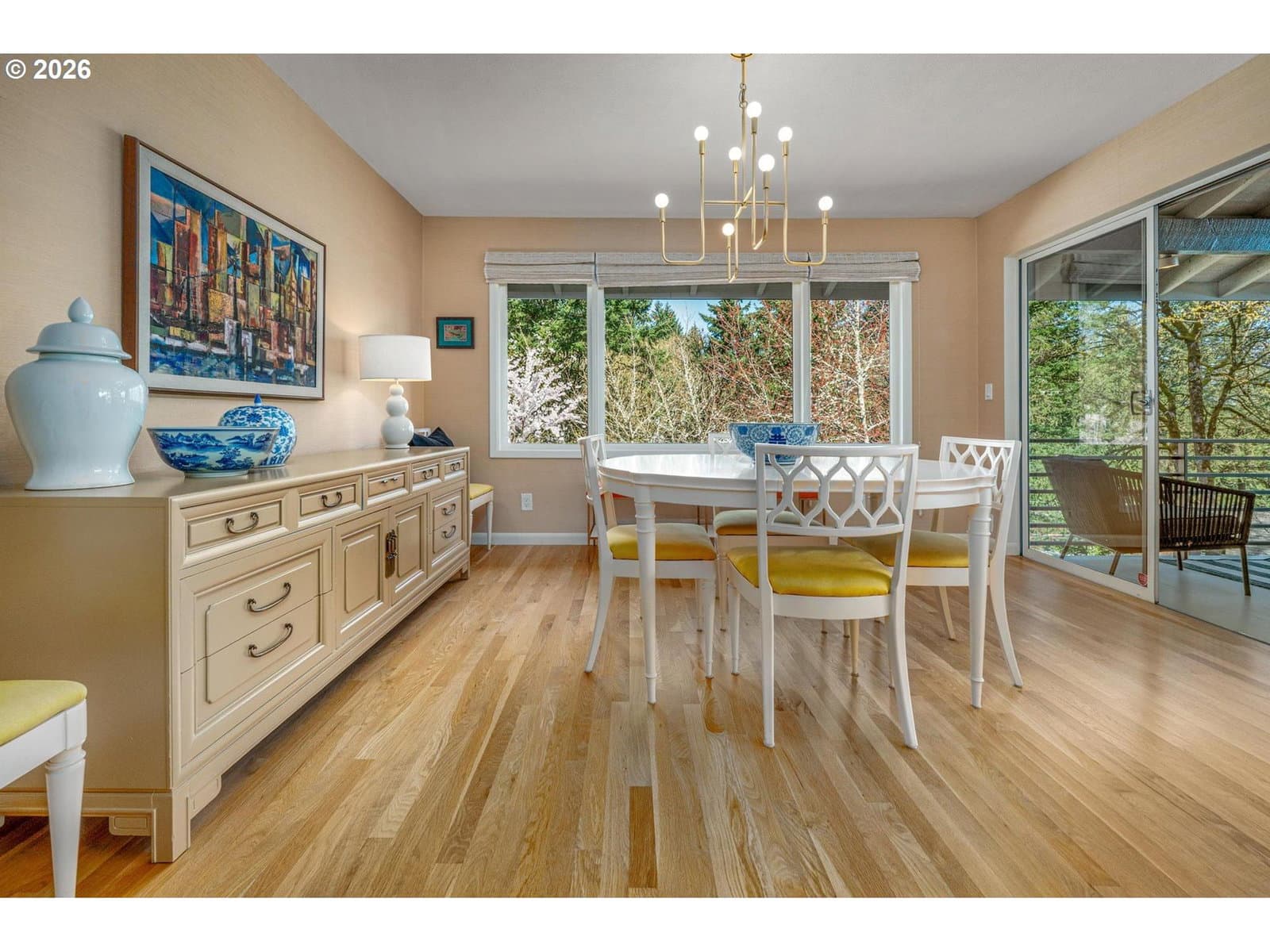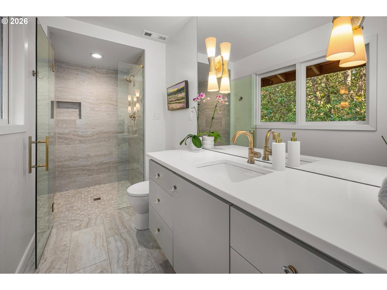 Perched atop its own long, private driveway on an oversized lot, this fully remodeled mid-century home in Portland’s prestigious West Hills offers panoramic Mount Hood views from all three levels. Just minutes to downtown and OHSU—and surrounded by scenic SW Hills hiking trails—this is urban living wrapped in natural beauty and privacy.Inside, light-filled spaces highlight timeless finishes, an open kitchen-living concept, and a spacious lofted family room. The main home features 3 generous bedrooms and 2.5 baths, plus a bonus office or workout room just off the garage. The lower level offers a spacious two-bedroom, one-bath apartment with a private entrance—ideal for guests, extended family, or income potential.Multiple outdoor seating areas and covered patios create seamless indoor-outdoor living, making this one-of-a-kind property a true sanctuary in one of Portland’s most sought-after neighborhoods.