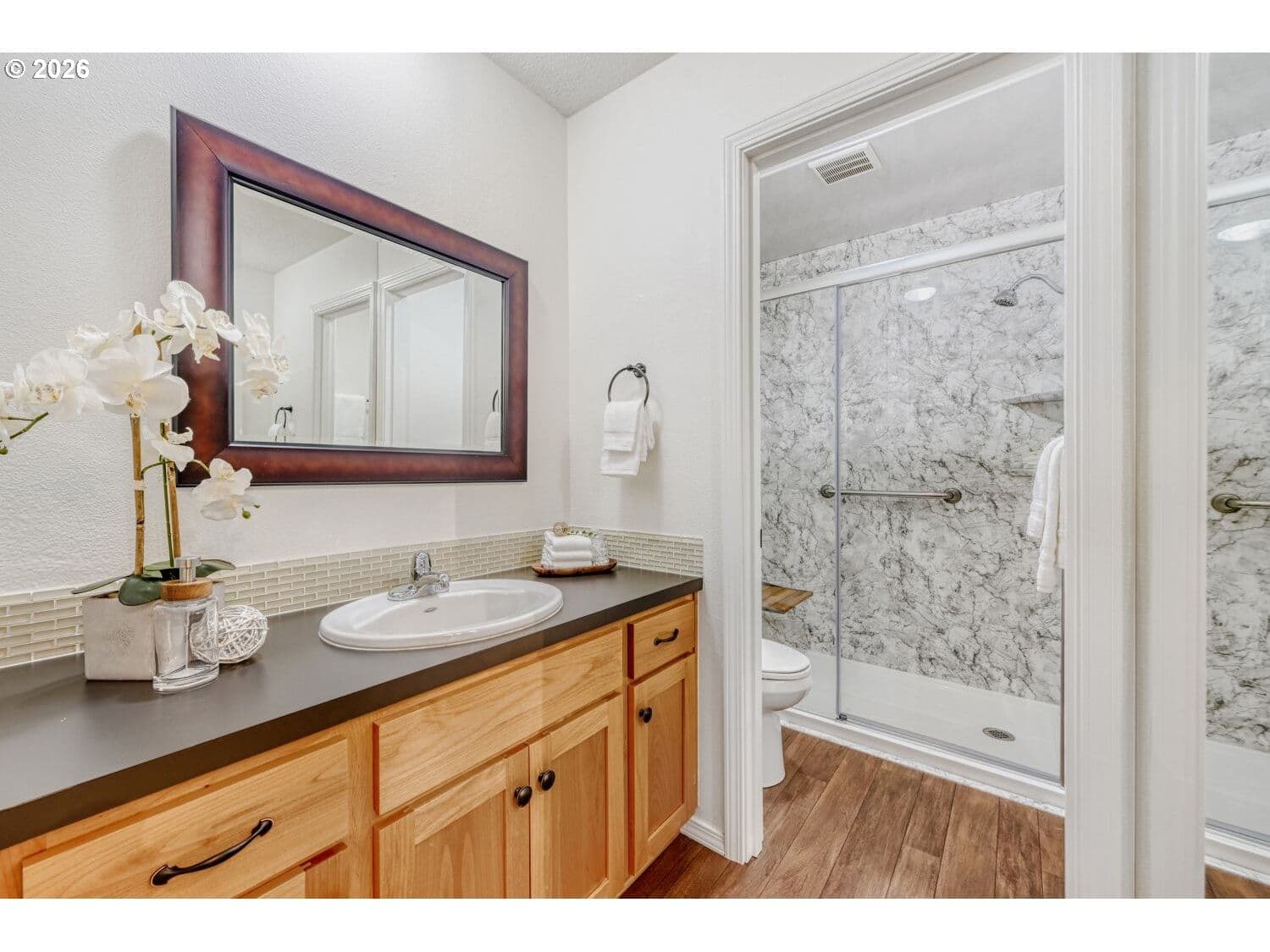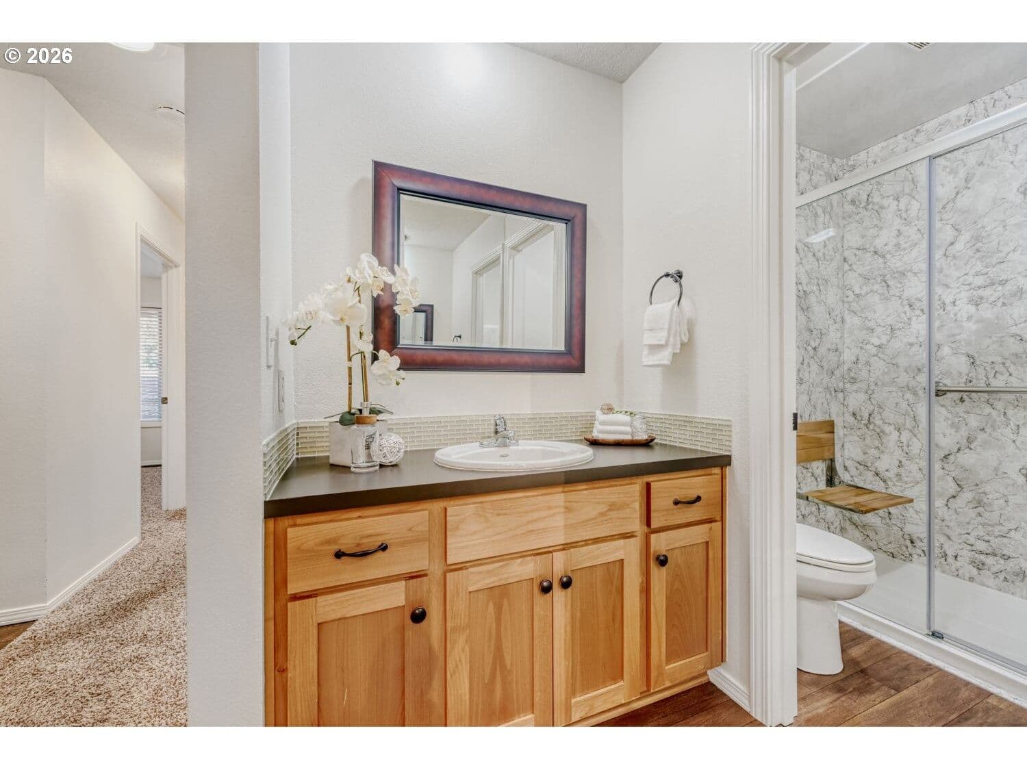 Offer received, offer deadline: Monday, 3/2 at 10AM. Gorgeous turnkey ranch in desirable Hartwood Hylands neighborhood! Situated on a peaceful loop street, this northwest contemporary has been immaculately maintained and fully updated. Gourmet kitchen offers shaker-style cabinets, quartz countertops, full-height tile backsplash, stainless steel appliances, and dining nook. It's open to the vaulted family room, featuring a floor-to-ceiling two-way stone fireplace and built-ins. Oversized primary suite offers double closets and an updated bathroom with new walk-in shower. High-quality construction including vaulted ceilings with exposed beams, large room sizes, and abundant window space for great natural light. Numerous updates including white doors and millwork, all-new interior paint, updated fixtures and hardware, and more! Fully fenced backyard boasts large patio, tool shed, mature landscaping, and exceptional privacy. Outstanding location, just steps from numerous THPRD parks and trails!