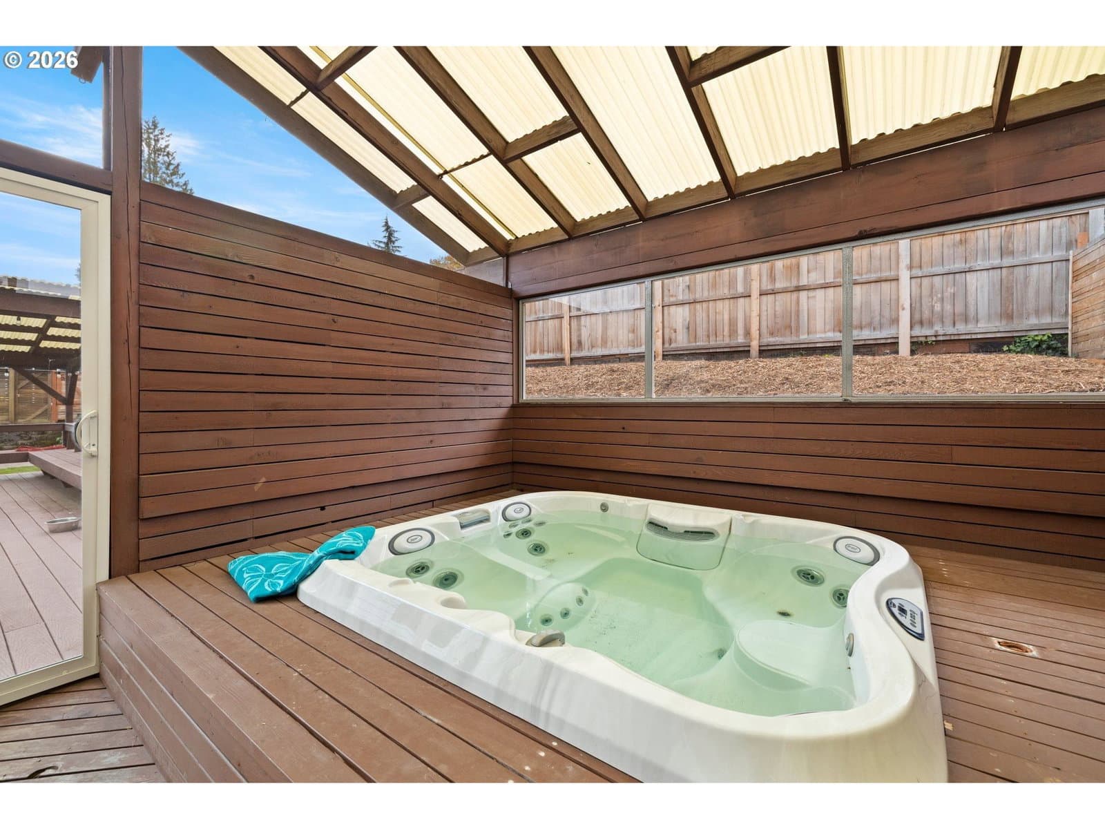 This 1955 classic offers true one level living with a lower level for recreation, hobbies, play area and storage. Clean lines,expansive windows and gentle updating make this South Burlingame home easy to love. Generous east-facing living and dining areas capture morning light and frame a peek-a-view of Mt. Hood, with custom remote-controlled blinds for effortless privacy. The kitchen features solid-surface countertops, stainless steel appliances, abundant workspace, and a casual dining nook. The primary suite includes double closets and an ensuite bath with direct access to a private, enclosed hot tub—also reachable from the backyard deck. Two additional main-level bedrooms provide excellent space for sleeping, work, or play. Extensive updates include new Andersen Fibrex double-pane windows with custom hardwood trim throughout the main level, fresh interior and exterior paint, and an upgraded laundry room with new marmoleum flooring, washer/dryer, and generous storage. The private backyard is designed for year-round enjoyment, offering a covered deck, sunny patio, and terraced garden—ideal for gardening, entertaining, or quiet relaxation. The lower level retains original mid-century flooring and offers flexible, open spaces. The family room, complete with a wood-burning fireplace, is perfect for a home theater, library, or media space. A large adjacent flex room (10' x 31') will accommodates exercise equipment, hobbies, or just additional living area. This level also includes an office, a spacious mechanical/storage/workshop room, an additional storage room, and a half bath. All this is within a short distance to shopping, parks, Tryon Creek State Natural Area, Willamette Park and Boat Ramp, Lewis & Clark College/School, major hospitals, and abundant eateries. Less than 5 miles to downtown Portland, with easy access for westside commutes. This property has the rare combination of quality, location,and versatility. It's move-in ready and designed for modern living. [Home Energy Score = 3. HES Report at https://rpt.greenbuildingregistry.com/hes/OR10226313] TRYON CREEK STATE NATURAL AREA:1.9 MILES; WILLAMETTE PARK/BOAT RAMP:0.9 MILES; HOSPITALS:2.2 MILES TO WATERFRONT OR PILL HILL; GROCERIES:1 MILE; DOWNTOWN PDX:<5 MILES; REVERSE COMMUTE TO WEST SIDE EMPLOYERS.