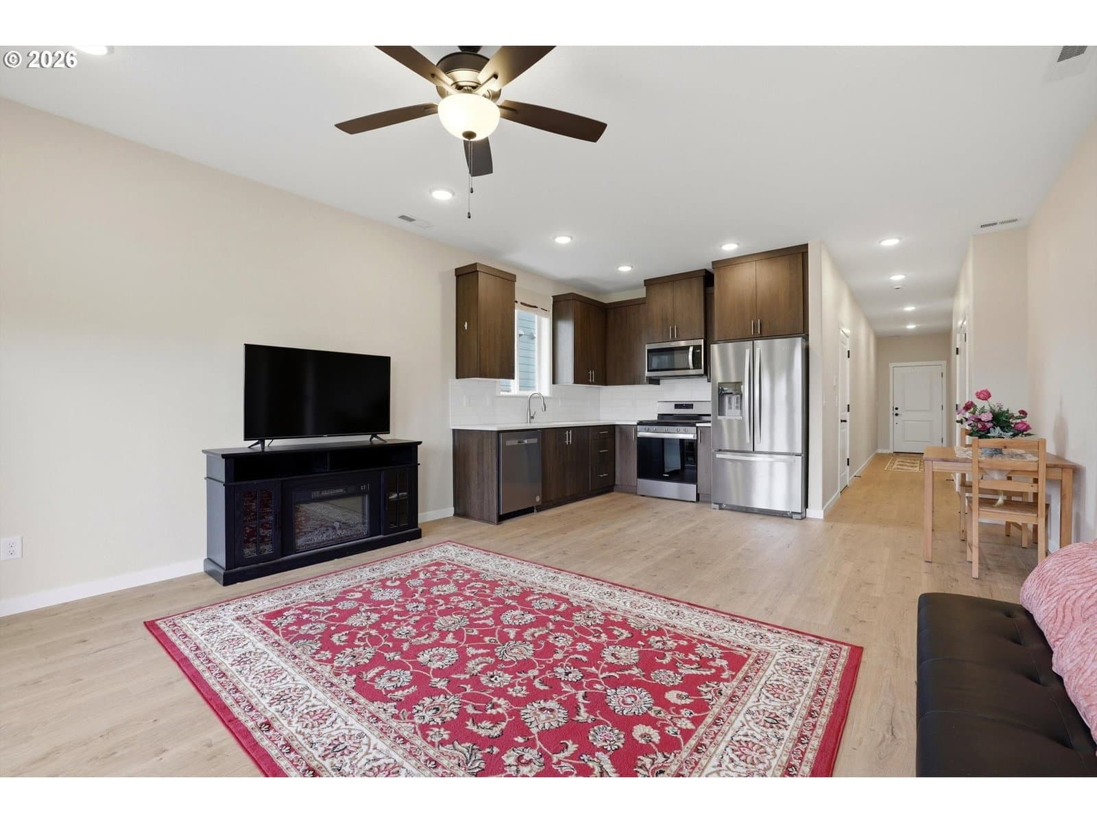 This less than 3 year old Craftsman style 3 bedroom, 2 full bath single level home is move in ready and in like new condition. Stone accents and front porch. 9 foot ceilings, wood floors in hallway, great room and kitchen. Stainless steel appliances (dishwasher, built-in microwave, 5 burner gas range and refrigerator), ceiling fan and slider to patio and fenced back yard. Quartz counters in kitchen and bathrooms. Primary bedroom has ceiling fan, double sinks and walk-in shower. Heat pump offers heating and cooling for your comfort year round. Includes washer & dryer. Single car garage includes EV charger. Tankless hot water heater