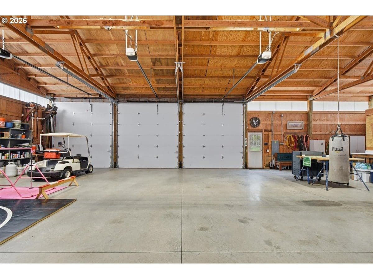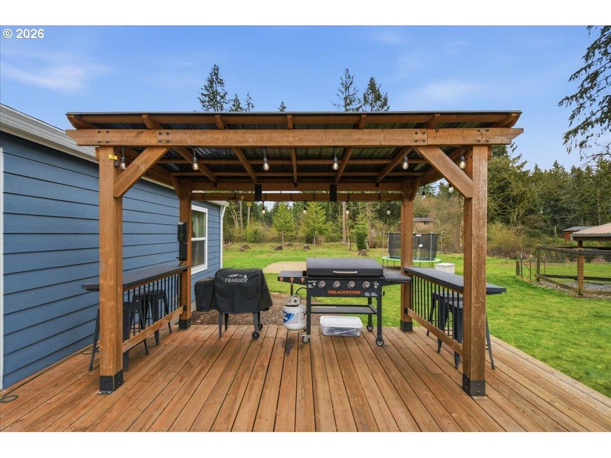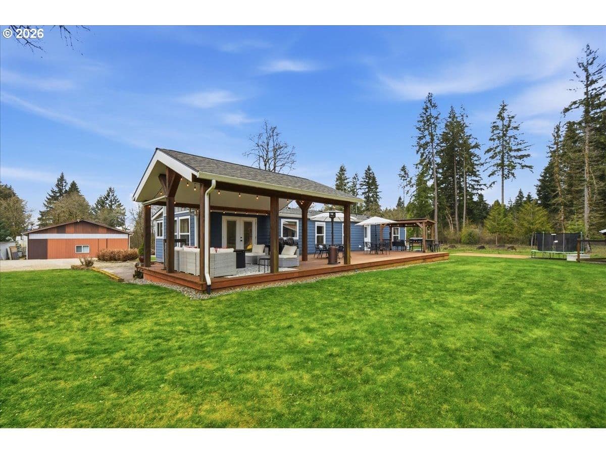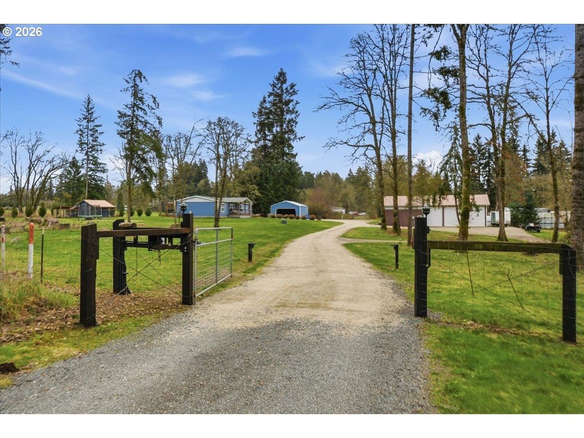 Ridgefield Private Acreage+Huge Shop!1876 SF Home on 4 private acres in sought-after Ridgefield location. Remodeled and updated throughout. Open bright and light vaulted living room with LVP flooring, Wood-stove. Office area. Updated kitchen has NEW custom cabinets, center island, Stainless appliances,Formal dining room with French doors leading to oversized covered patio. Spacious primary suite has double closets, soaking tub in primary bath. Property features 2160 SF detached shop, oversized doors, guest bedroom, plus a detached two car garage, chicken coop, Gated entrance, fenced flat 4 acre. Located in highly desirable Ridgefield School District. Plenty of space for hobbies, storage, or home business.